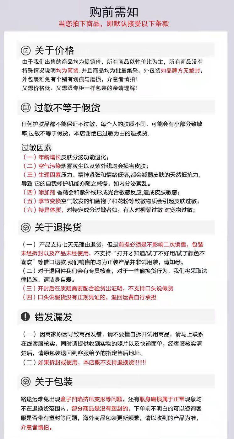 在不影响二次销售的情况下支持7天,非质量问题退回运费自理,如产品收到有破损/漏液,请在签收后48小时内拍照联系客服处理(无照片不售后)。拆封后不支持退换。当地疫情管控慎拍!退换货赠品需要一起寄回。