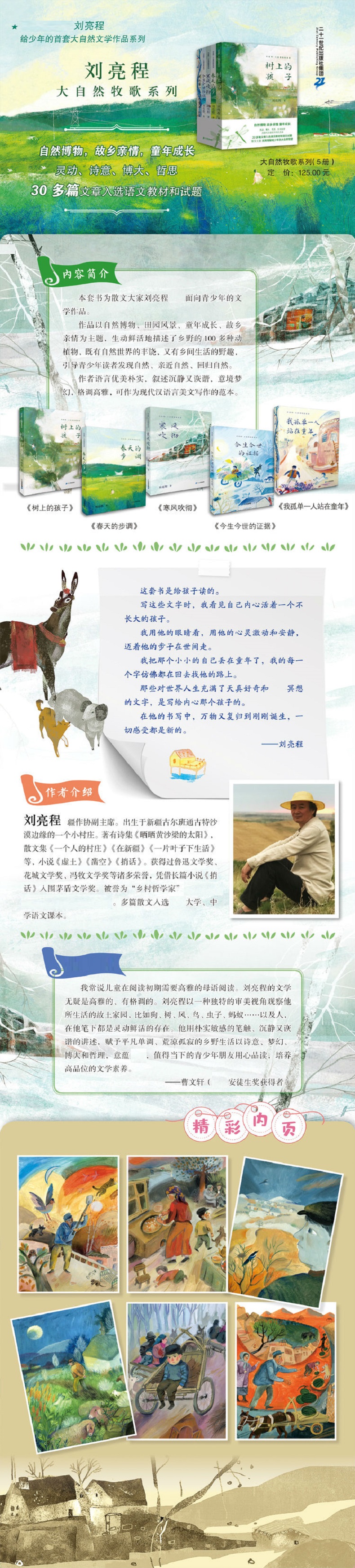 本套书为鲁迅文学奖得主、茅盾文学奖入围者刘亮程面向青少年的文学作品,共计五册。作品以自然博物、田园风景、童年成长、故乡亲情为主题,生动鲜活地描述了乡野的100多种动植物,既有自然世界的丰饶,又有乡间生活的野趣,引导青少年读者发现自然、亲近自然、回归自然。作者语言优美朴实,叙述沉静又诙谐,意境梦幻,格调高雅,可作为现代汉语言美文写作的范本。