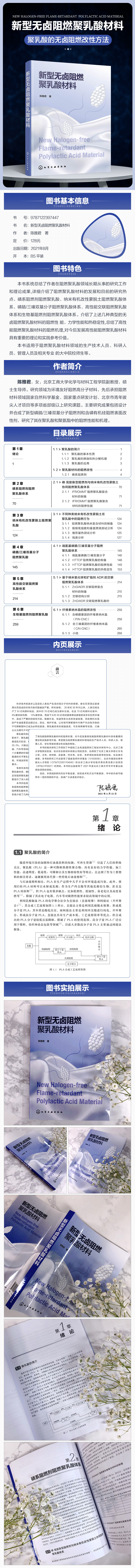 本书共包括6章内容,分别介绍了阻燃聚乳酸材料的发展和目前的研究热点、磷系阻燃剂阻燃聚乳酸体系、纳米有机改性蒙脱土阻燃聚乳酸体系、磷腈/三嗪双基分子阻燃聚乳酸体系、高性能交联阻燃聚乳酸体系和生物基阻燃剂阻燃聚乳酸体系。本书系统介绍了几种典型的无卤阻燃聚乳酸材料的阻燃性能、力学性能和热稳定性,总结了高性能阻燃聚乳酸材料的阻燃机理,对今后发展高性能阻燃聚乳酸材料具有重要的理论和实践参考价值,希望能为阻燃聚乳酸材料领域的生产技术人员、科研人员、管理人员、学生等提供理论和实践的帮助。