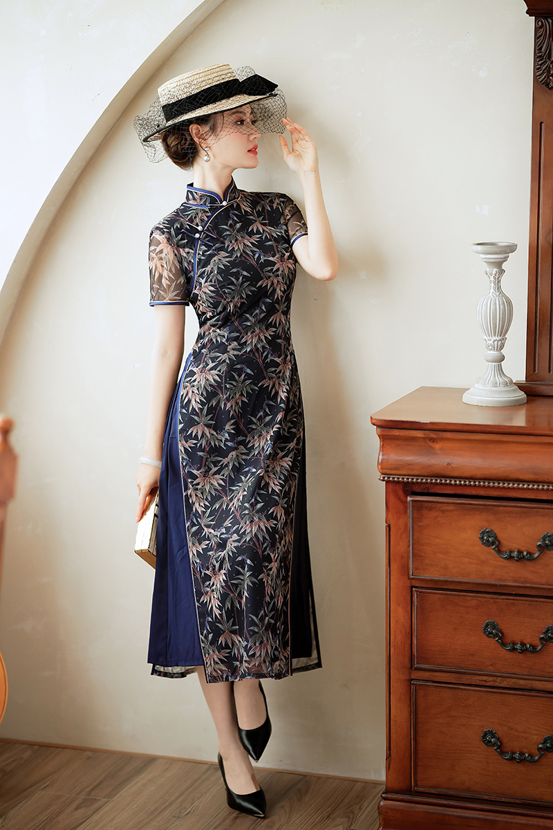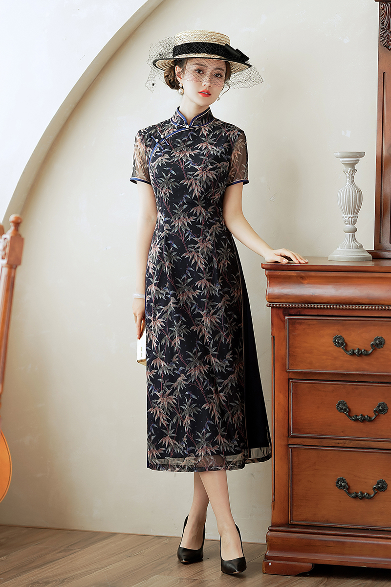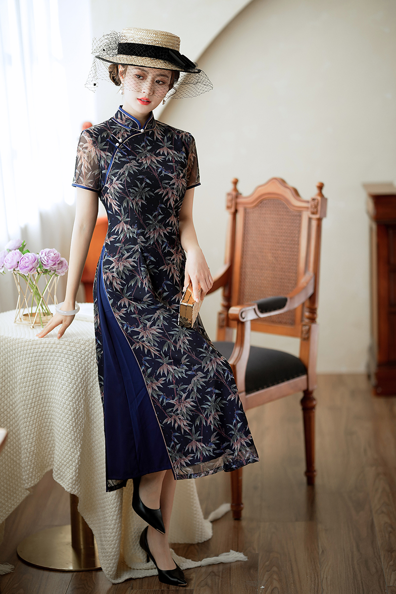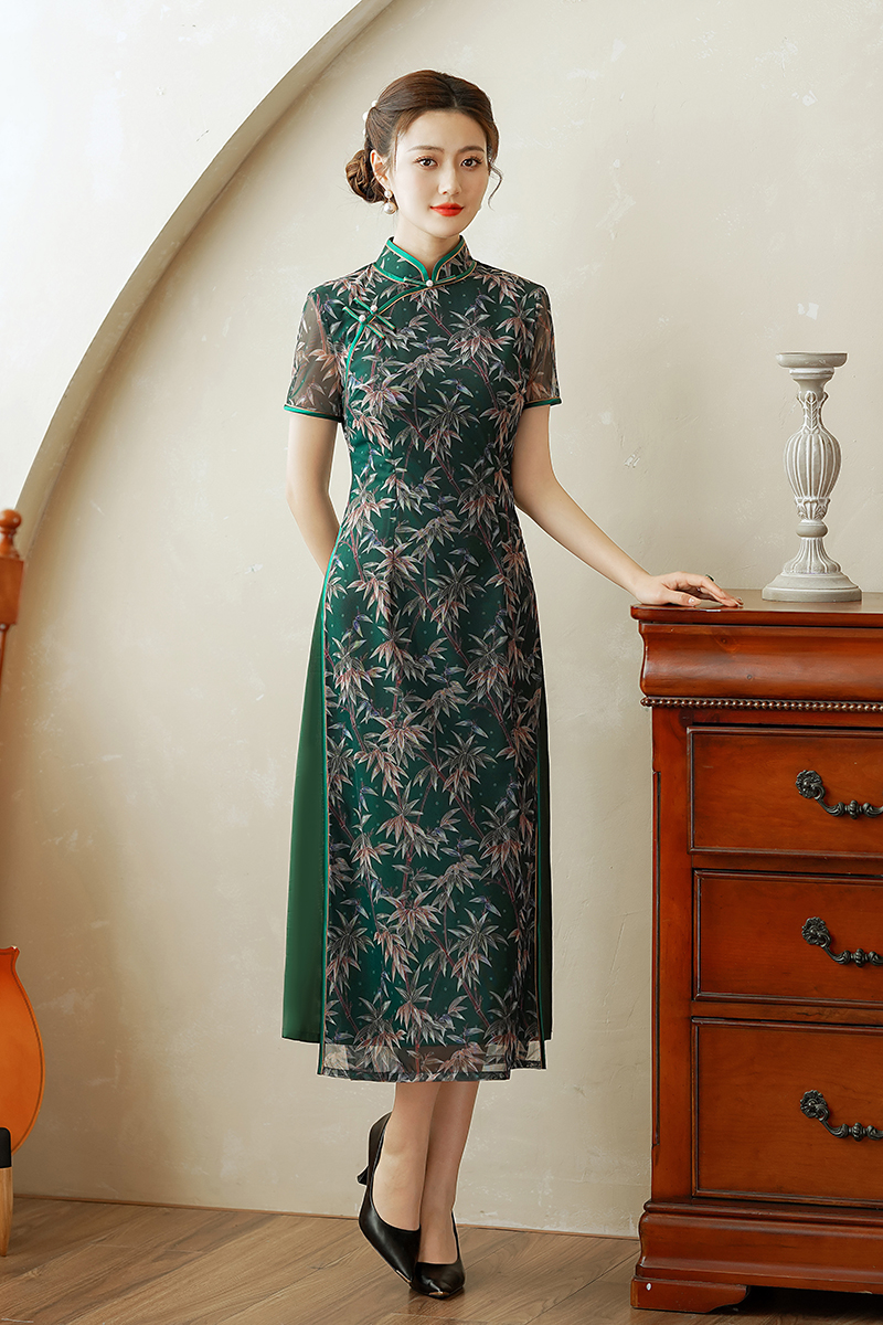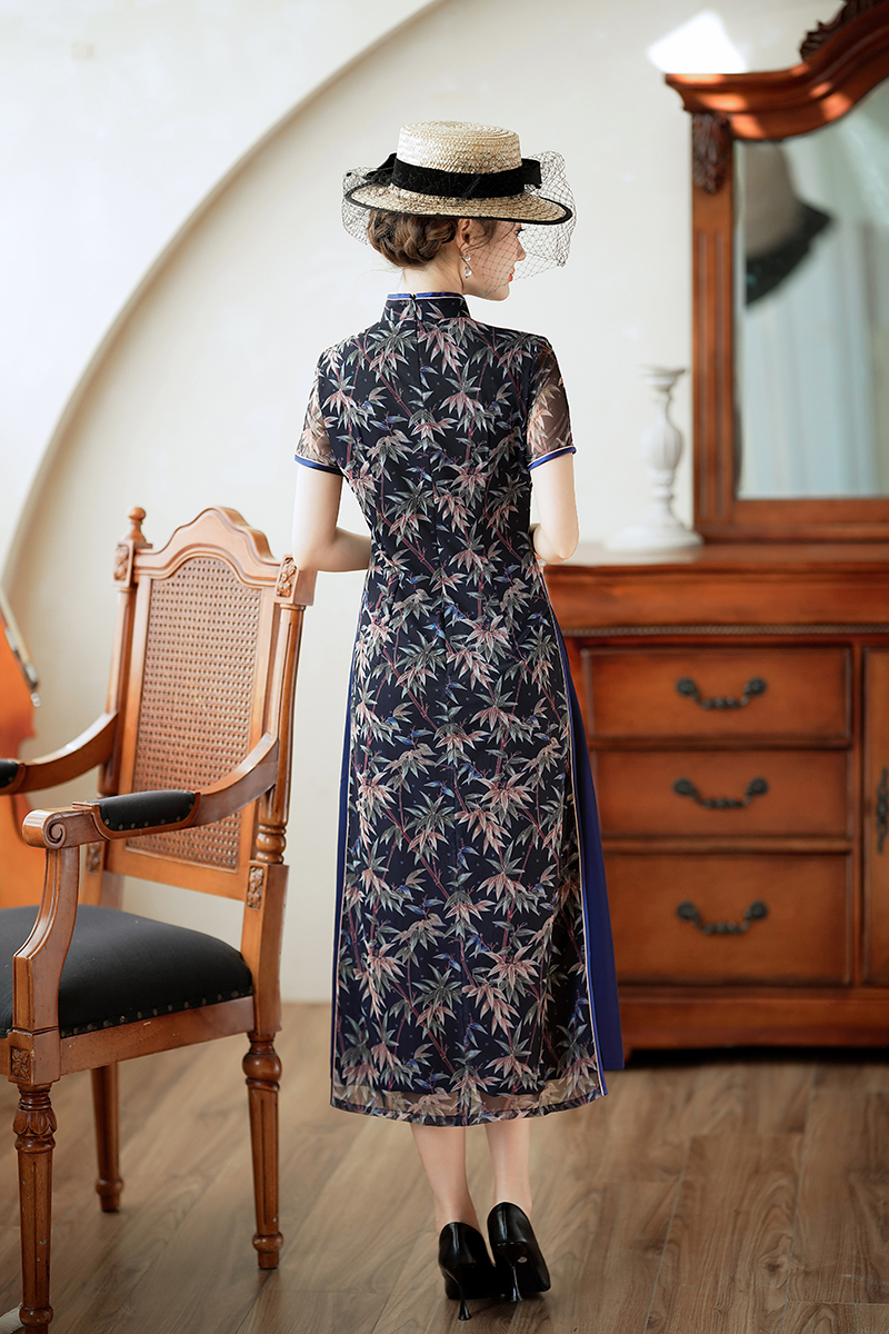 奥黛长款改良气质显瘦旗袍网纱连衣裙TQX171525