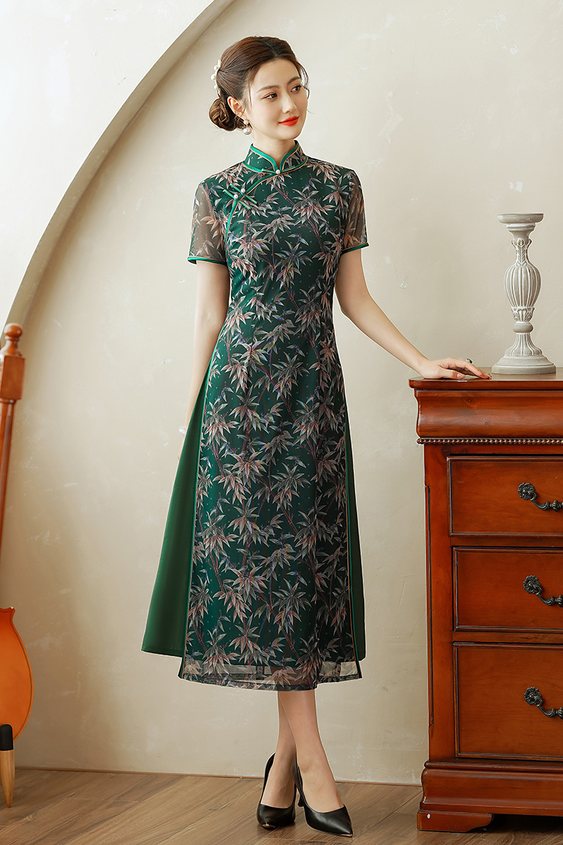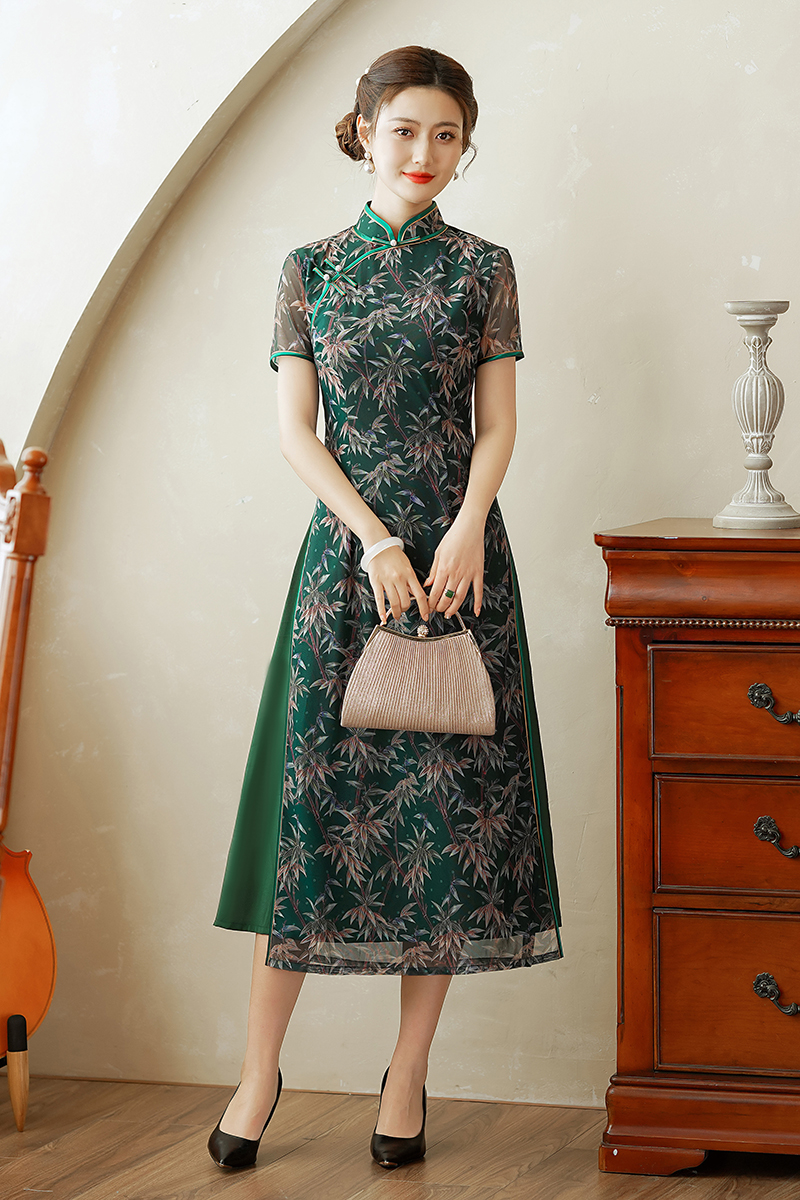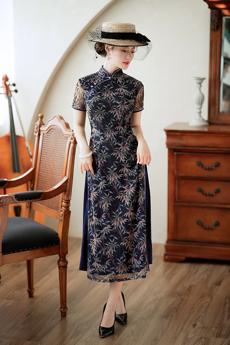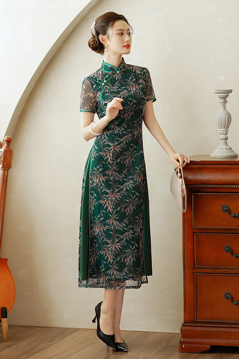 奥黛长款改良气质显瘦旗袍网纱连衣裙TQX171525