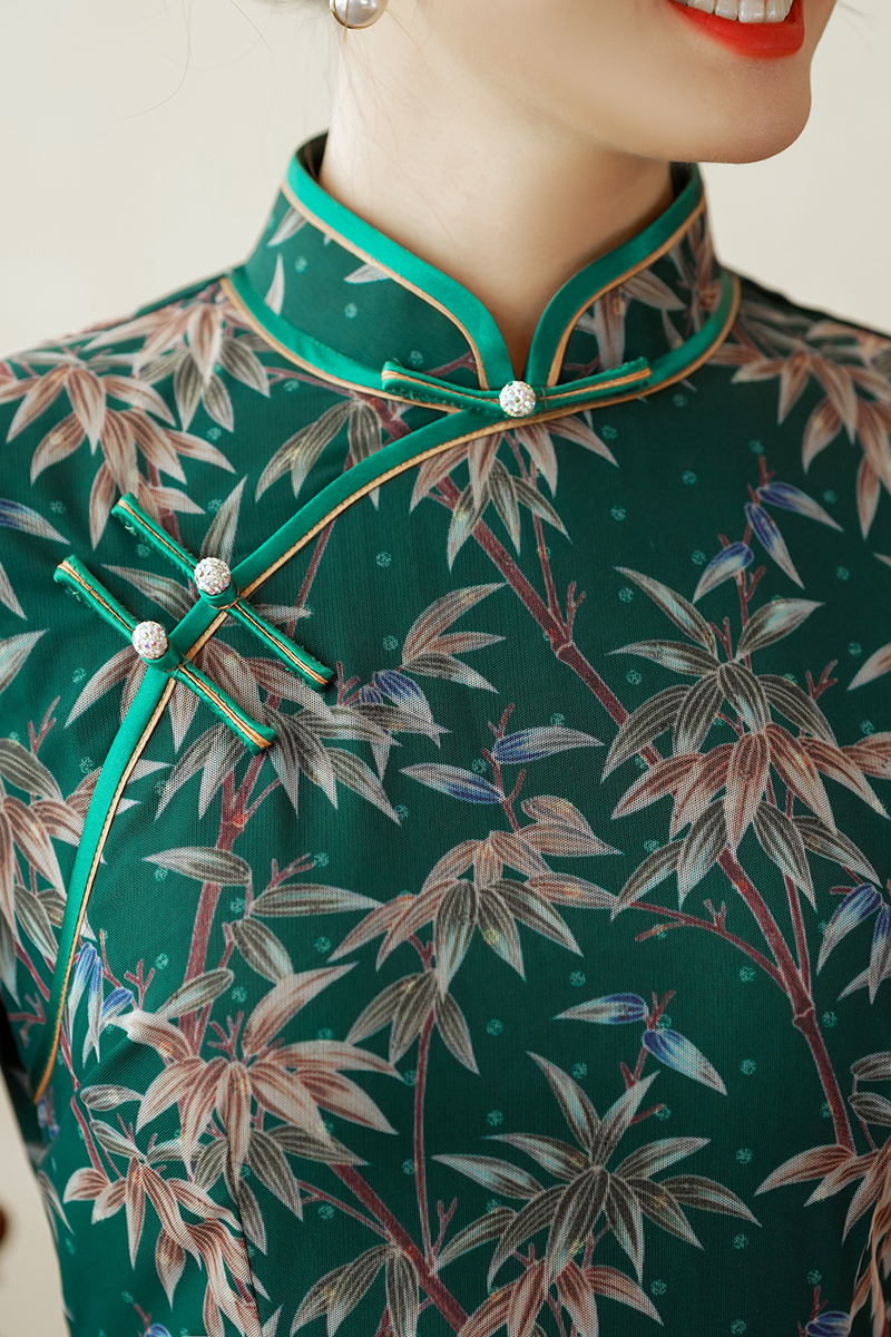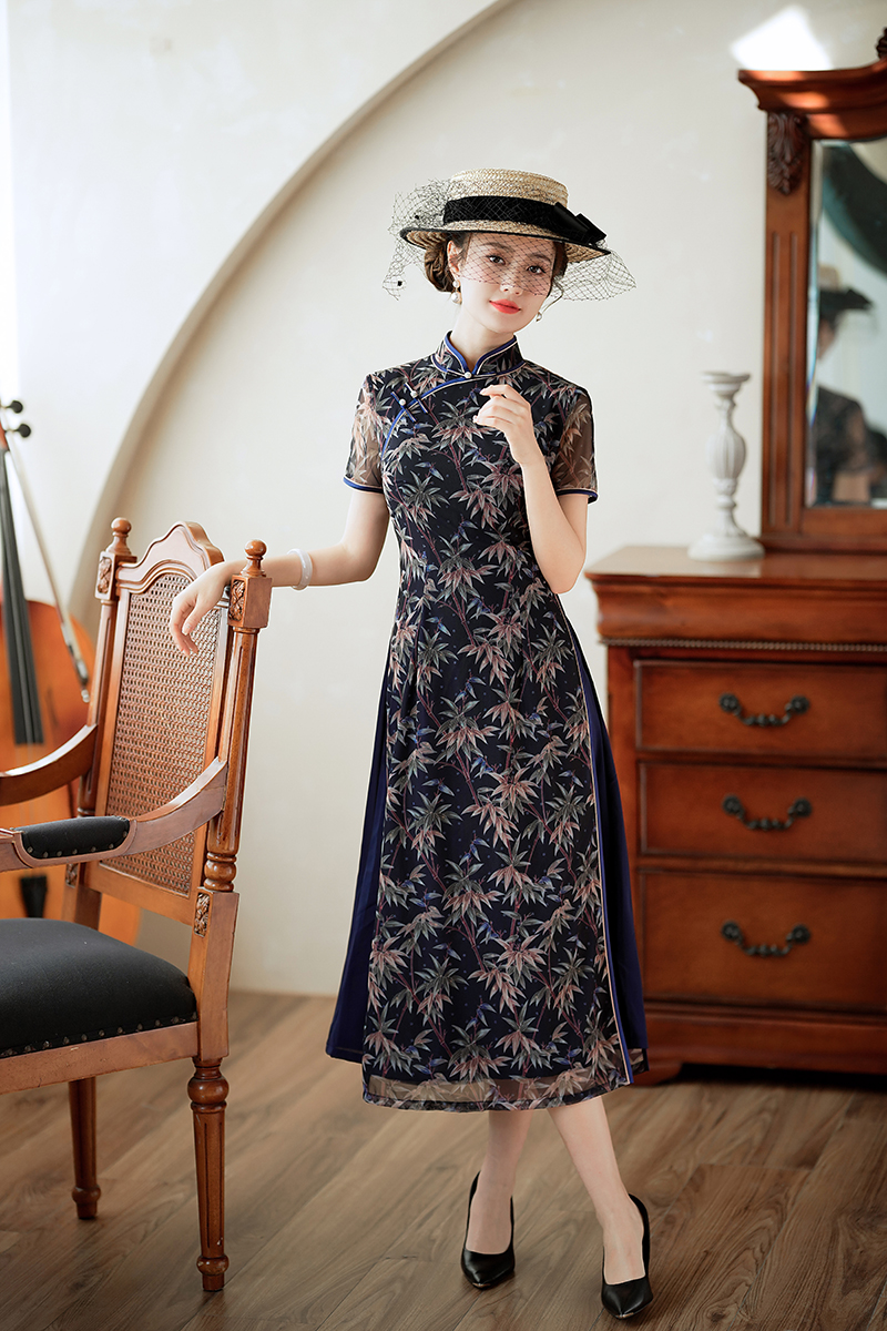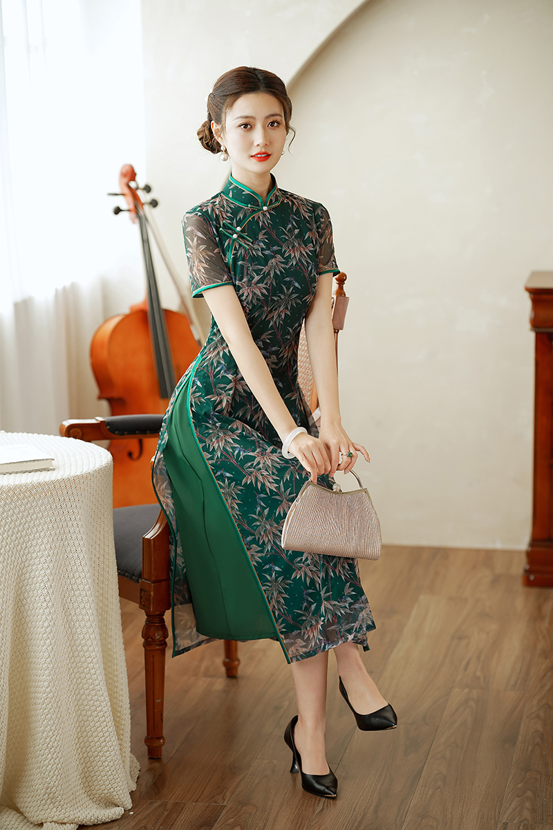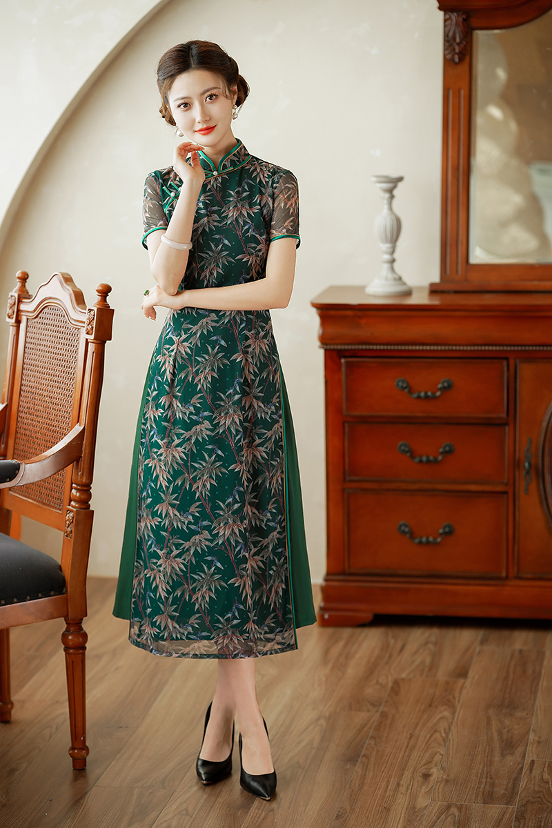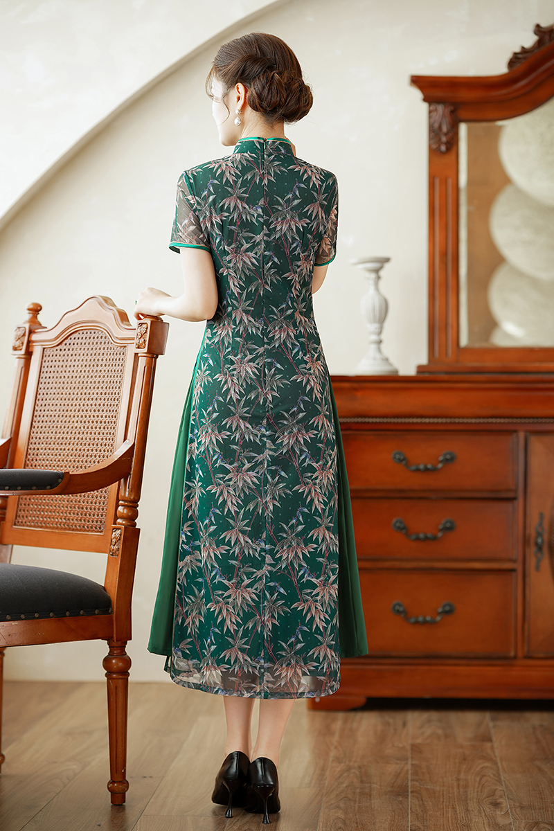 奥黛长款改良气质显瘦旗袍网纱连衣裙TQX171525