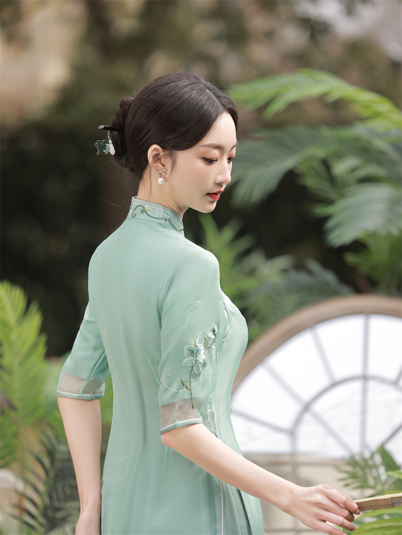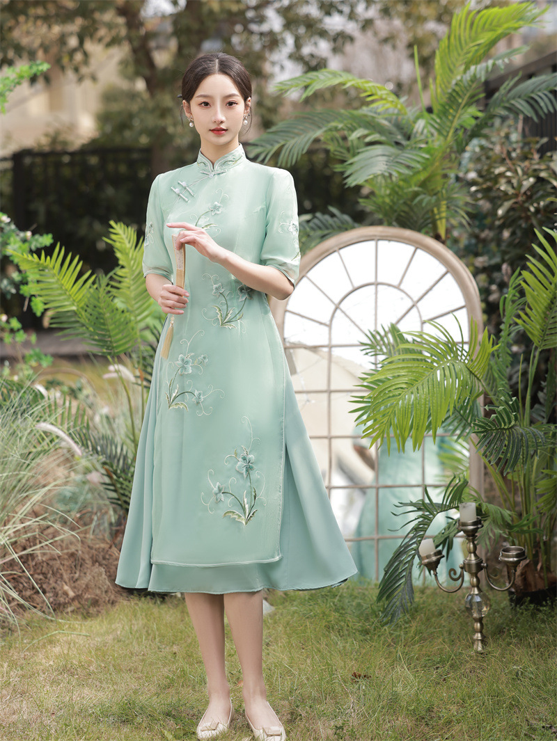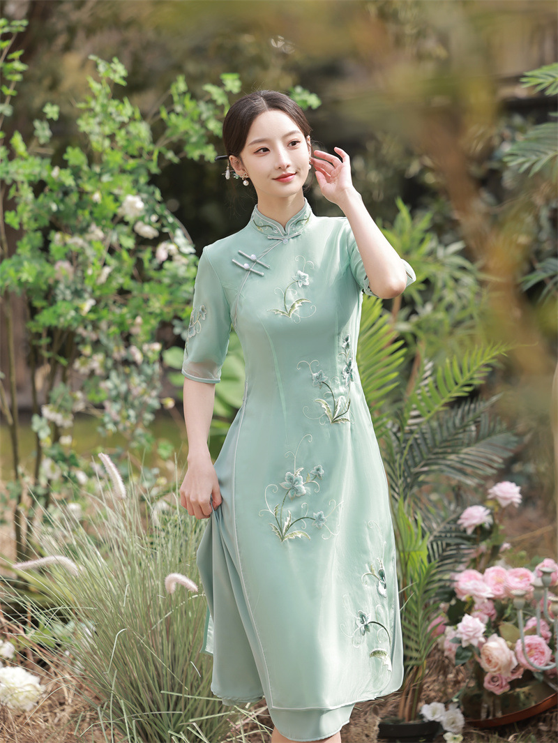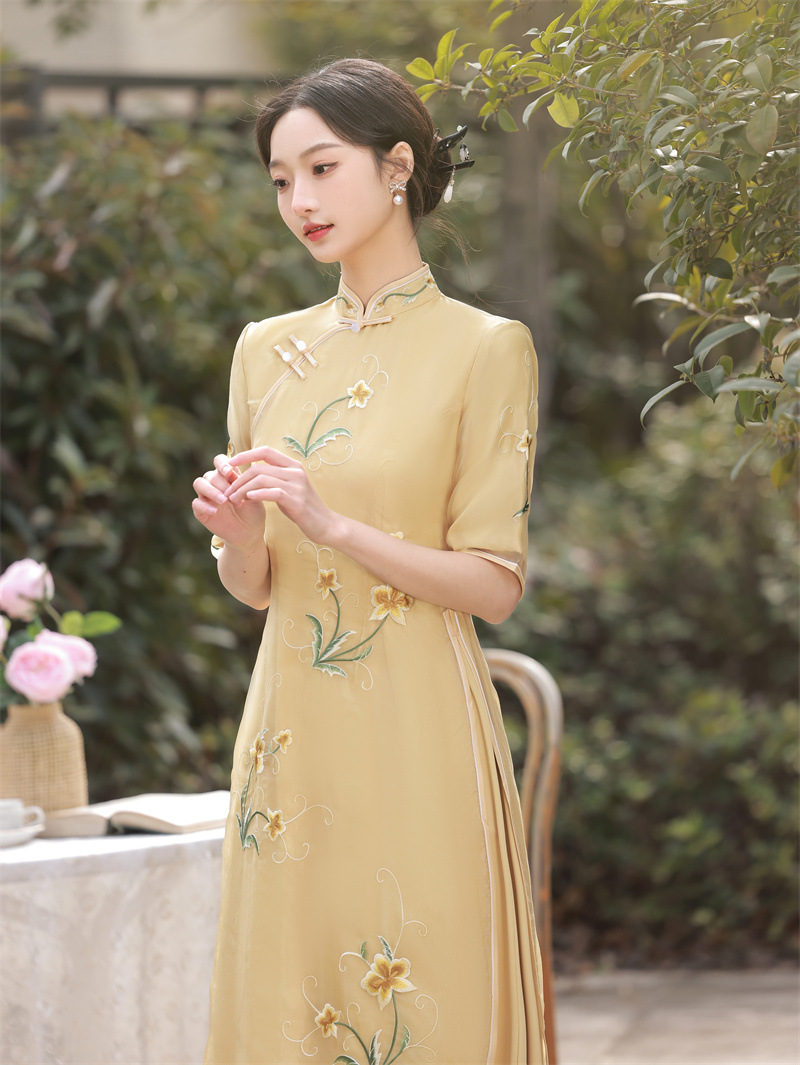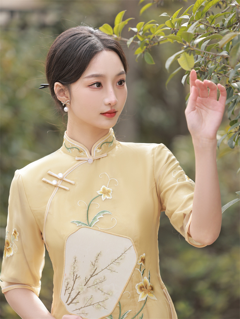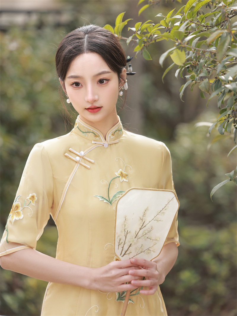 产品特点:2023春夏新款旗袍,面料舒适,质感柔软,垂感好,不缩水,不褪色,不起球,轻微弹力,更具有中华民族特色,欢迎选购