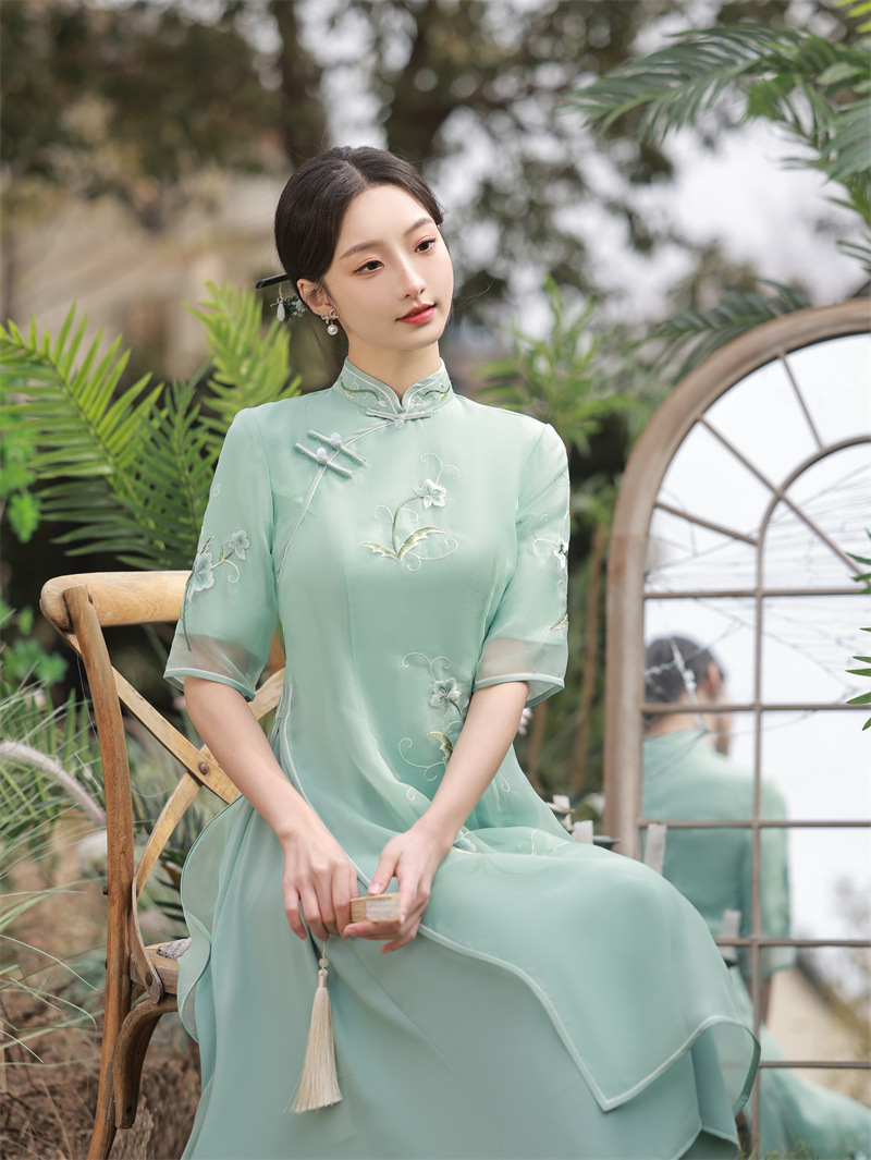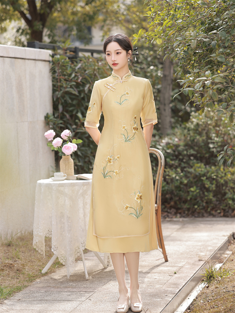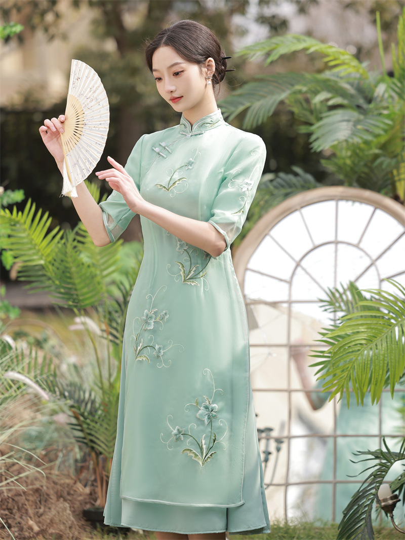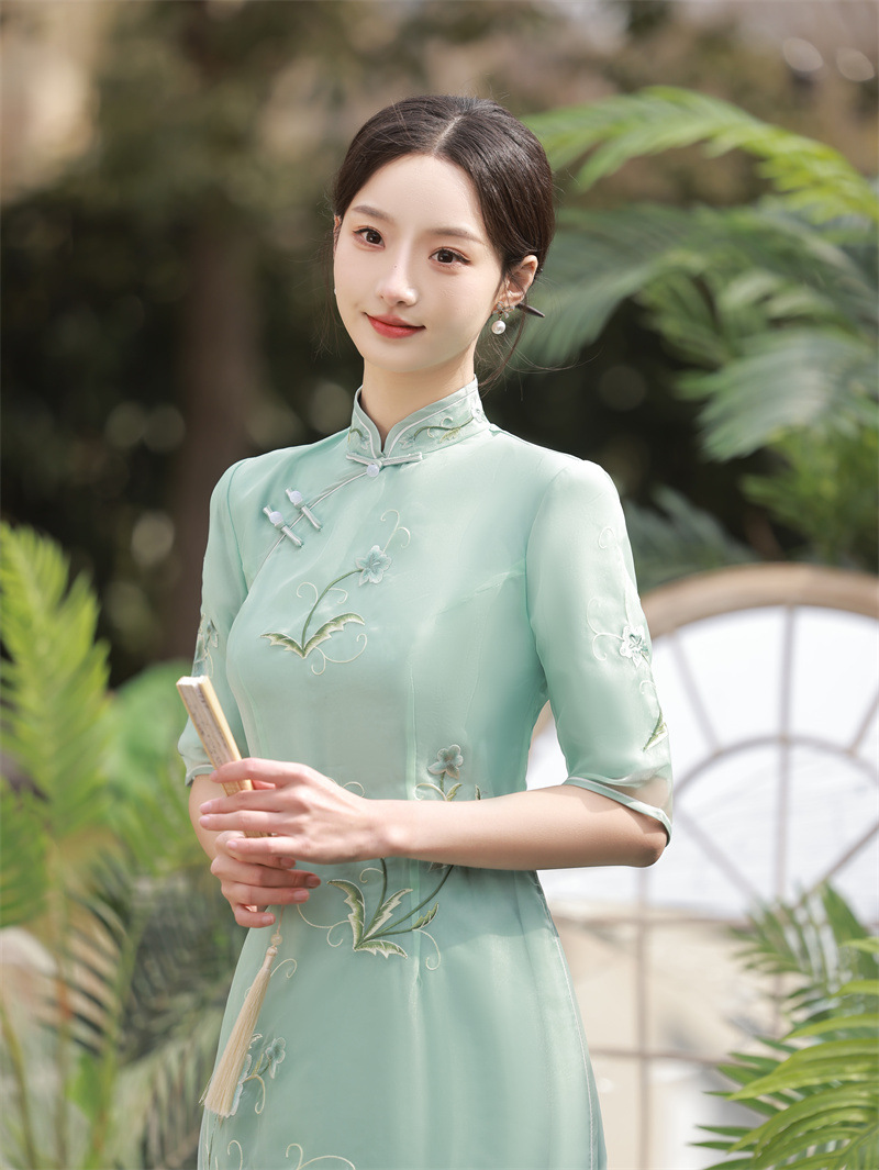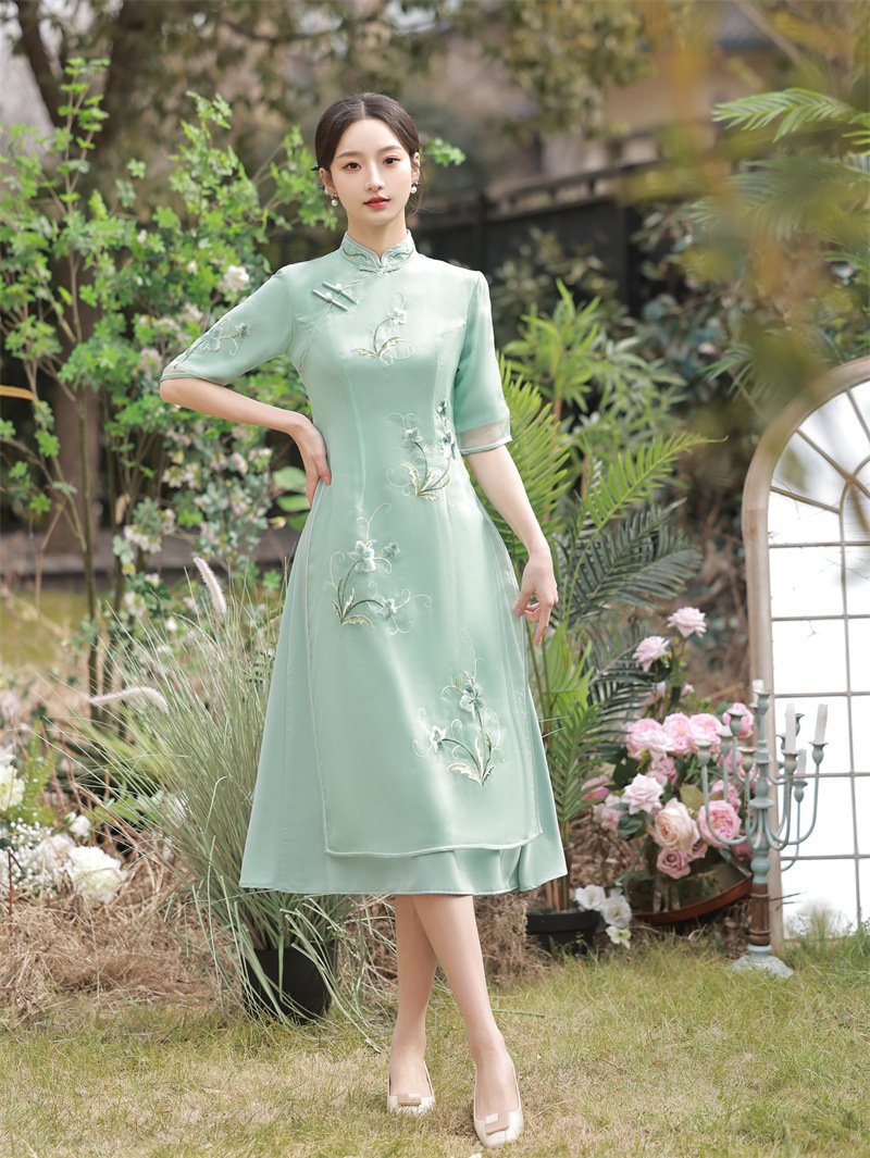 产品特点:2023春夏新款旗袍,面料舒适,质感柔软,垂感好,不缩水,不褪色,不起球,轻微弹力,更具有中华民族特色,欢迎选购