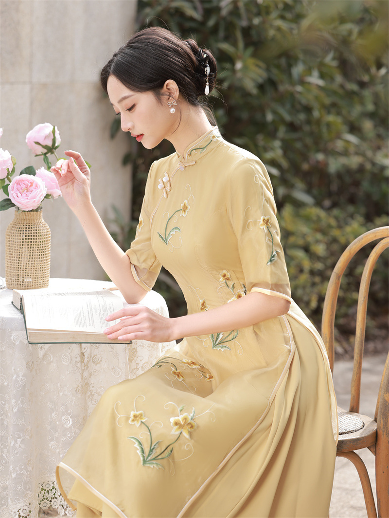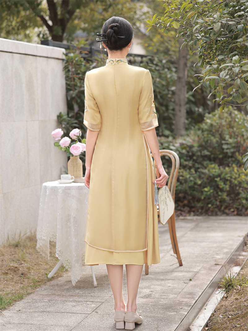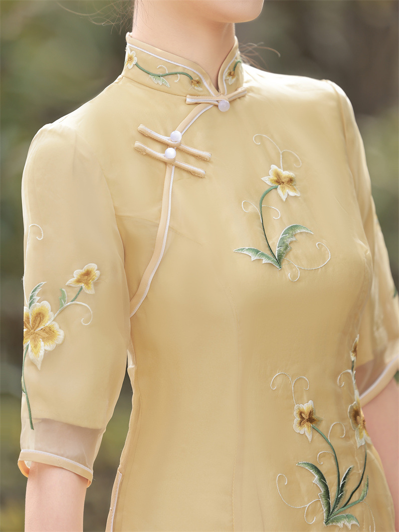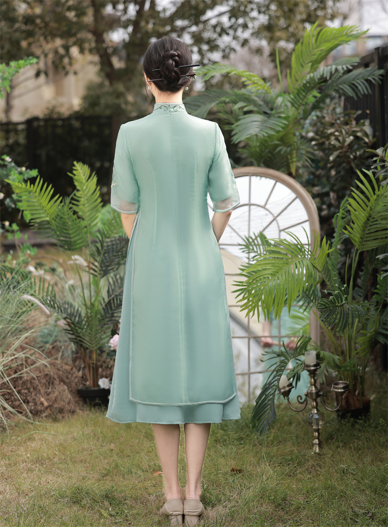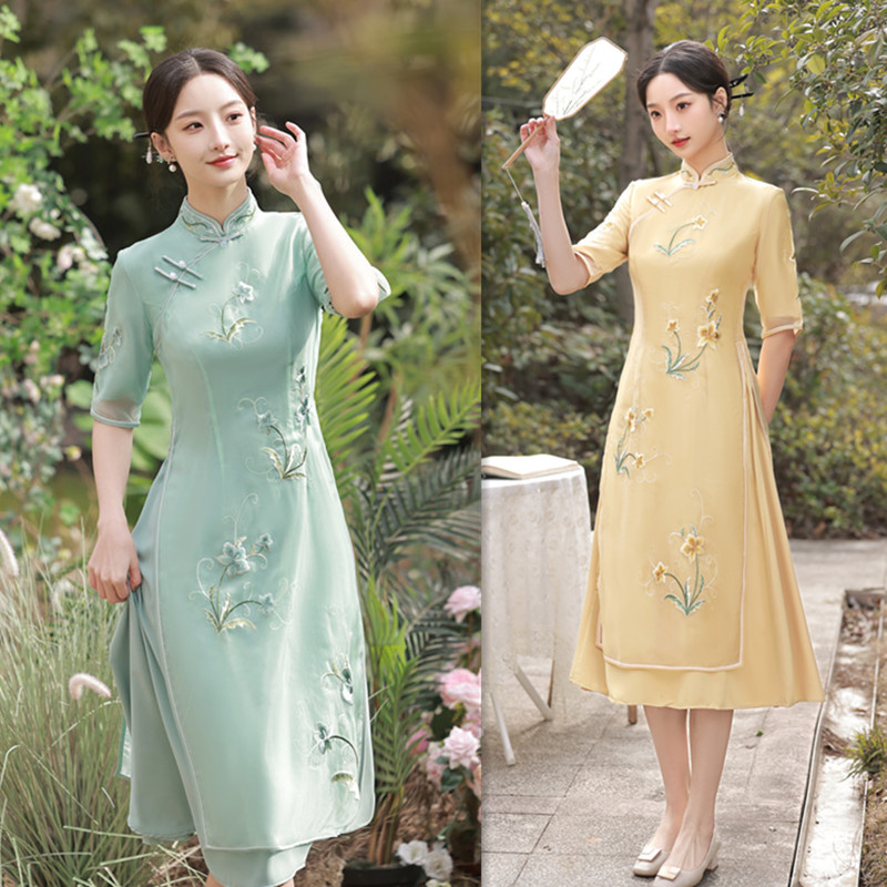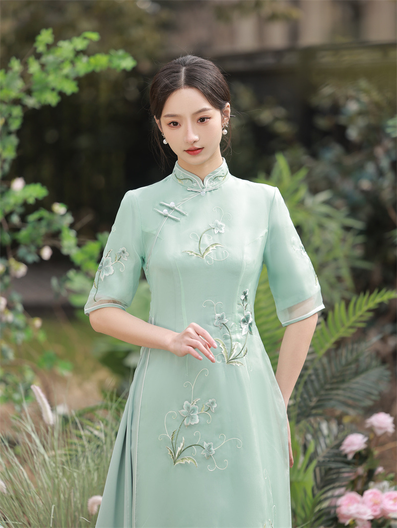 产品特点:2023春夏新款旗袍,面料舒适,质感柔软,垂感好,不缩水,不褪色,不起球,轻微弹力,更具有中华民族特色,欢迎选购