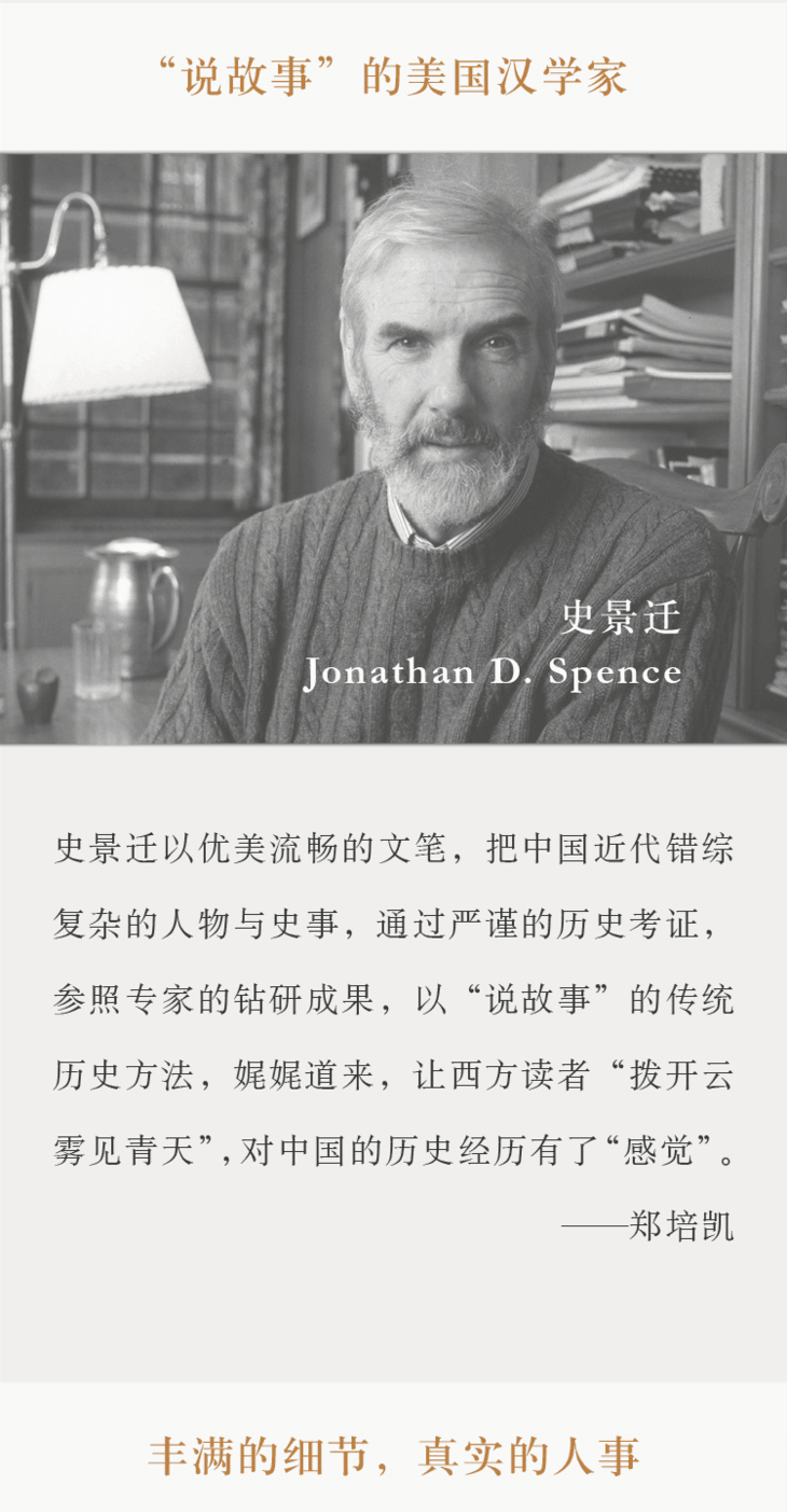 史景迁(Jonathan D. Spence),1936年出生于英国,是国际知名的中国近现代史专家,1965—2008年在美国耶鲁大学历史系任教。著作极丰,主要有《追寻现代中国》、《雍正王朝之大义觉迷》、《太平天国》、《改变中国》、《曹寅与康熙》、《康熙》、《天安门》、《大汗之国:西方眼中的中国》、《王氏之死》、《利玛窦的记忆宫殿》、《胡若望的疑问》。