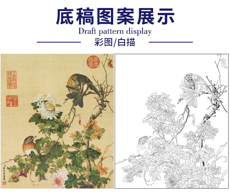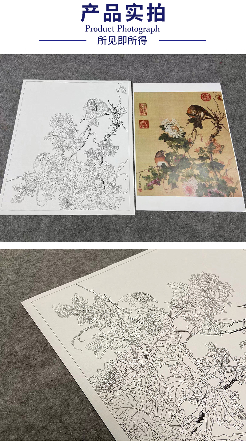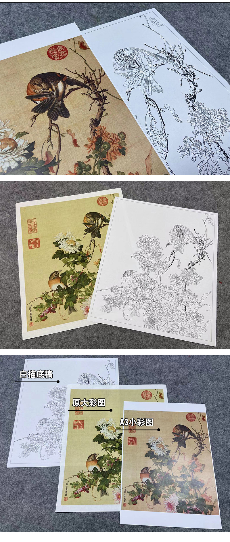 【大彩图】郎世宁工笔画白描底稿小品《仙萼长春册》菊花临摹勾线高清打印稿LT16