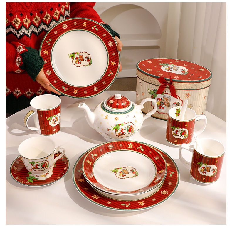 圣诞节釉上彩陶瓷餐具 家用碗盘蝶套装礼盒勺杯子装饰礼品