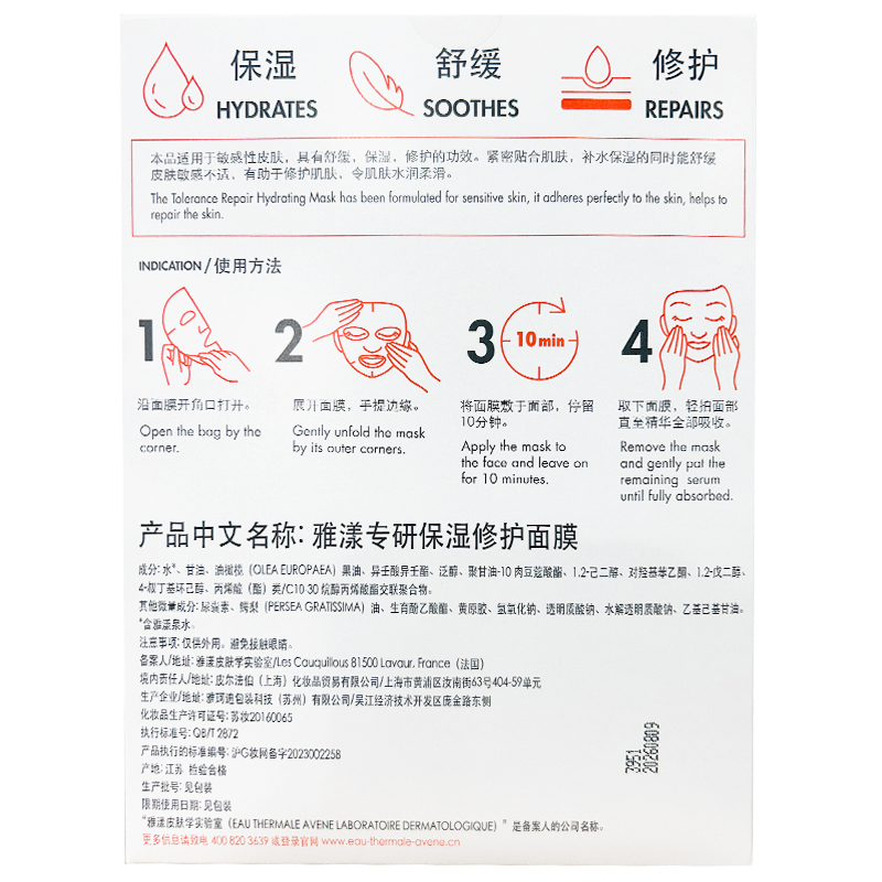 法国雅漾Avène专研保湿修护面膜25ml*5片舒缓泛红修复屏障敏肌控油