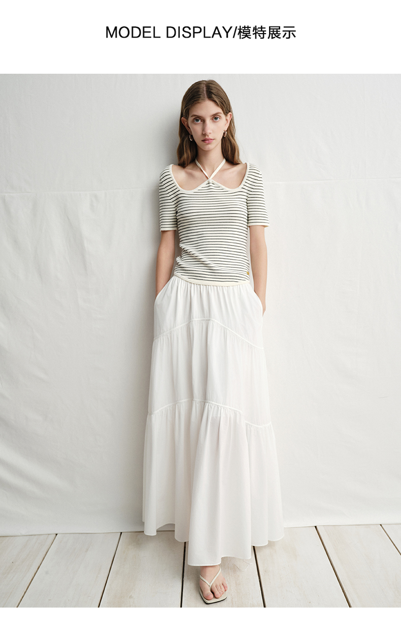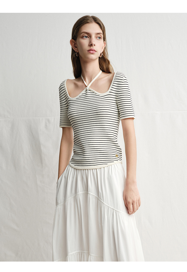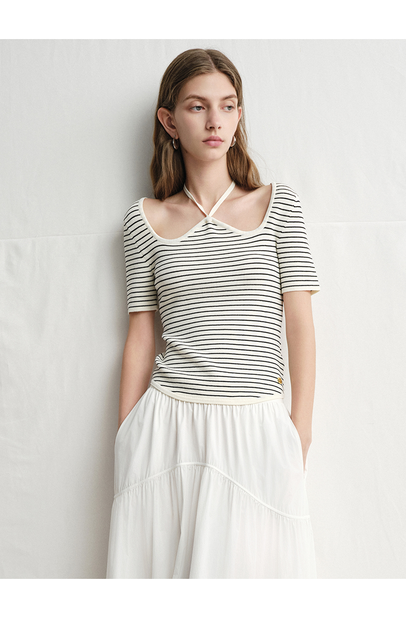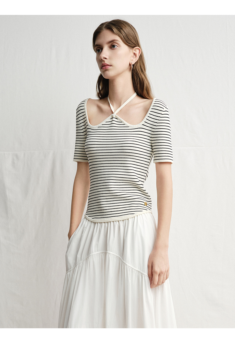 VIMAGE纬漫纪别致百搭系带修身条纹休闲短袖上衣女2025夏季新款V2301906