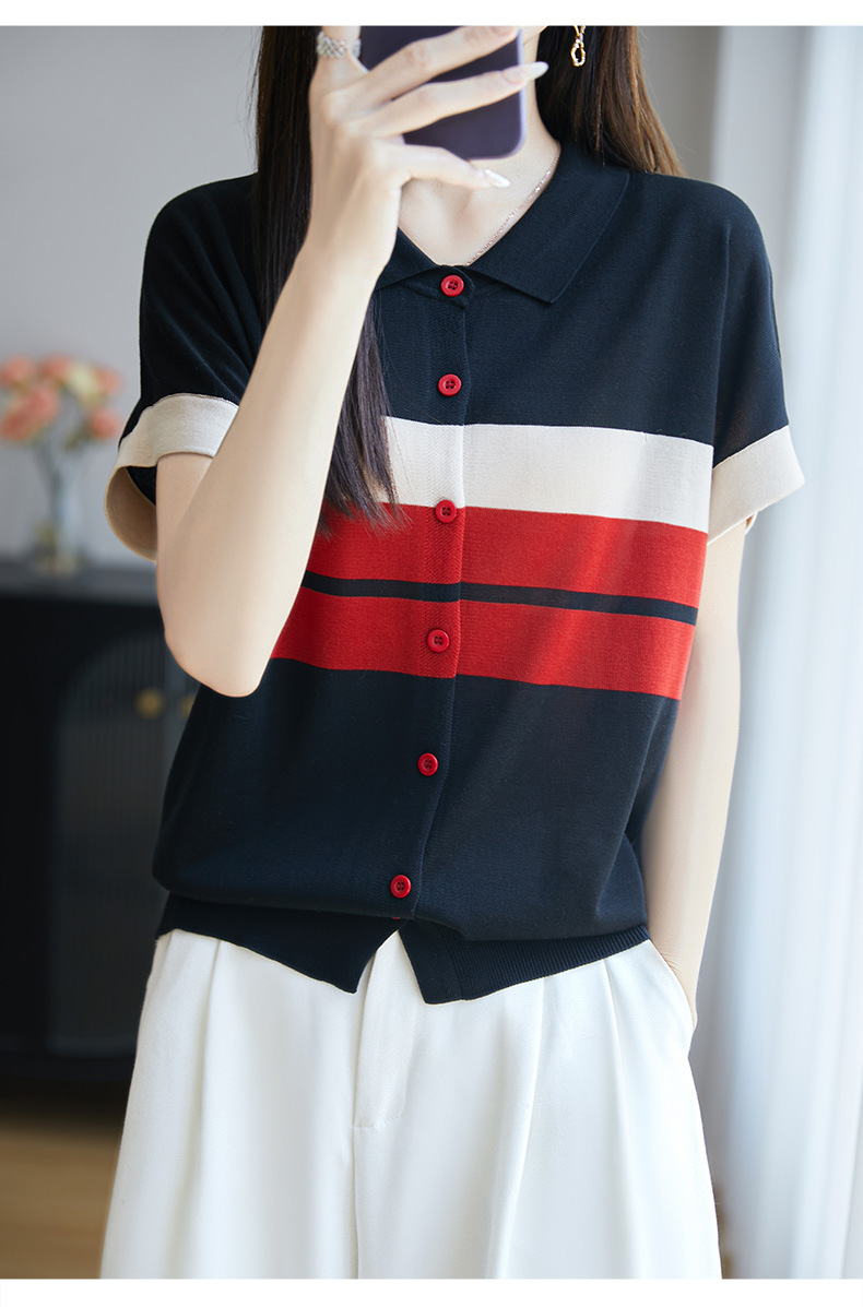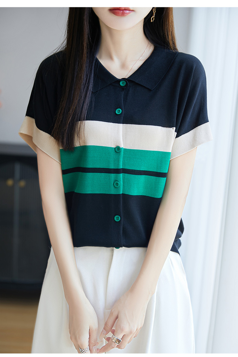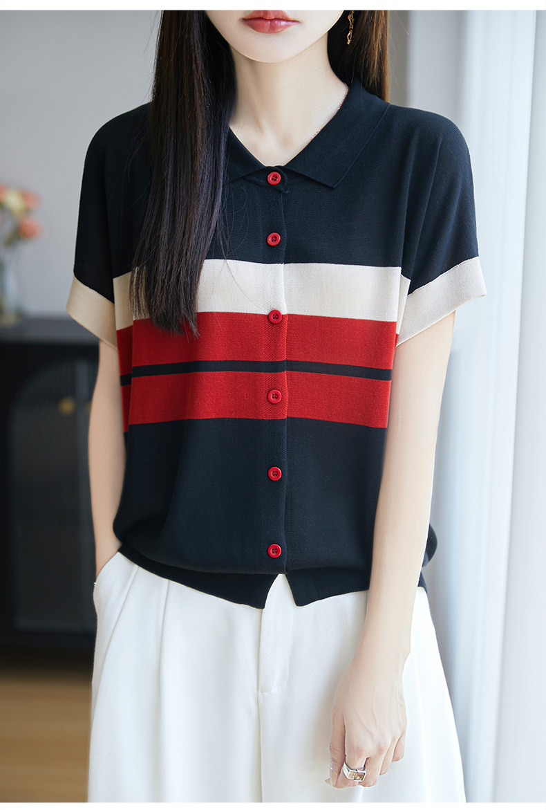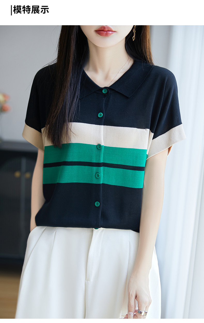 翻领条纹短袖t恤,洋气短款冰丝针织上衣CC-JY-NSY009