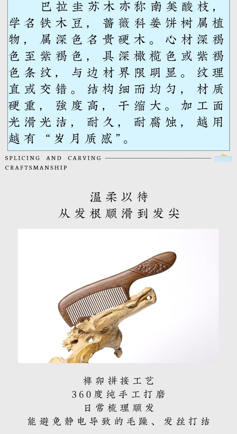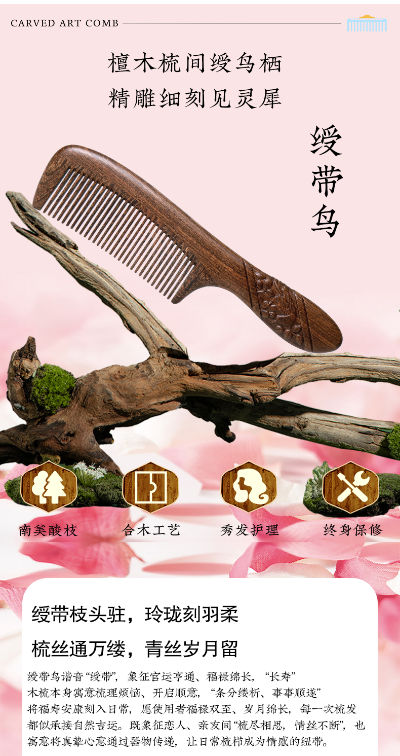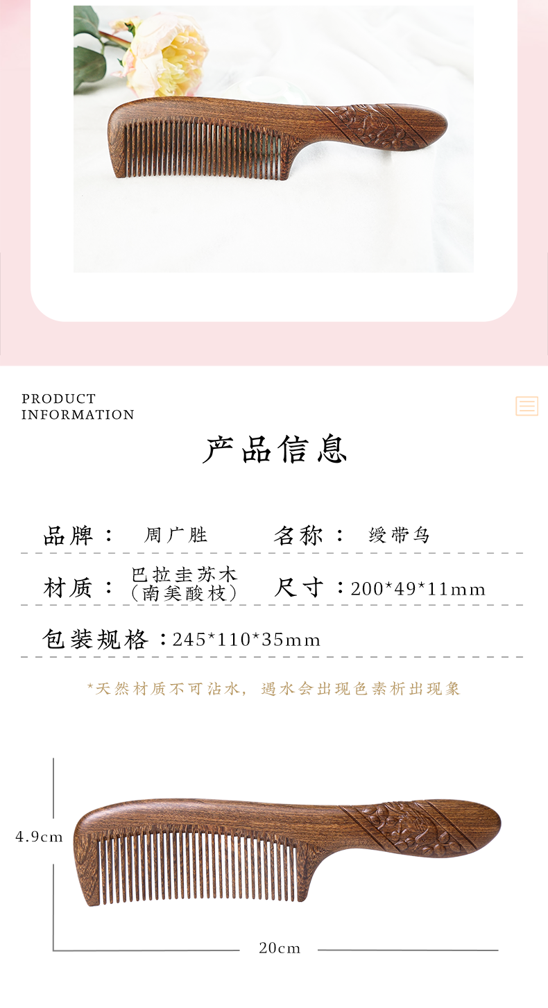 周广胜正品南美酸枝绶带鸟合木梳防静电个人清洁护理送女士长发家用便携