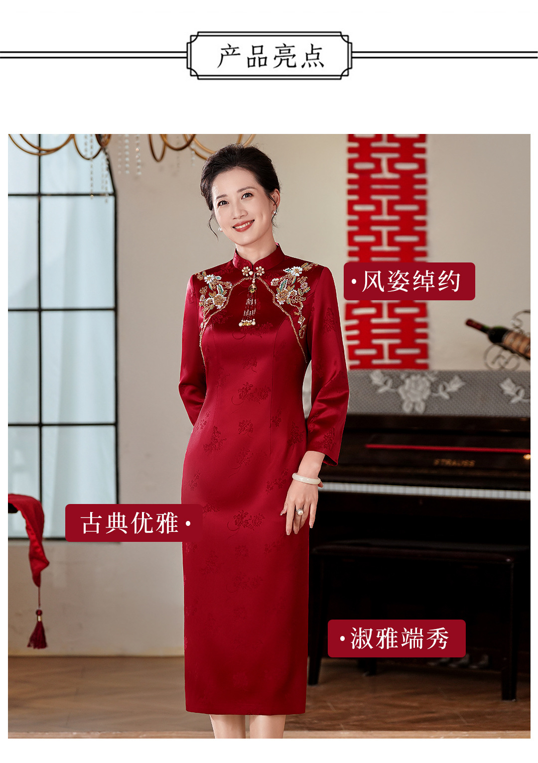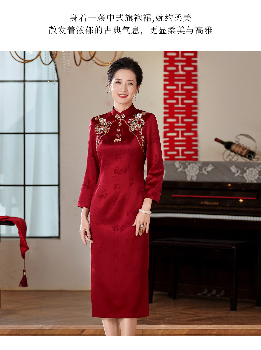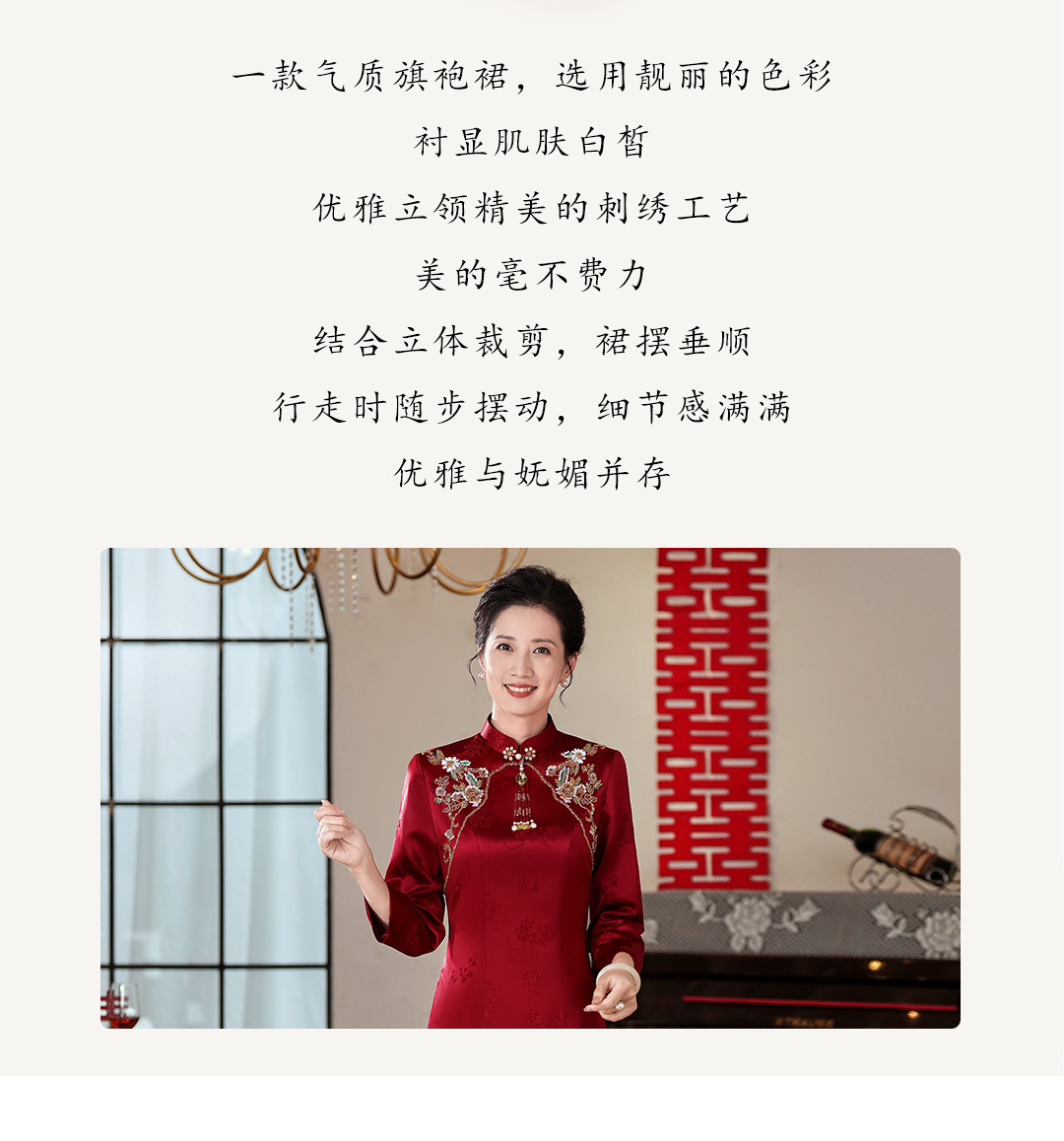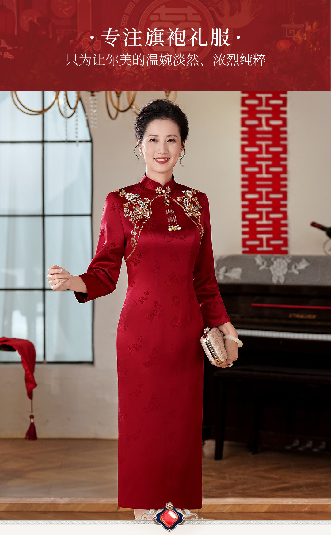 QZ 60728酒红旗袍高级感婚宴妈妈礼服喜婆婆连衣裙