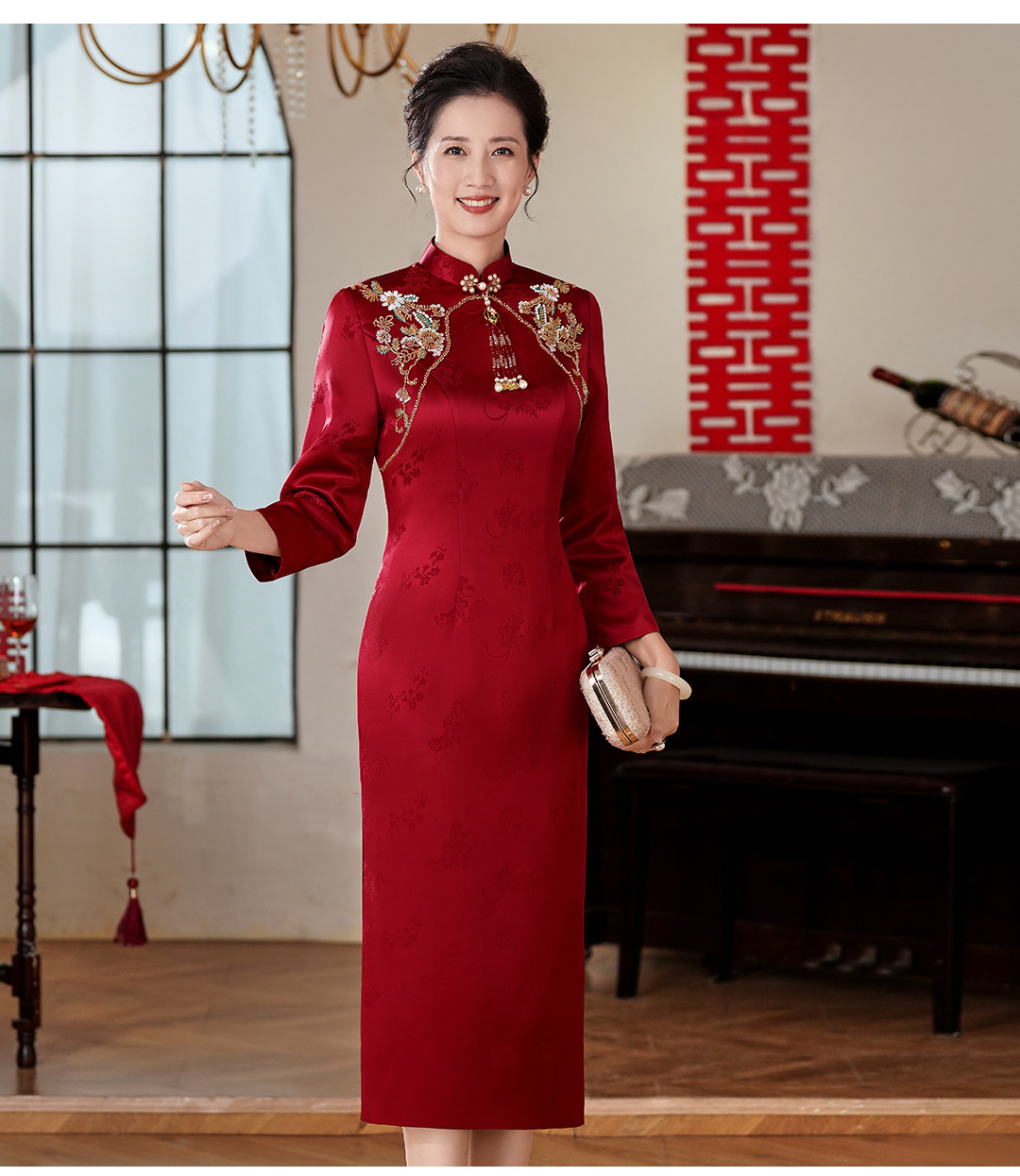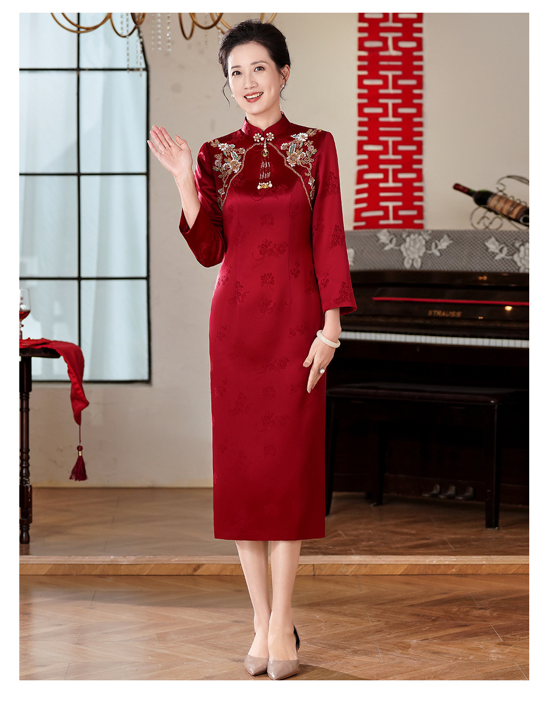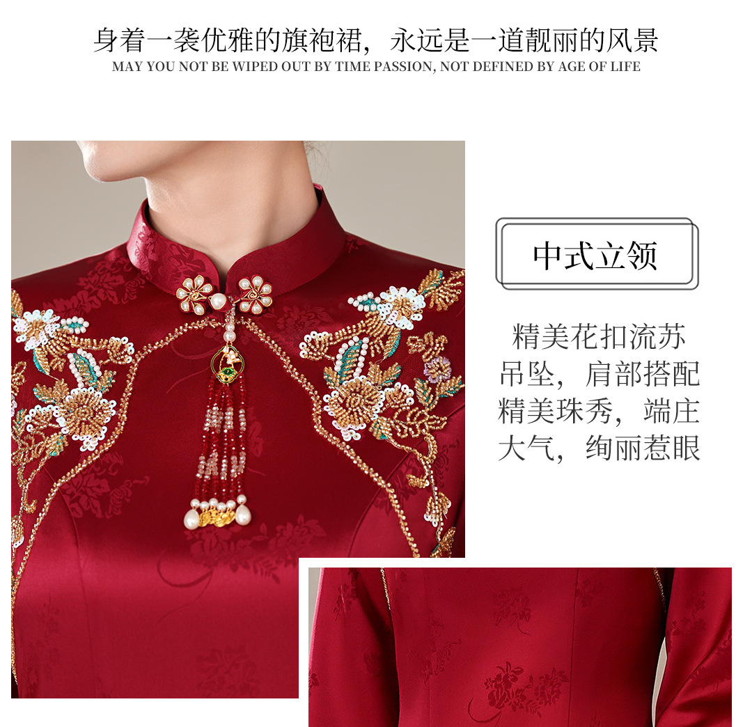 QZ 60728酒红旗袍高级感婚宴妈妈礼服喜婆婆连衣裙