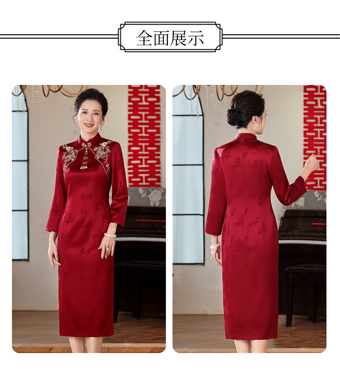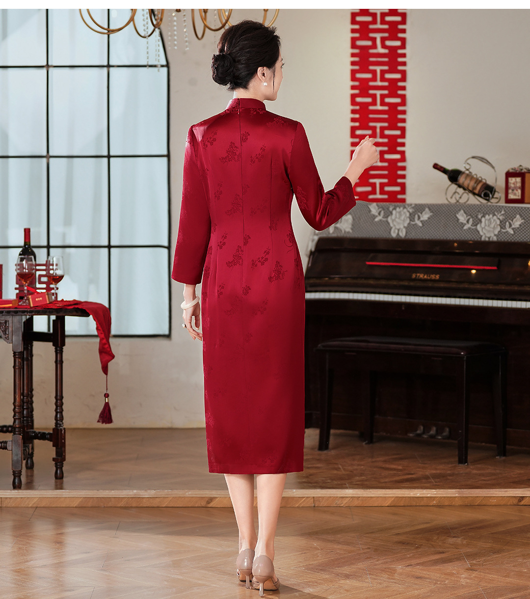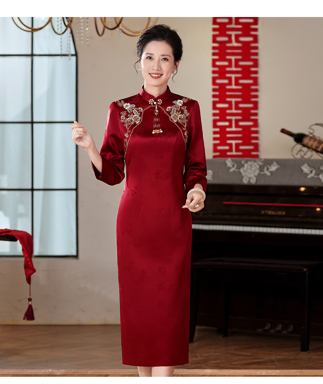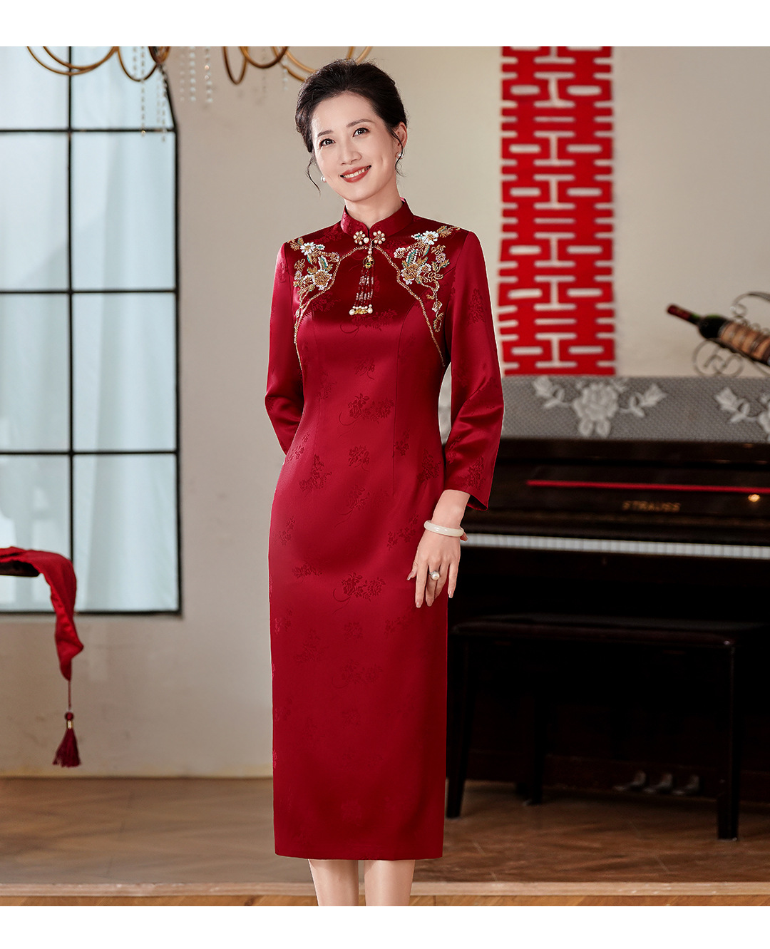 QZ 60728酒红旗袍高级感婚宴妈妈礼服喜婆婆连衣裙