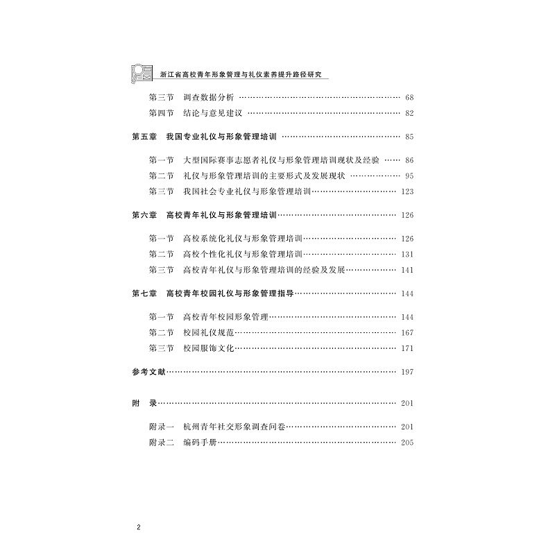 本书为杭州市哲社课题成果。本书主要内容如下:1.传统文化中的礼仪与形象(礼仪的起源与发展、传统社交礼仪与形象、古代文学作品中的礼仪与形象);2.新时代文化中的礼仪与形象(当代礼仪与形象的发展趋势、当代社交礼仪与形象);3.新时代高校青年的礼仪与形象(礼仪形象与高校育人目标、高校青年礼仪形象的内涵和目标);4. 新时代高校青年礼仪与形象的现状(当代青年礼仪形象的问题及提升对策);5. 高校青年礼仪与形象管理培养案例;等等。