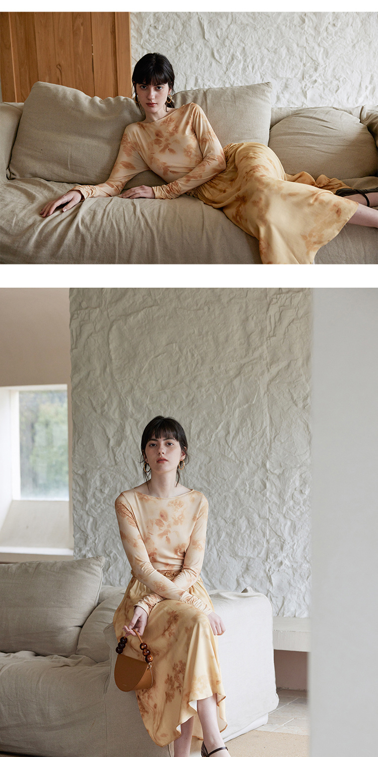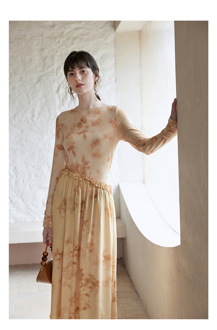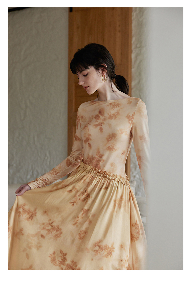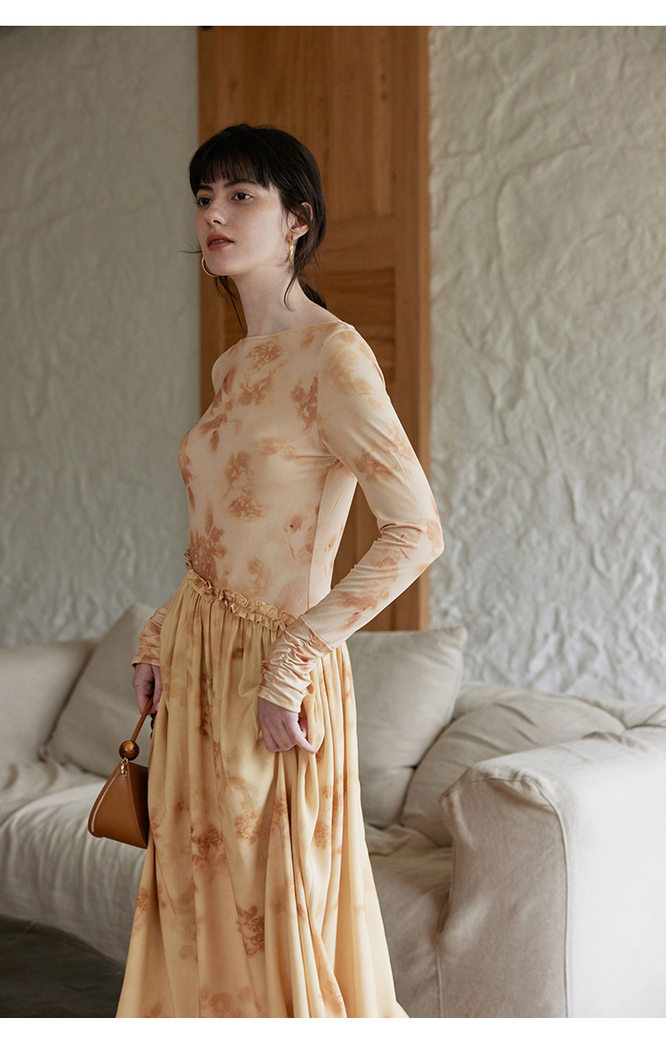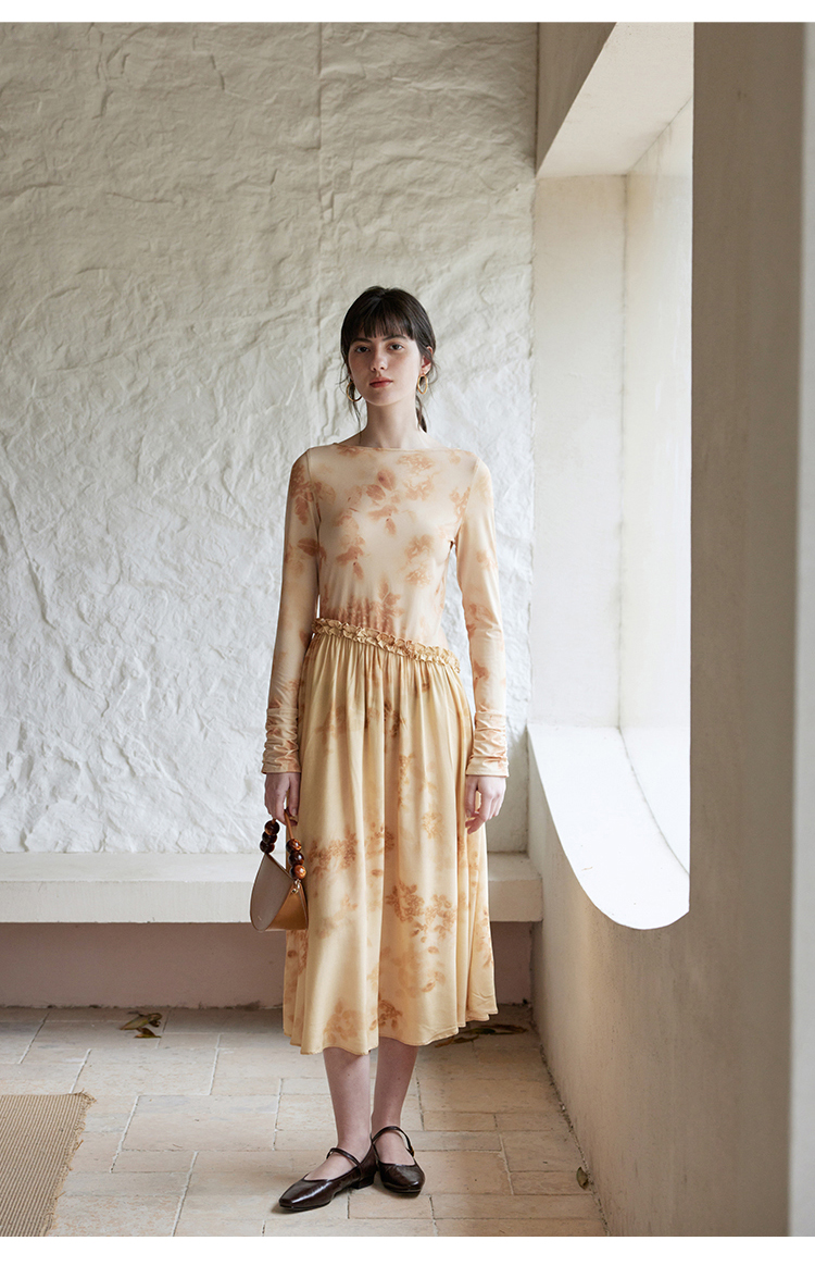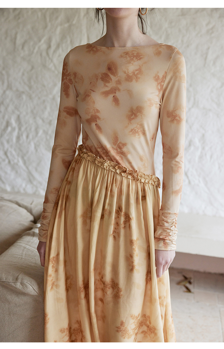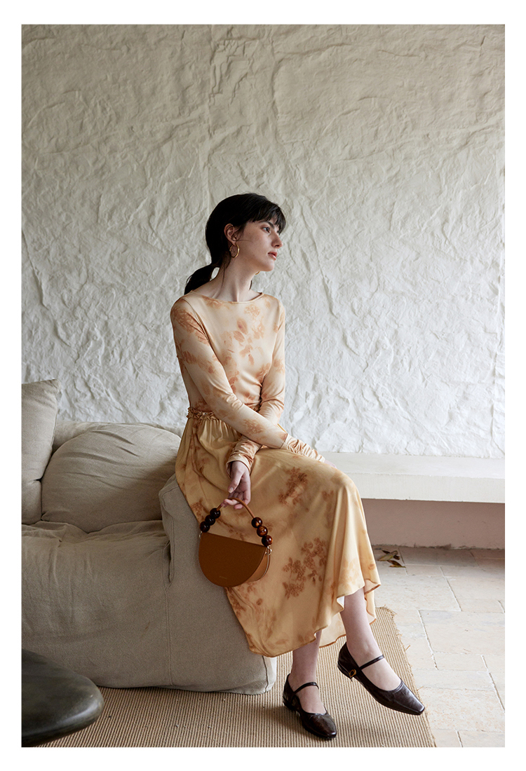 HeyDress斜腰印花连衣裙女春季法式复古收腰拼接设计优雅气质裙子