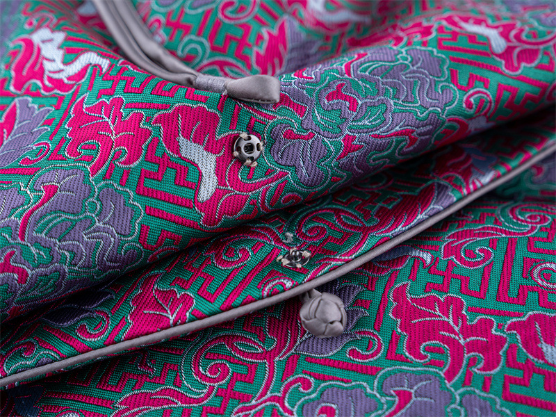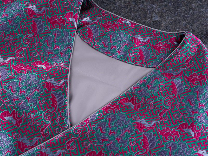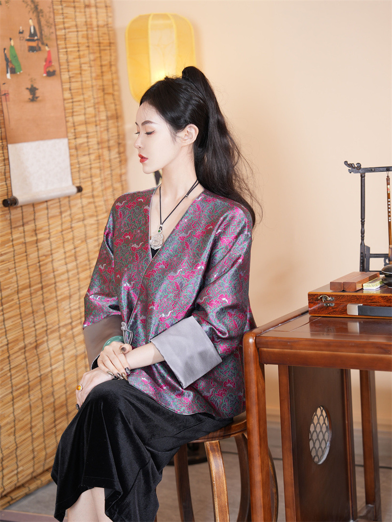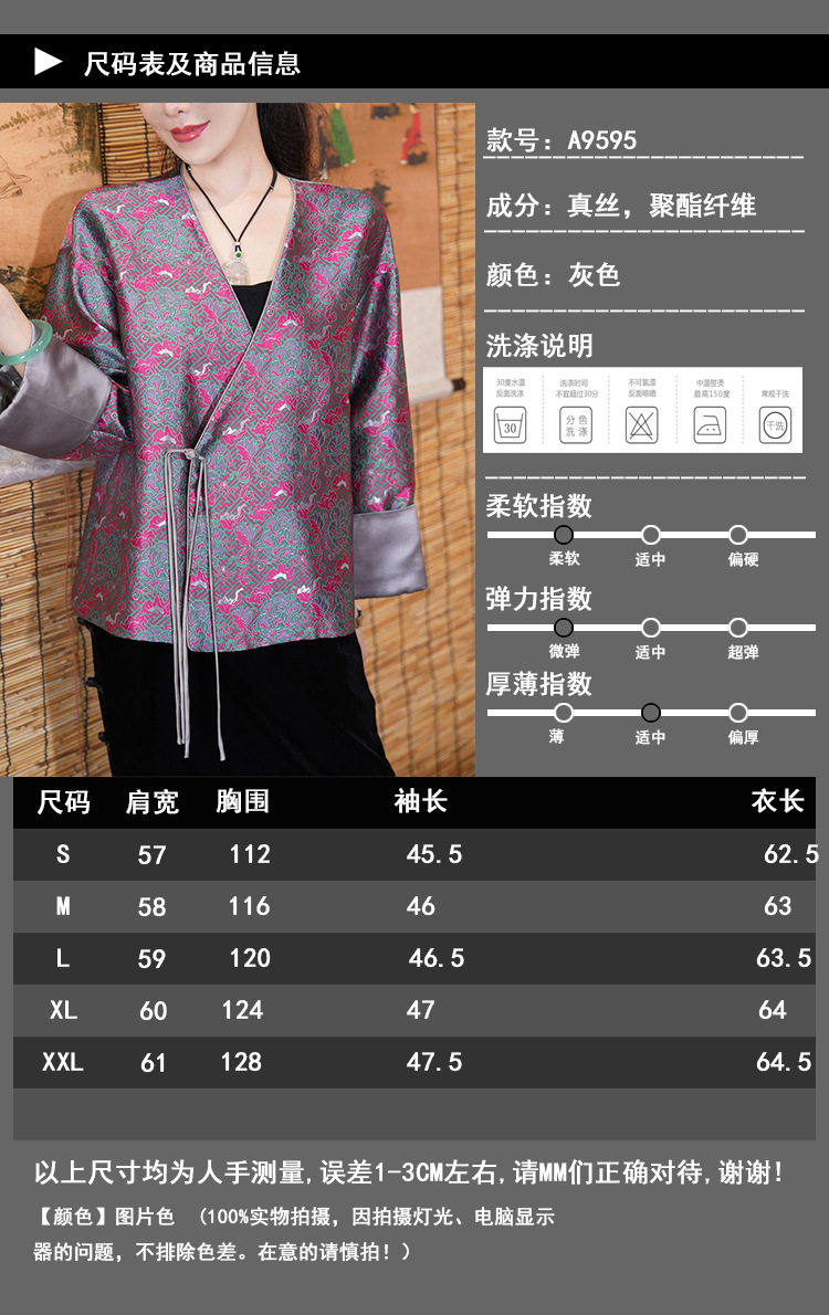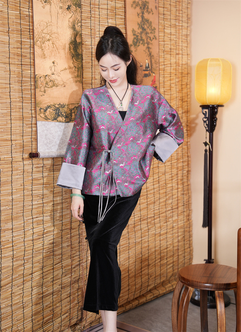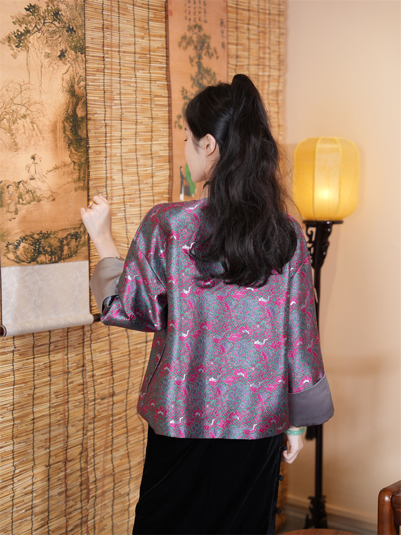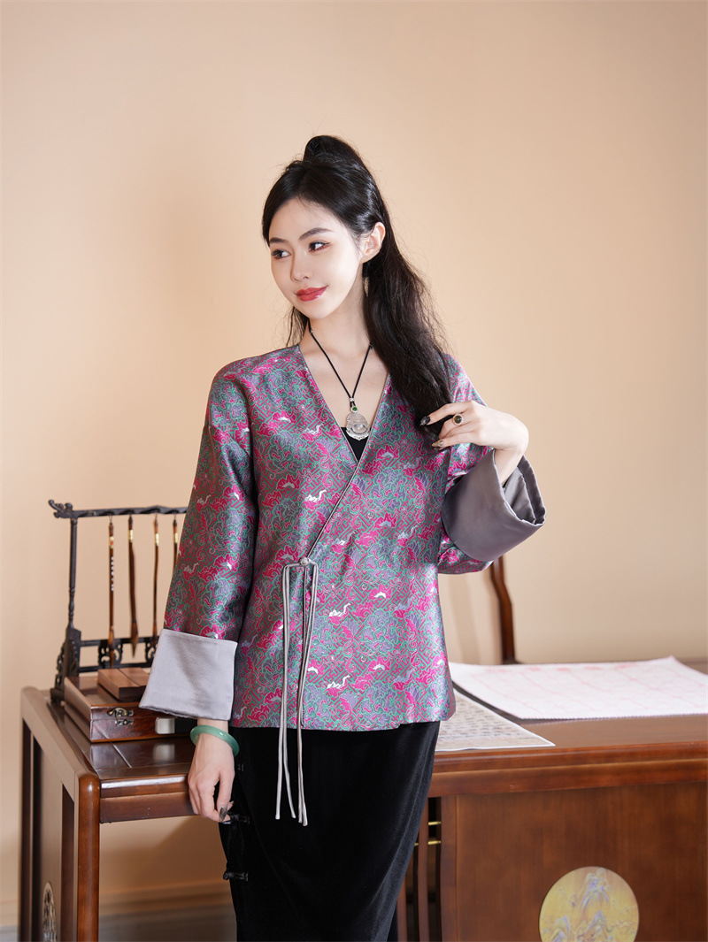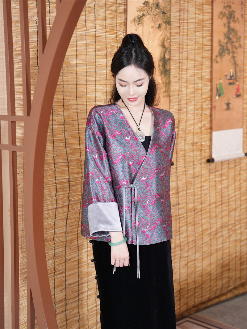 FLZD-A9595秋季新款高端宋锦面料新中式斜襟盘扣风衣外套宽松时尚女个性上衣