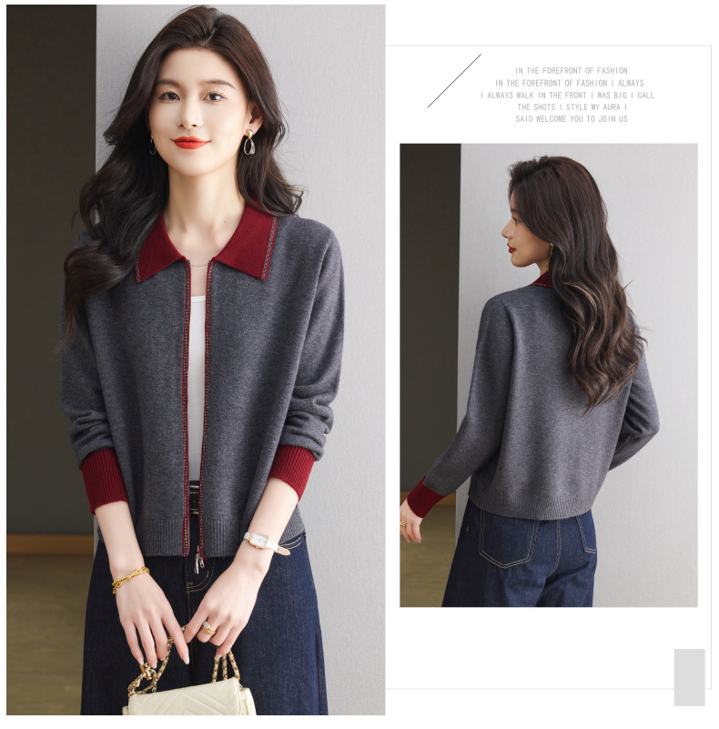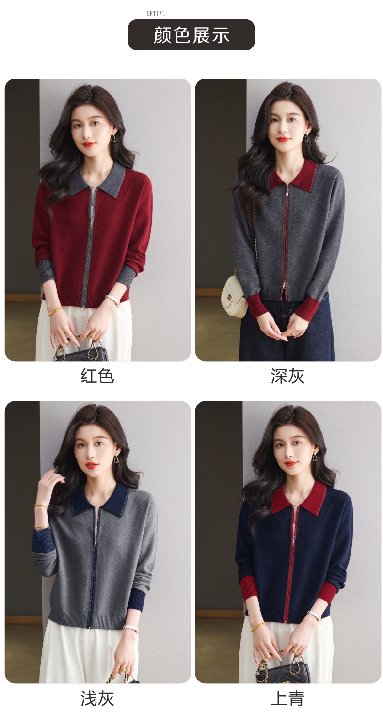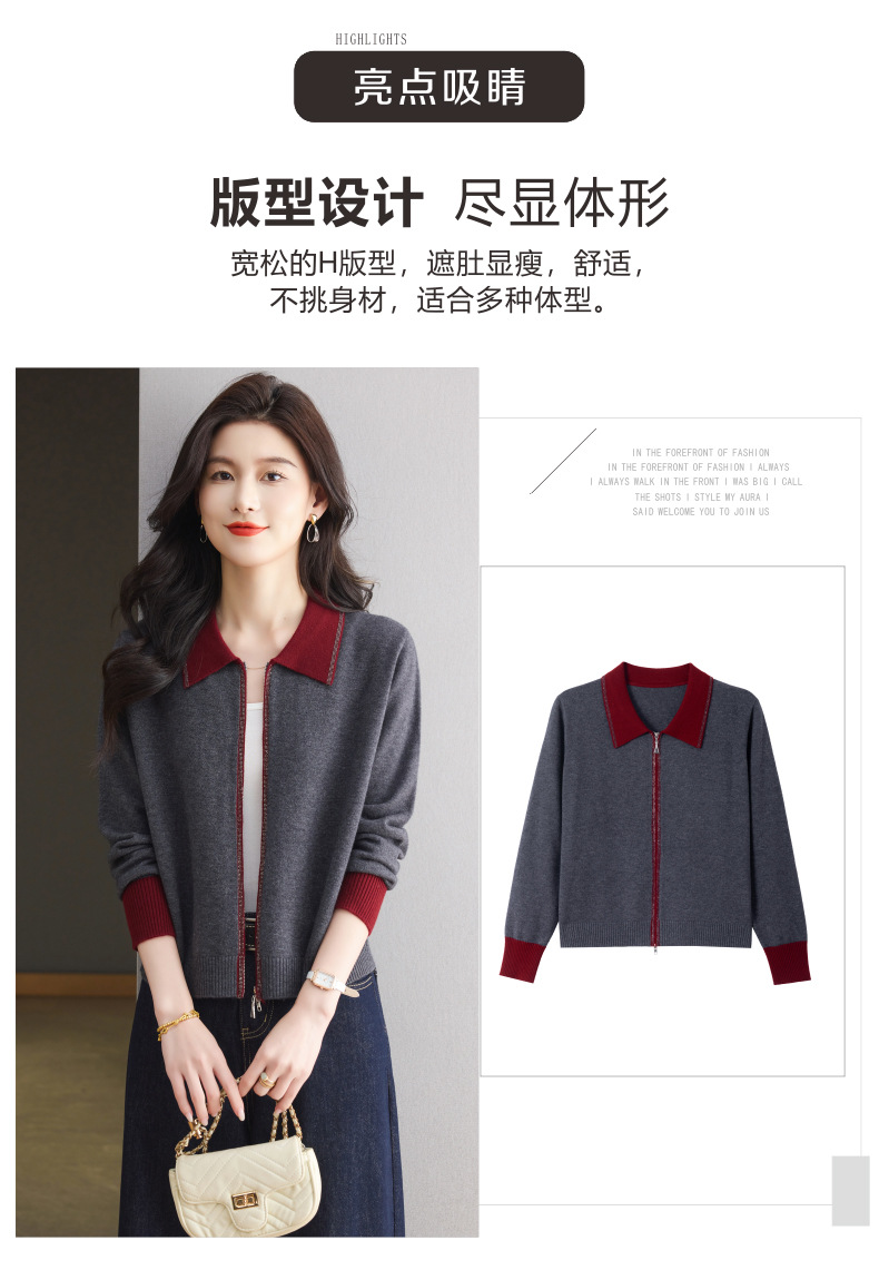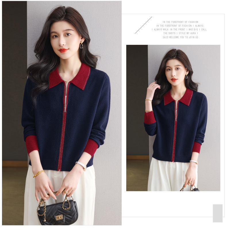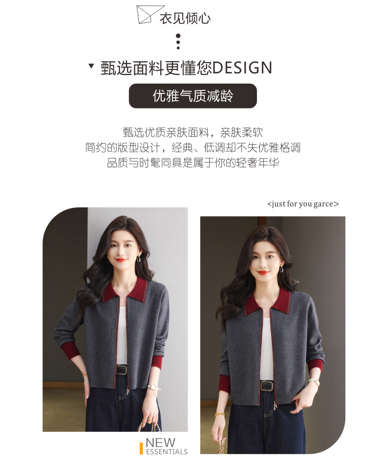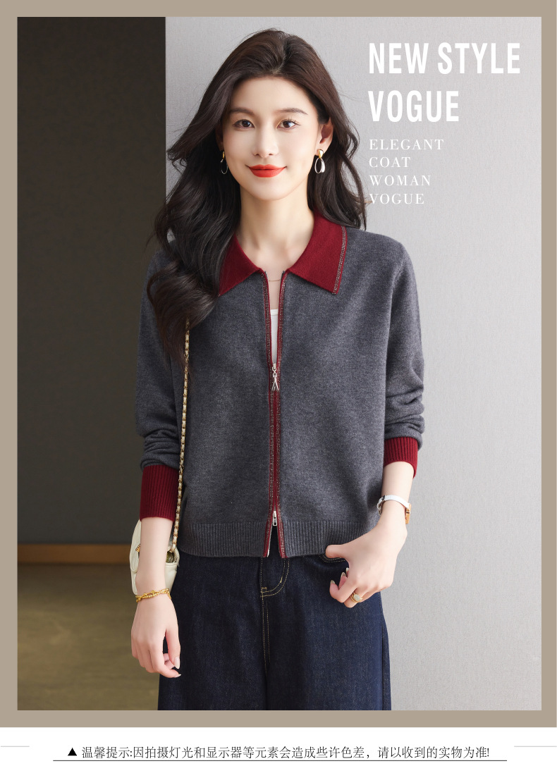 CC翻领拉链上衣女春秋高级感撞色针织开衫2025新款大码毛衣外套胖mm