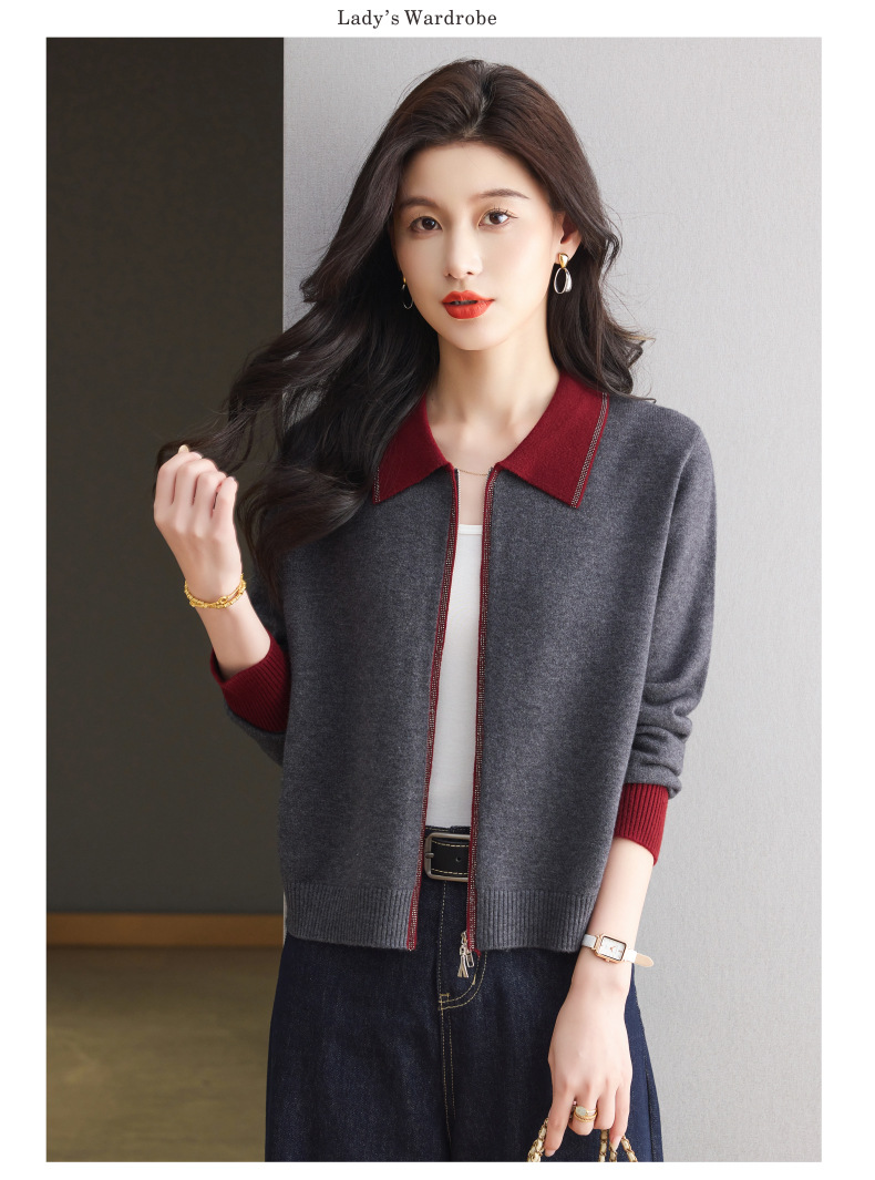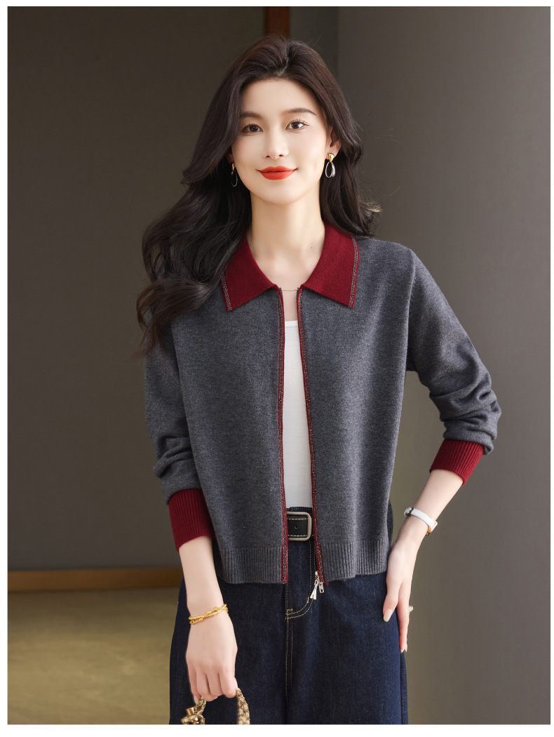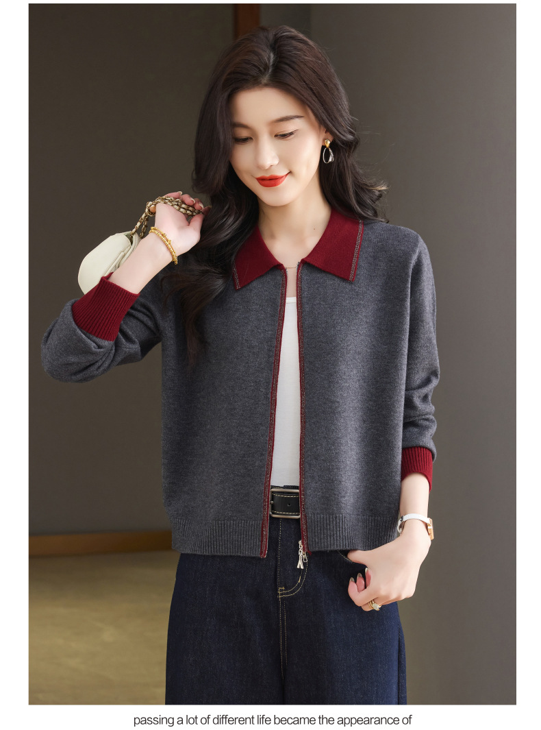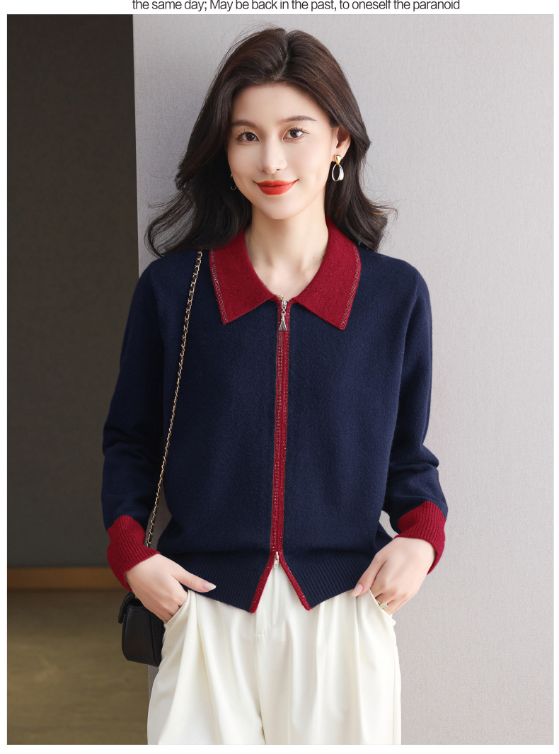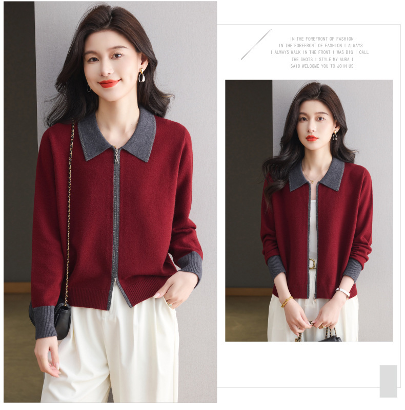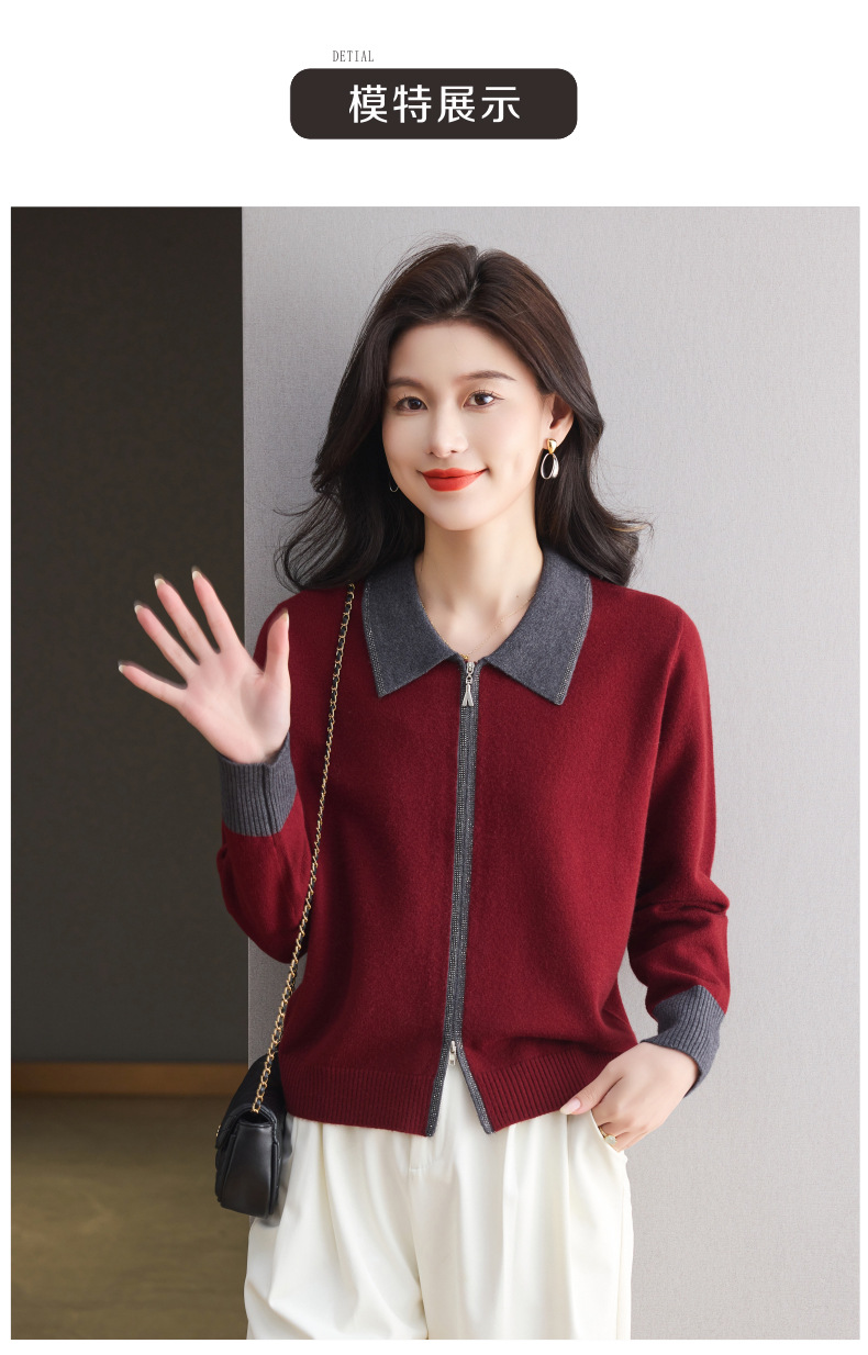 CC翻领拉链上衣女春秋高级感撞色针织开衫2025新款大码毛衣外套胖mm
