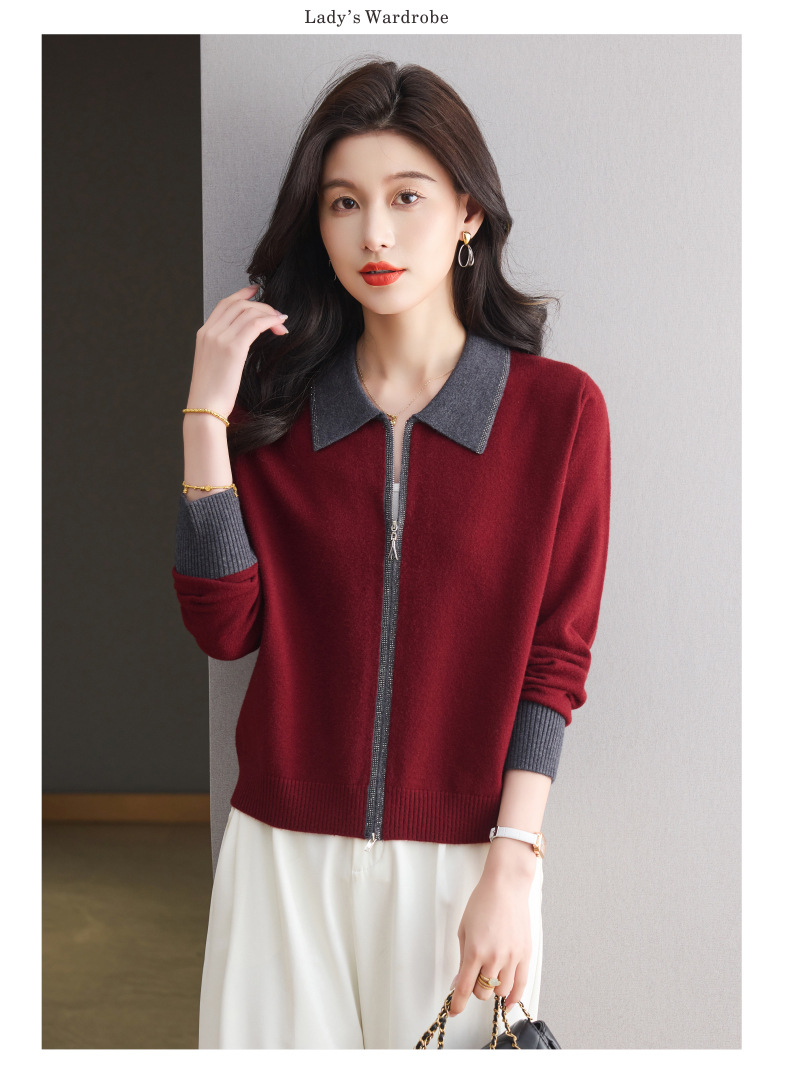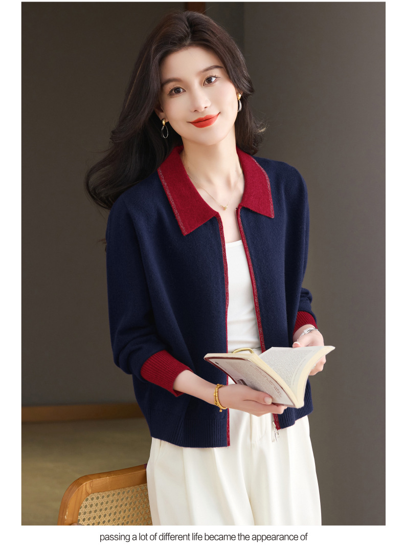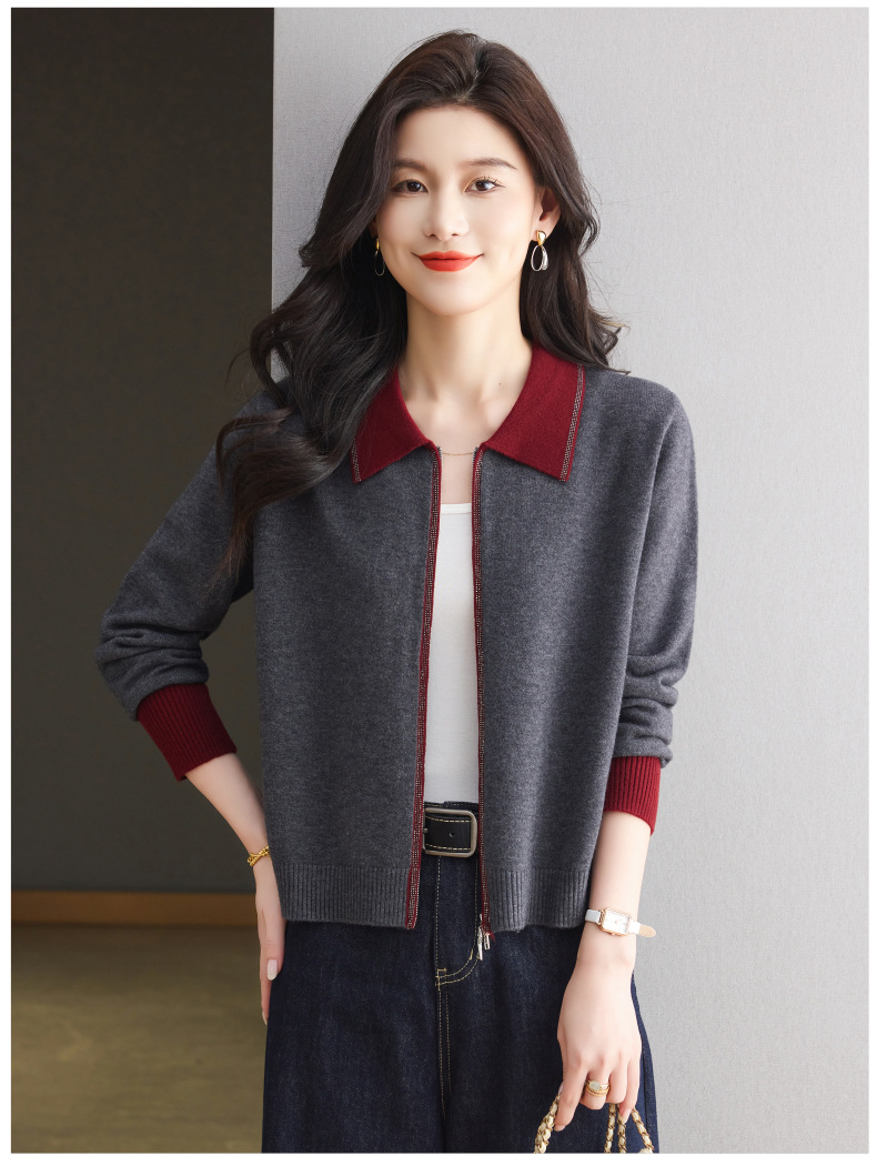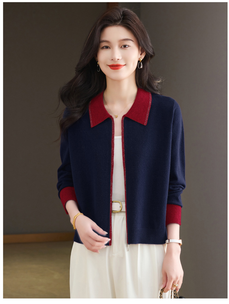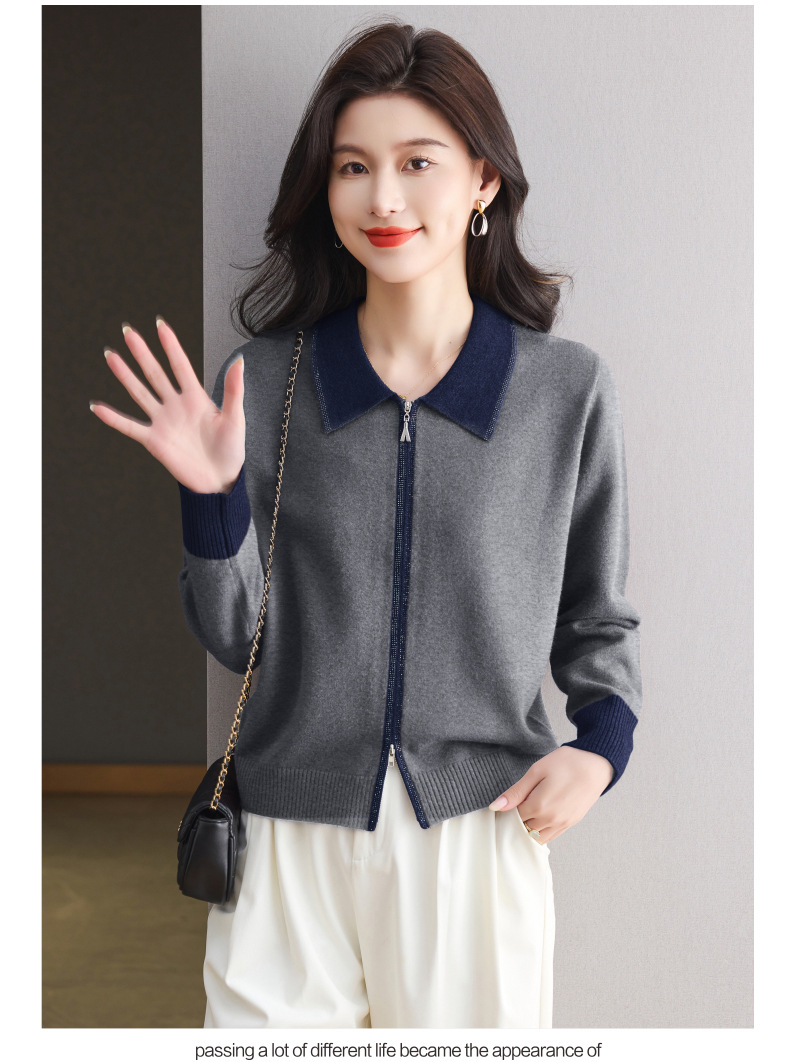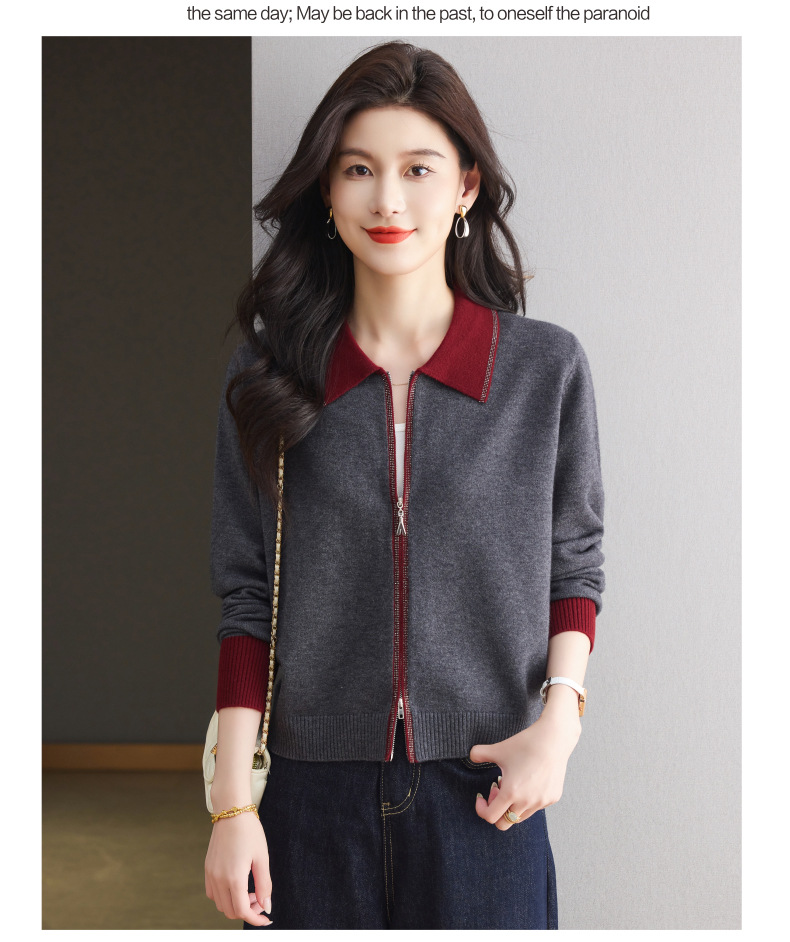 CC翻领拉链上衣女春秋高级感撞色针织开衫2025新款大码毛衣外套胖mm