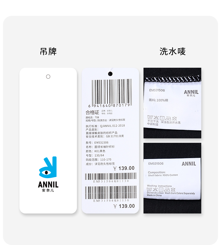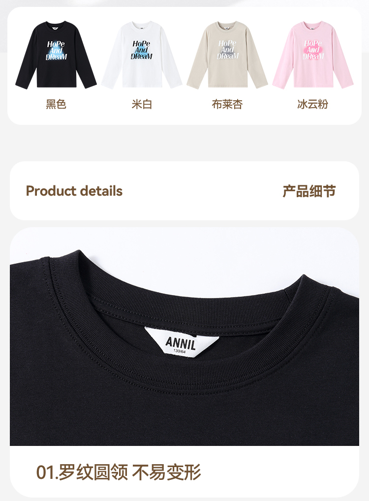 【100%纯棉不闷汗】男女童圆领长袖针织衫秋季新款安奈儿童装EM531506