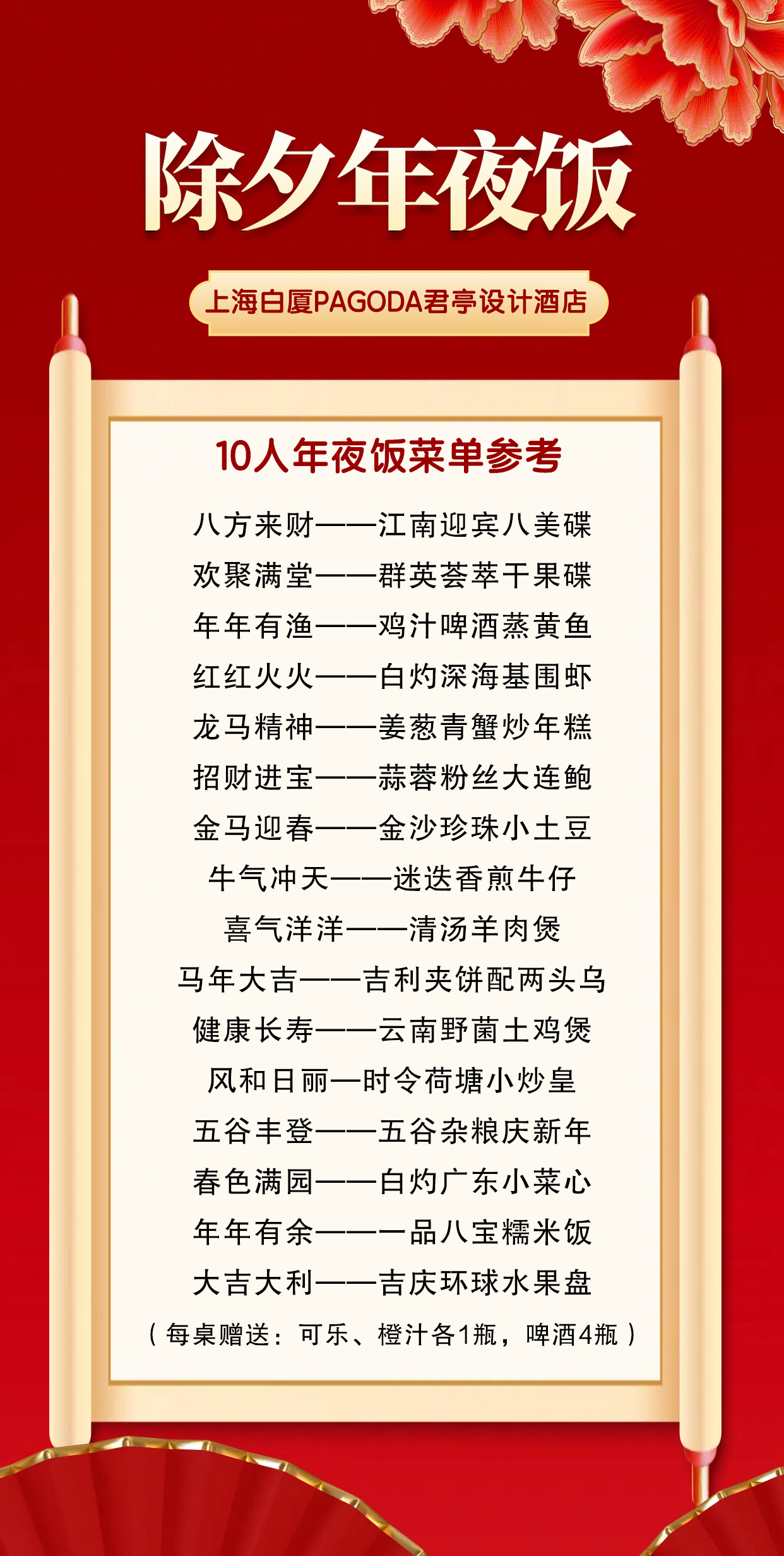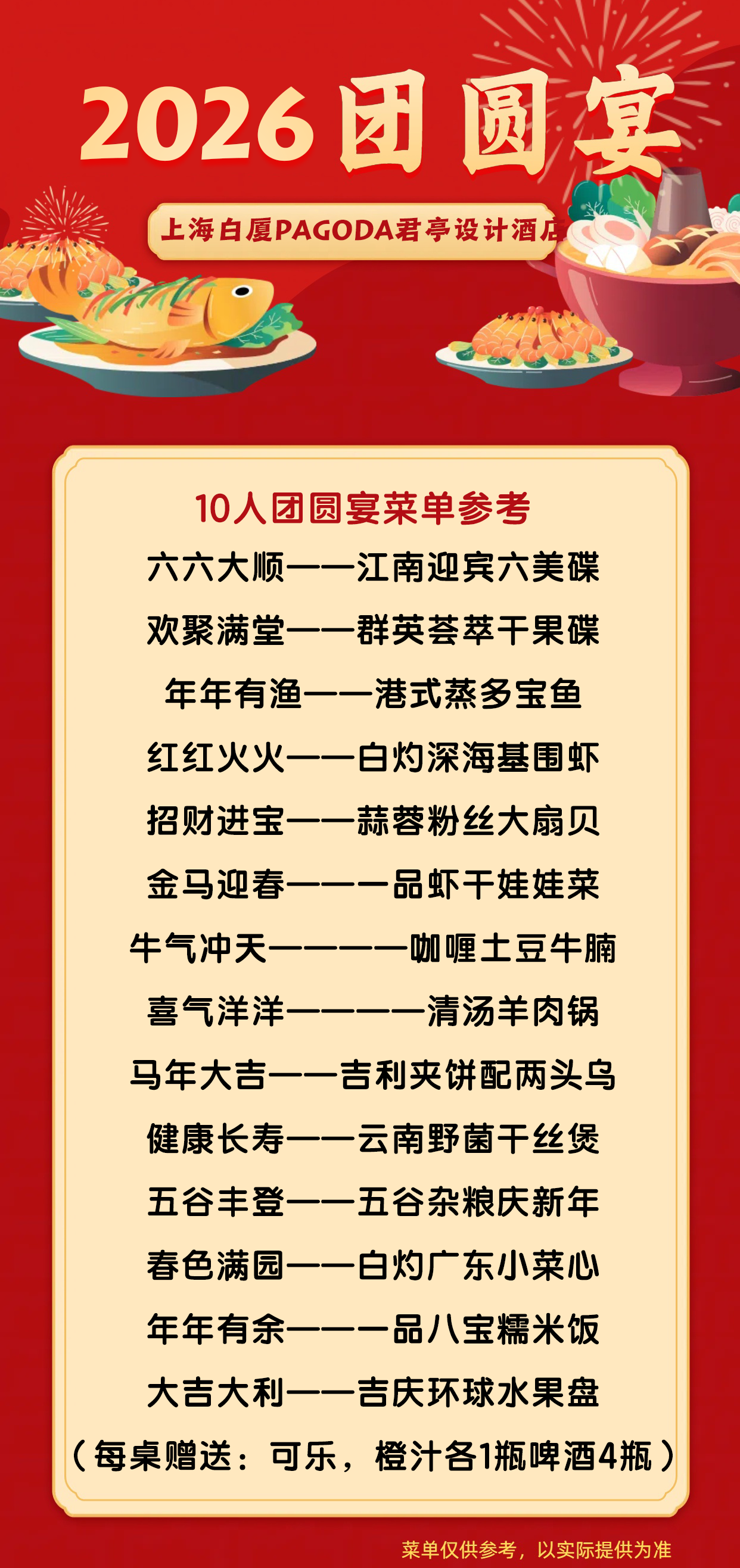 ★沪上年夜饭★ ¥3488起/套【上海白厦Pagoda君亭设计酒店】不出上海,喜迎春节,含4间高级房、10人新春年夜饭桌餐、次日自助早餐~2026年2月16日专享