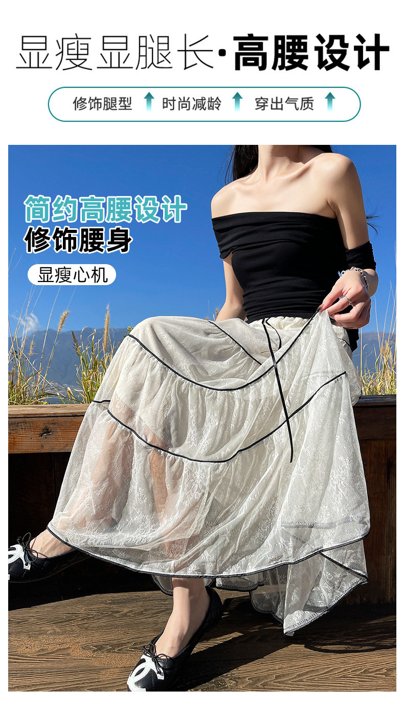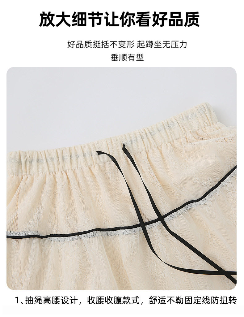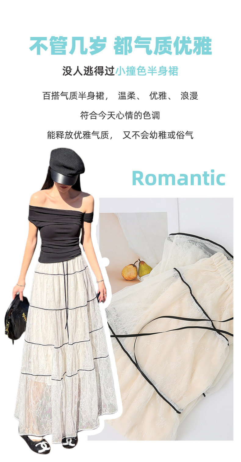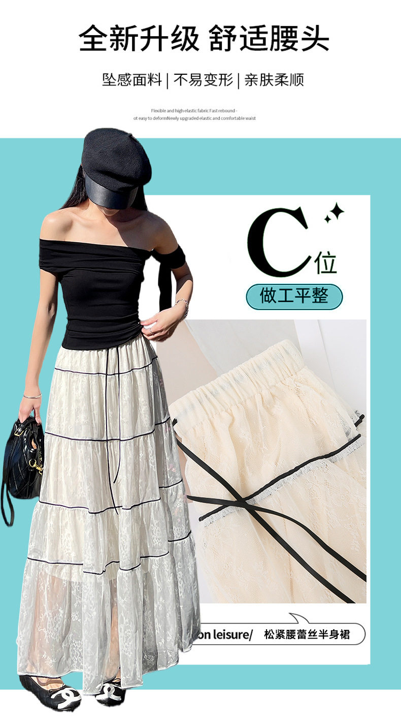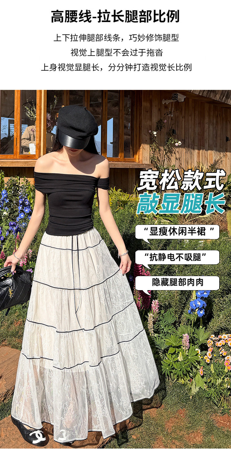 法式浪漫蕾丝边压褶半身裙女春季新款松紧腰遮胯宽松垂感大摆长裙 NDK-J3280