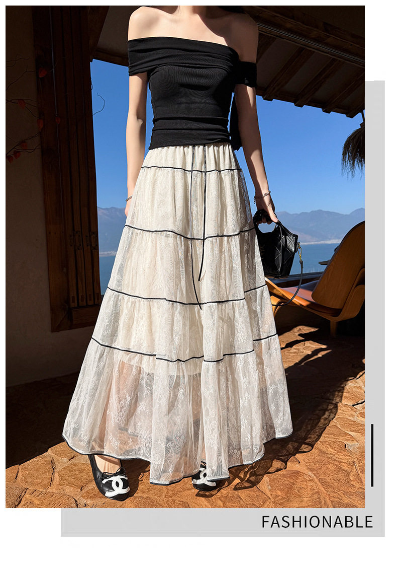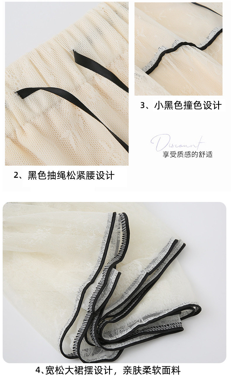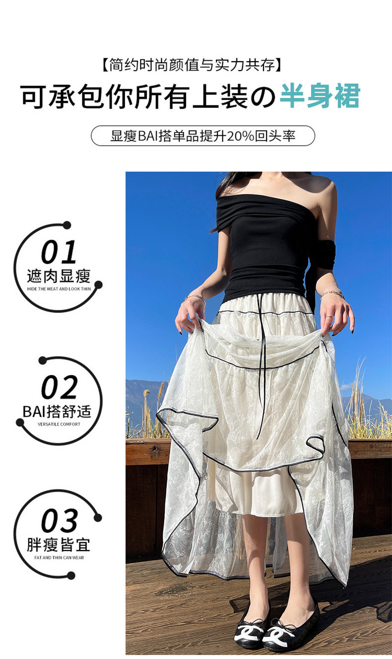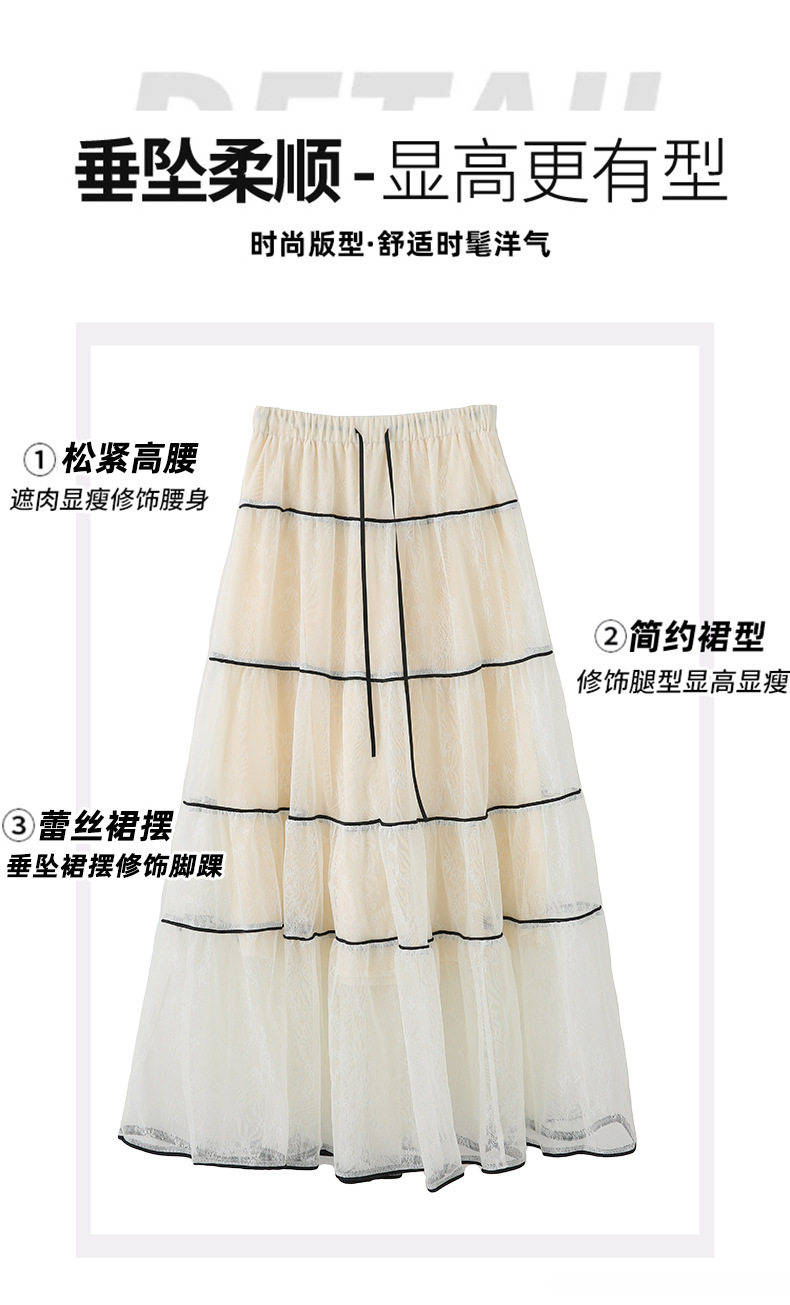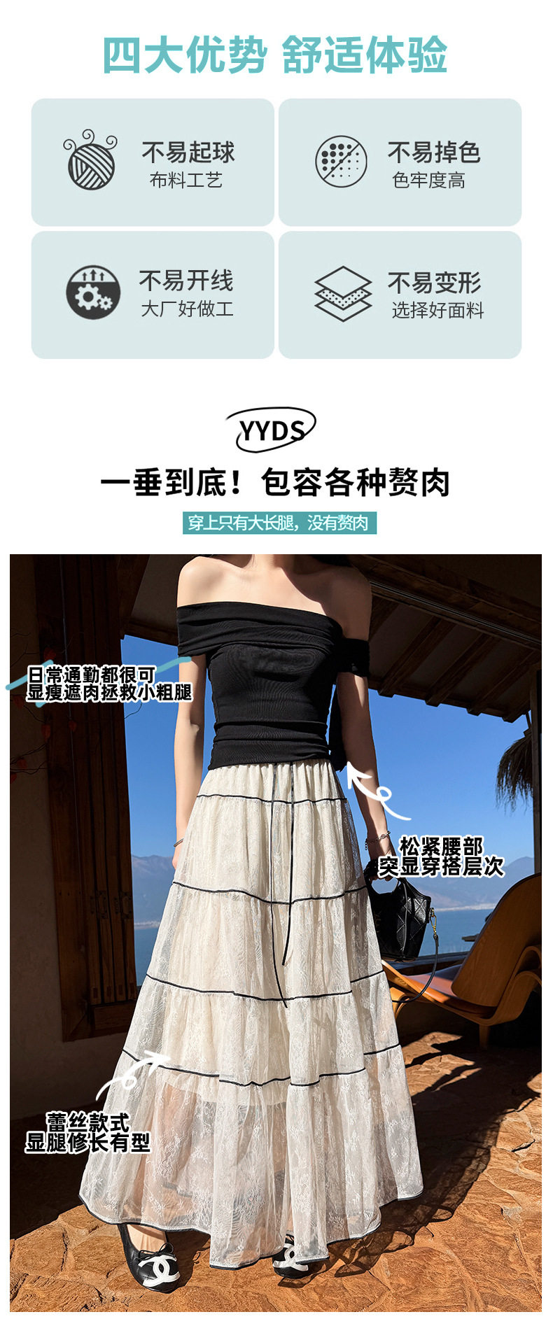 法式浪漫蕾丝边压褶半身裙女春季新款松紧腰遮胯宽松垂感大摆长裙 NDK-J3280
