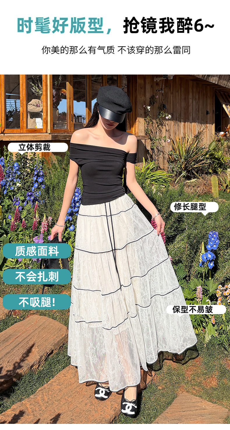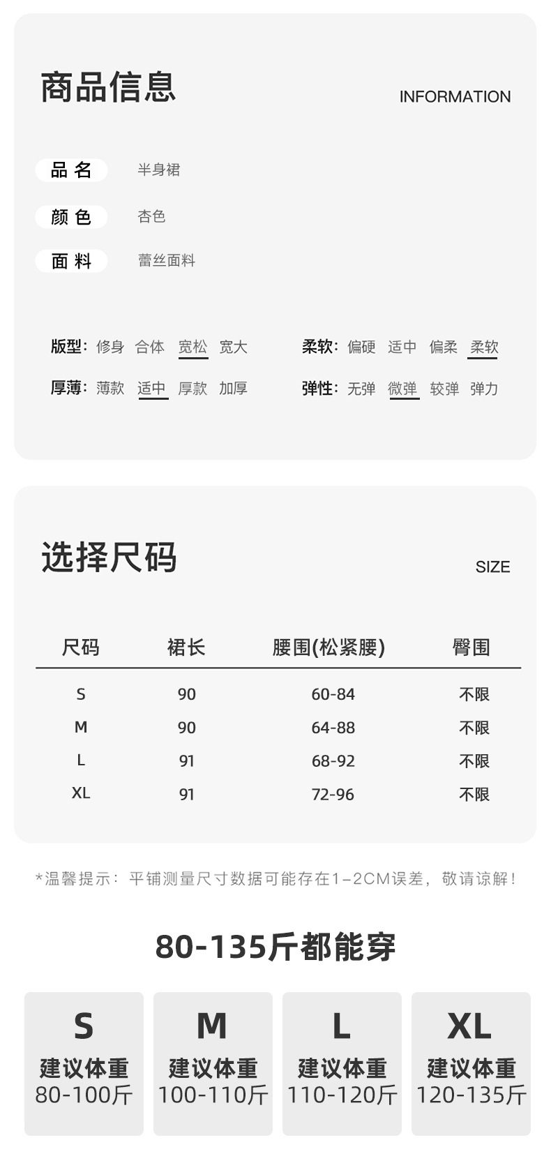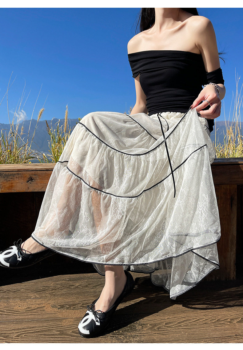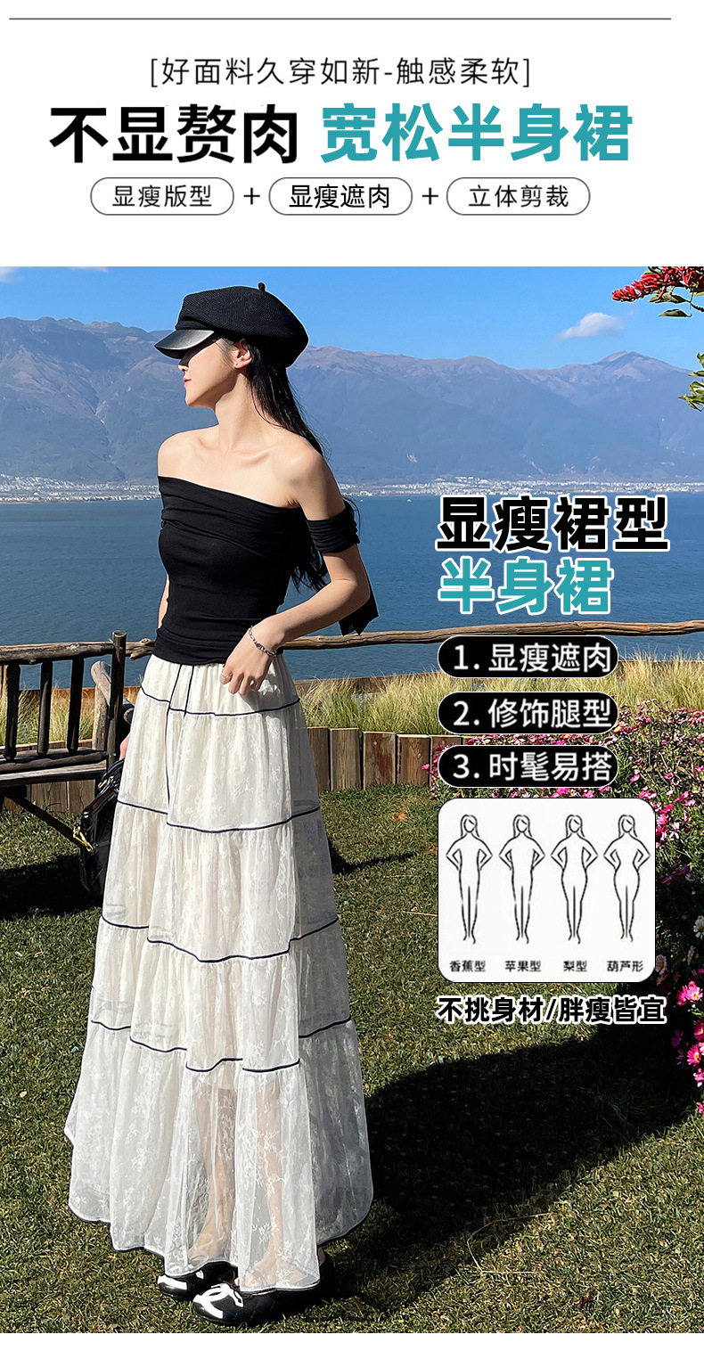 法式浪漫蕾丝边压褶半身裙女春季新款松紧腰遮胯宽松垂感大摆长裙 NDK-J3280