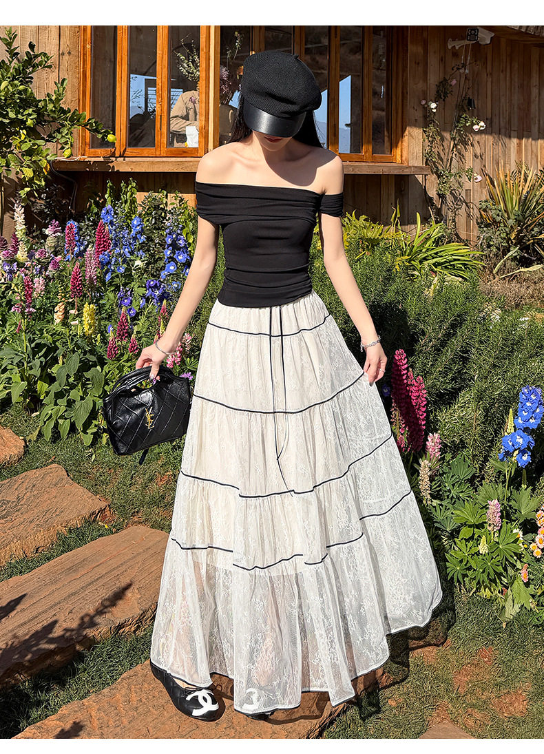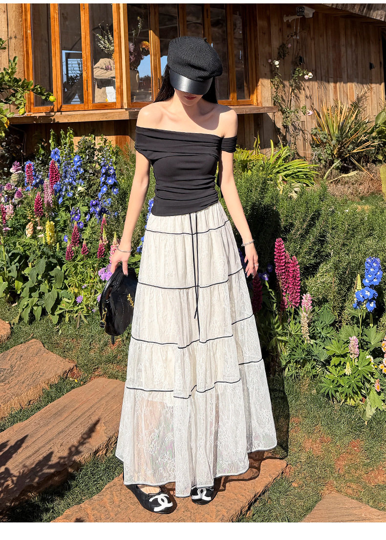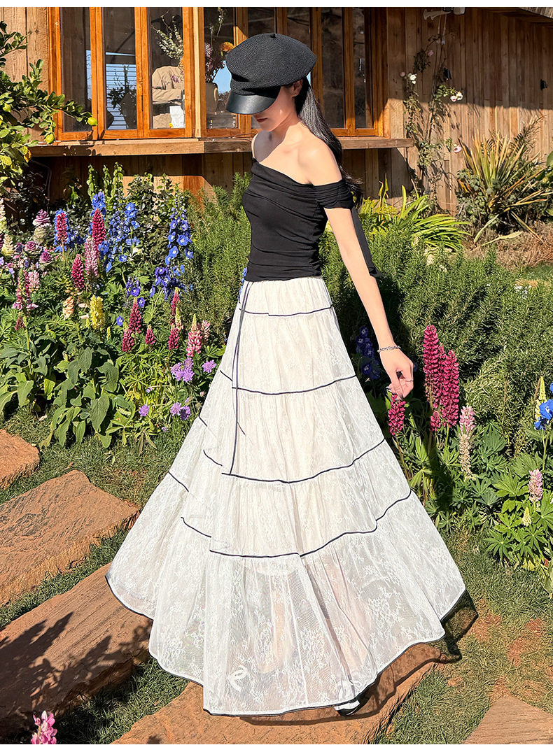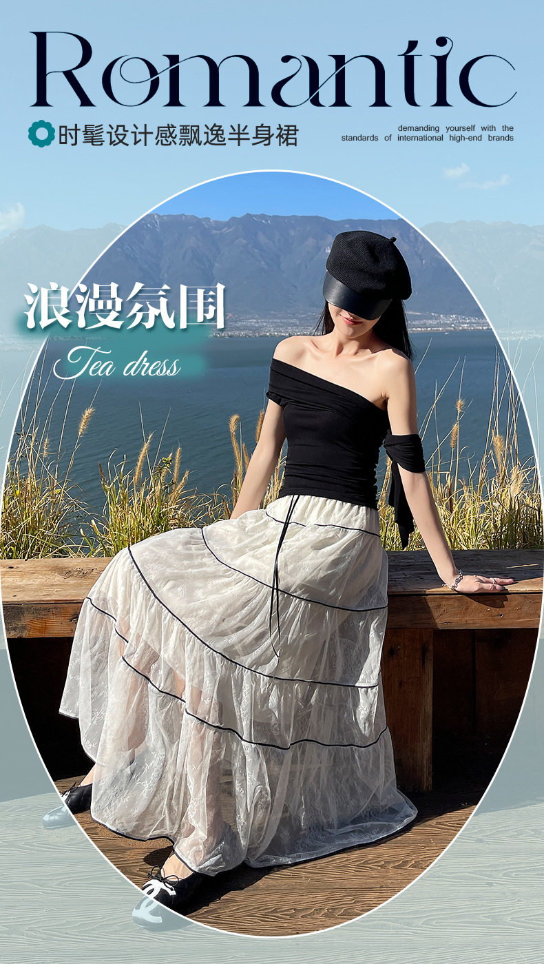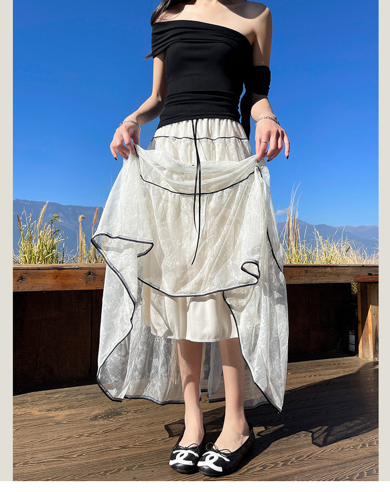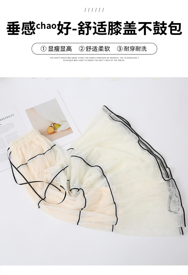 法式浪漫蕾丝边压褶半身裙女春季新款松紧腰遮胯宽松垂感大摆长裙 NDK-J3280