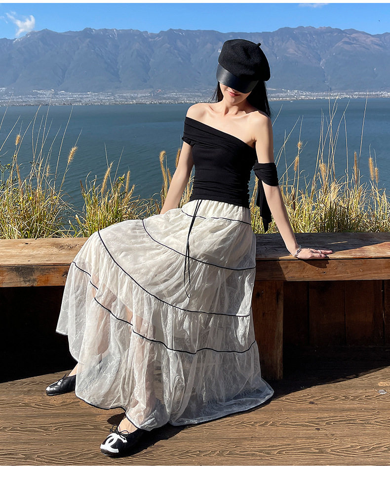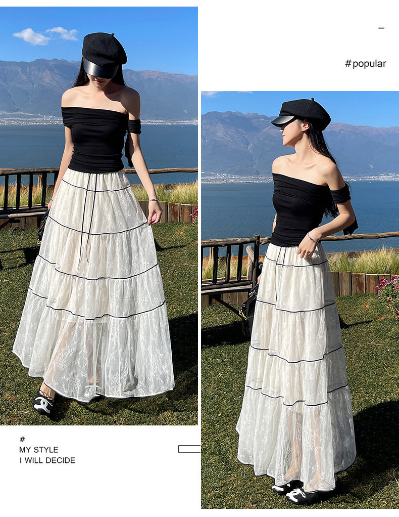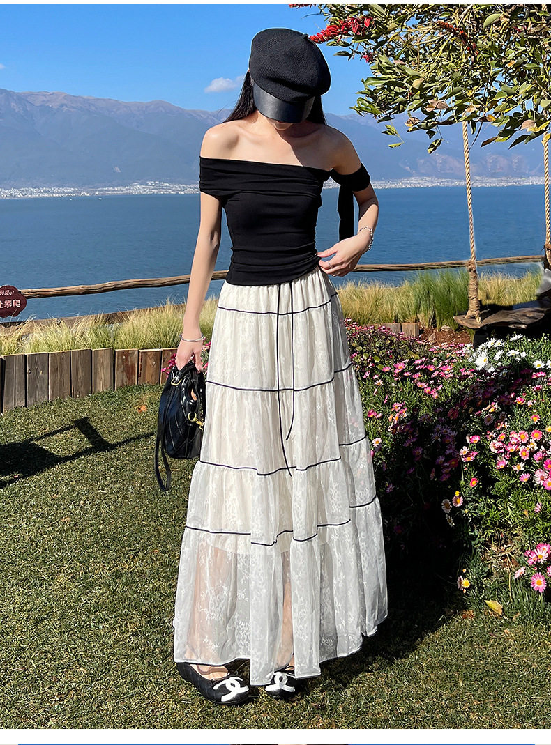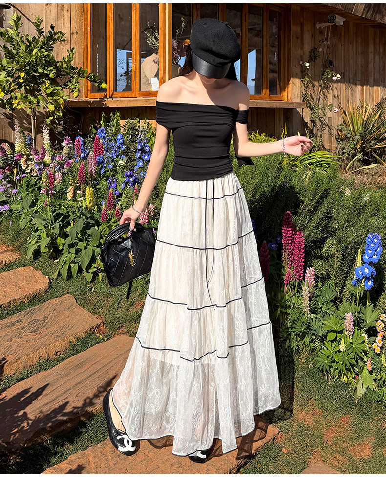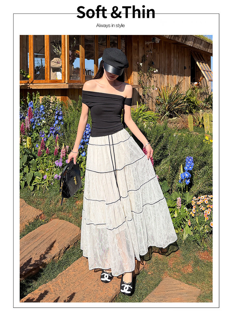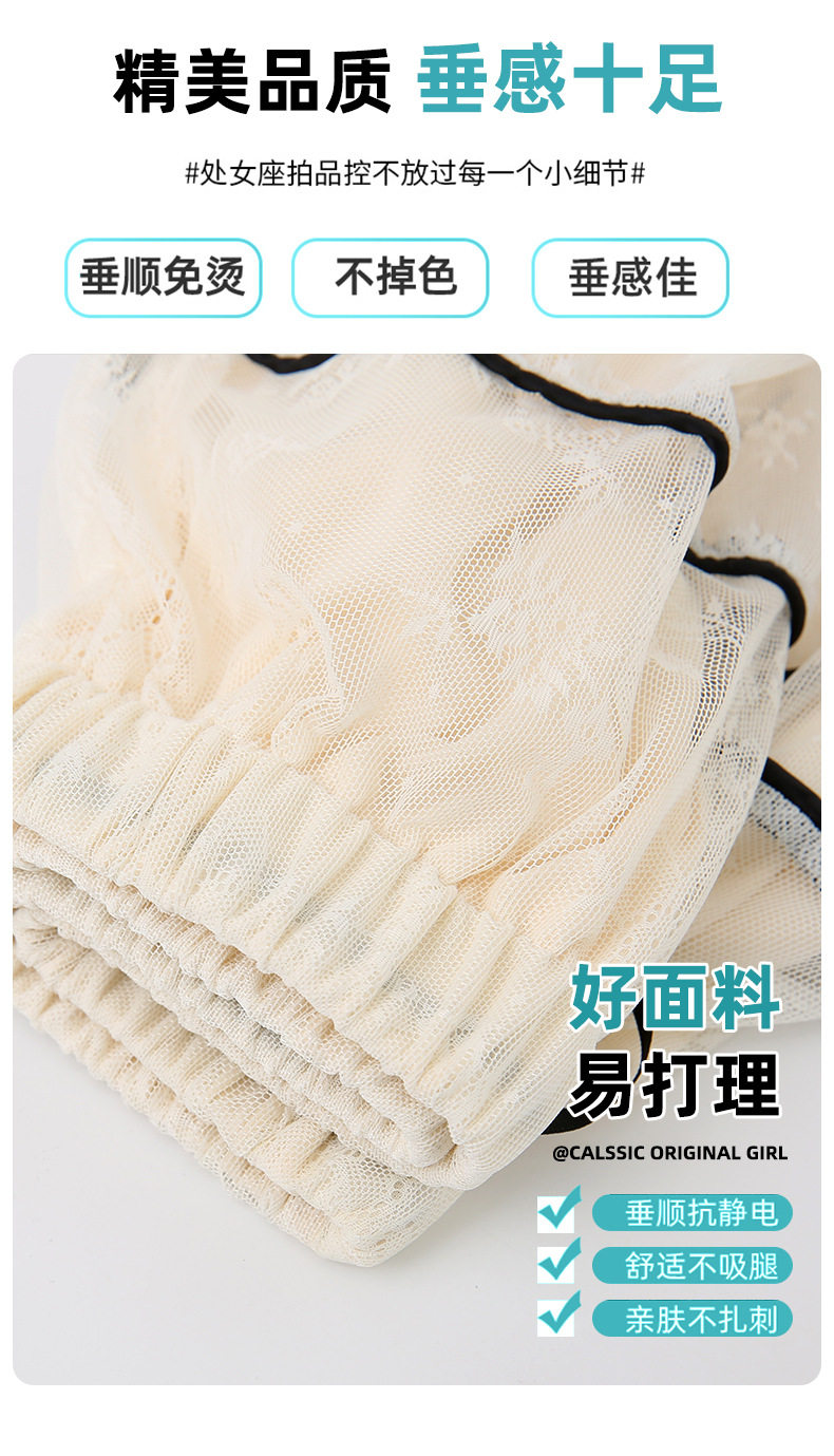 法式浪漫蕾丝边压褶半身裙女春季新款松紧腰遮胯宽松垂感大摆长裙 NDK-J3280