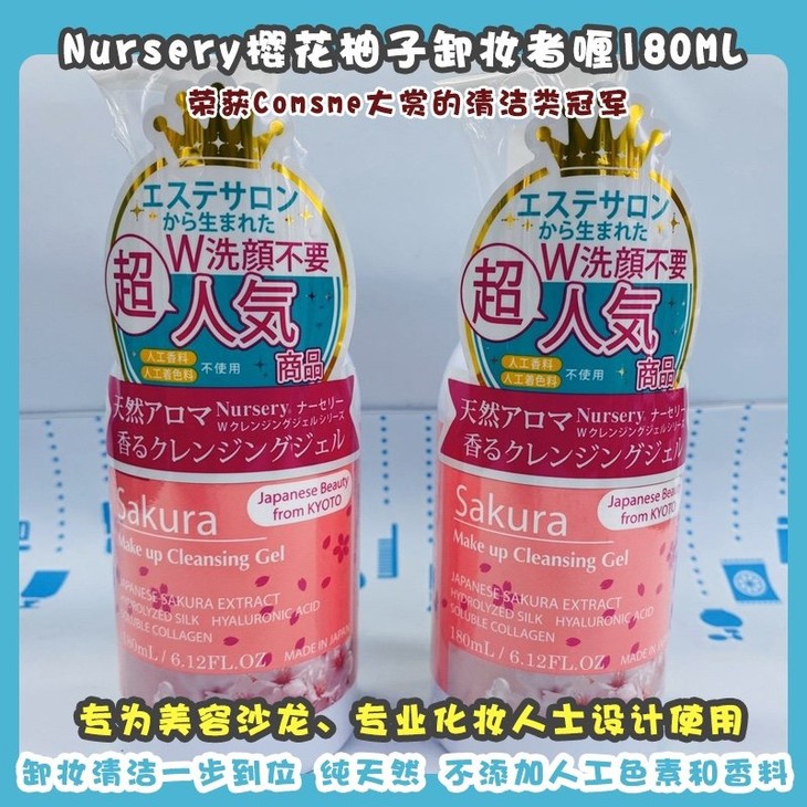 Nursery樱花柚子卸妆者喱180ML 👍这款NURSERY舒缓卸妆啫喱没法不火🔥,曾荣获Comsme大赏的清洁类冠军👏。它的定位是专业卸妆产品,专为美容沙龙、专业化妆人士设计使用✔。啫喱状质地💧,温和不油腻,清洁力强,哪怕非常难卸的彩妆、眼妆均可轻松卸除👀,并且卸妆清洁一步到位。纯天然🍃,不添加人工色素和香料❌~