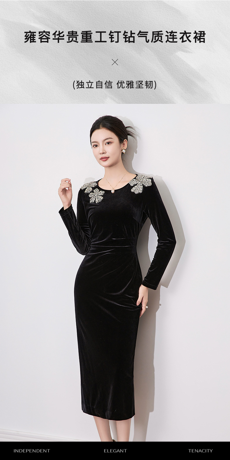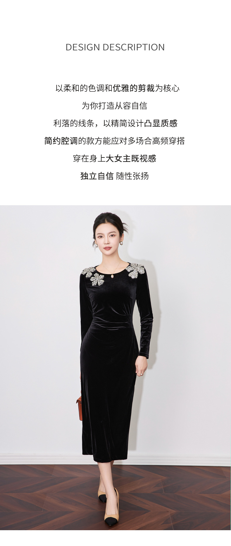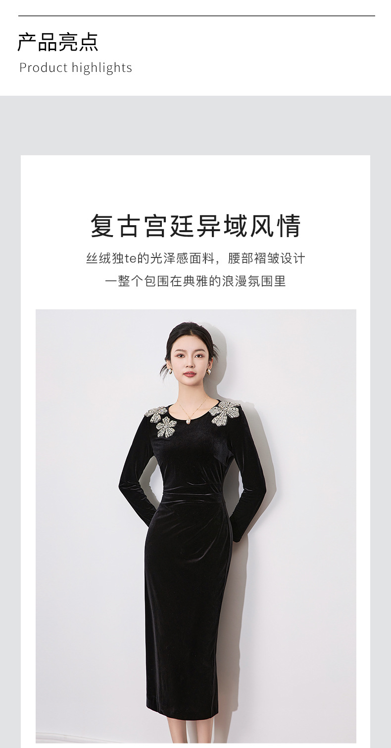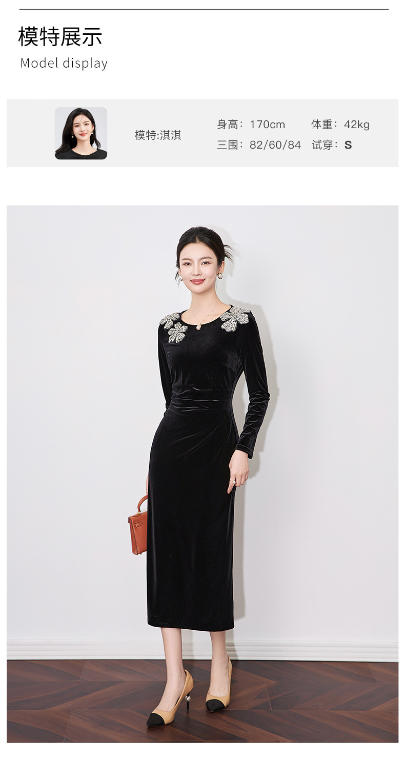 【高货wl】全新升级【铂金会员312/天猫419/差价107】(42554) 洛诗琳早春钉珠花朵丝绒长袖高级感修身气质中式连衣裙