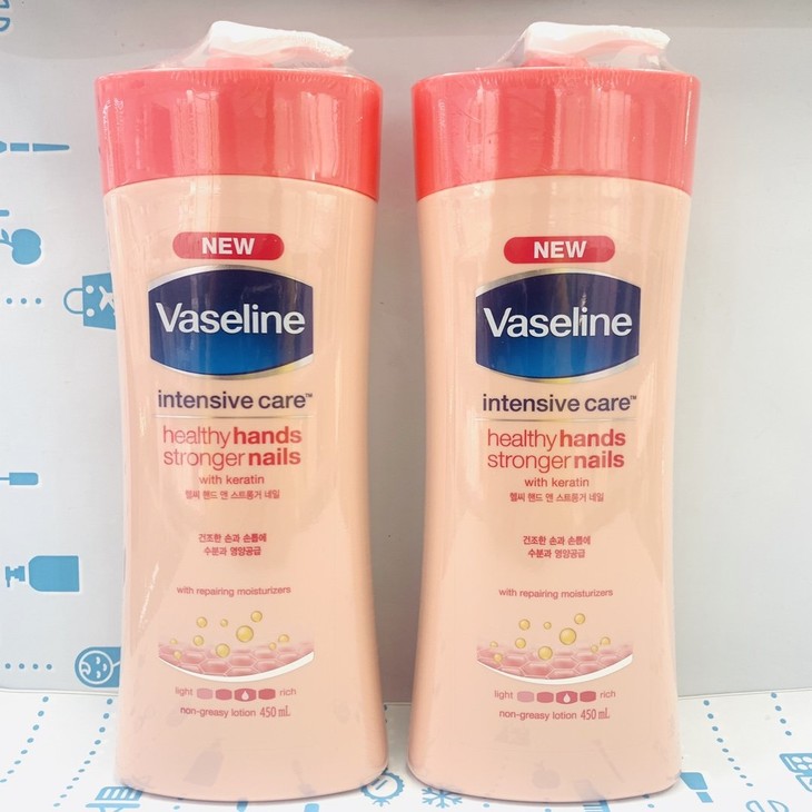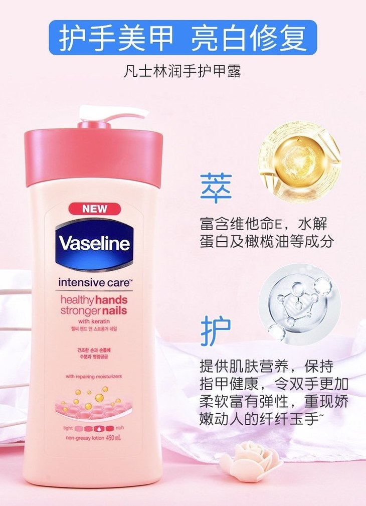 凡士林润肤露450ml👍销售霸主🔥,高性价比润肤身体乳。💚#绿色款含独特芦荟萃取精华,清爽易吸收,可帮助肌肤补充水分💦、保湿及柔软肌肤,夏天用也毫不油腻,适合一般肌肤及油性肌肤使用,感受肌肤喝饱水的清透水感。❤#红色款富含维他命E、烟酰胺等成分,提亮修复,保持指甲健康💅,令双手更加柔软富有弹性。
