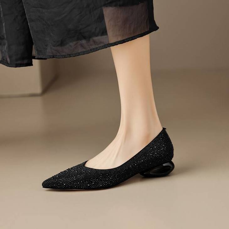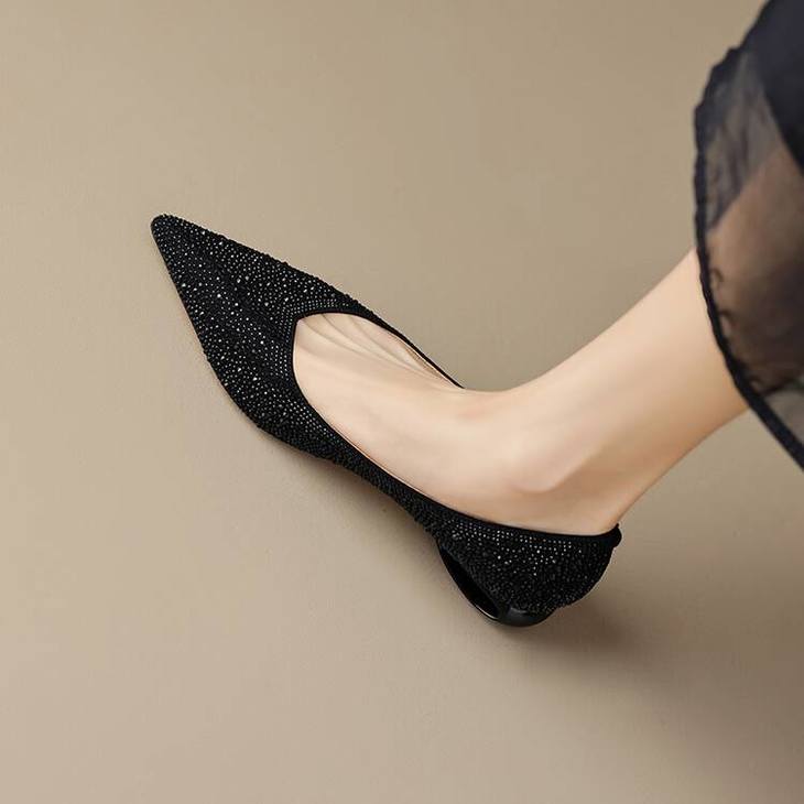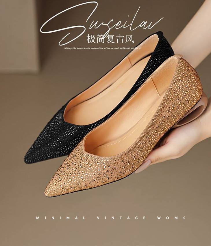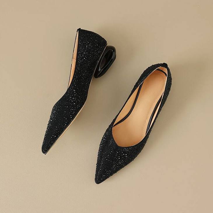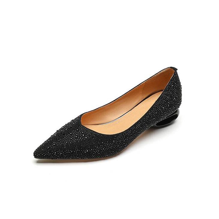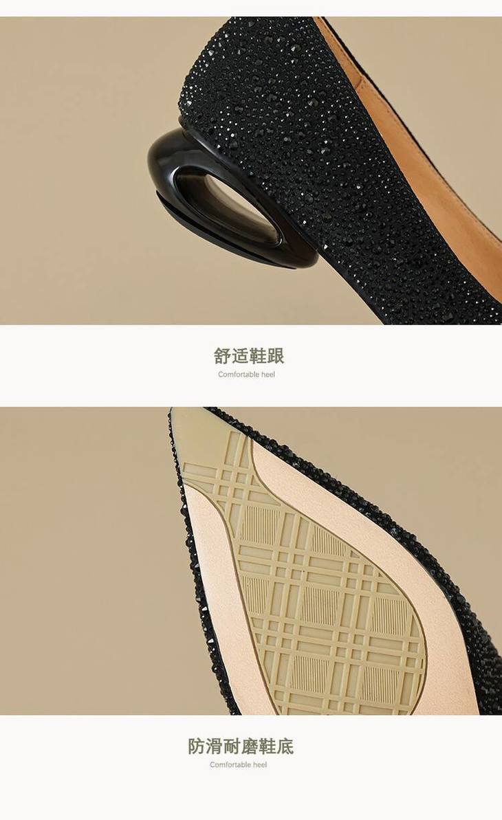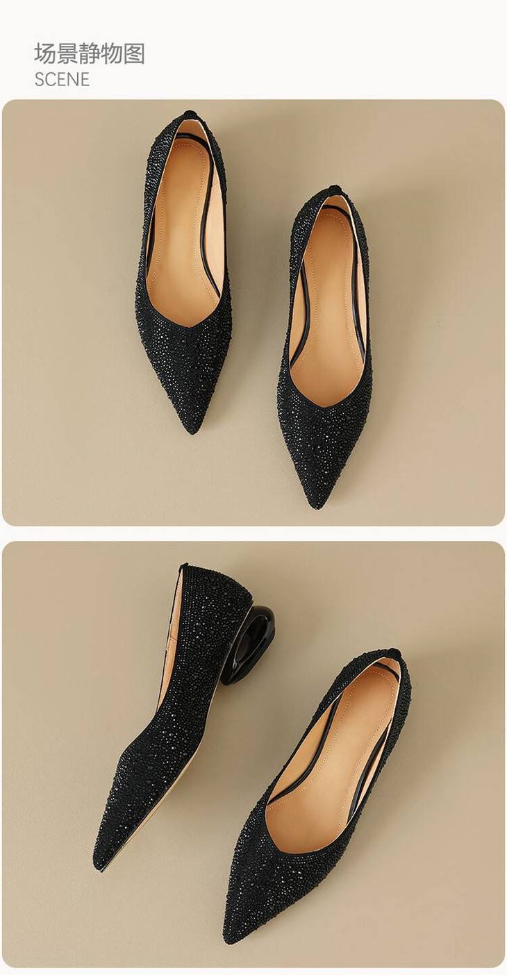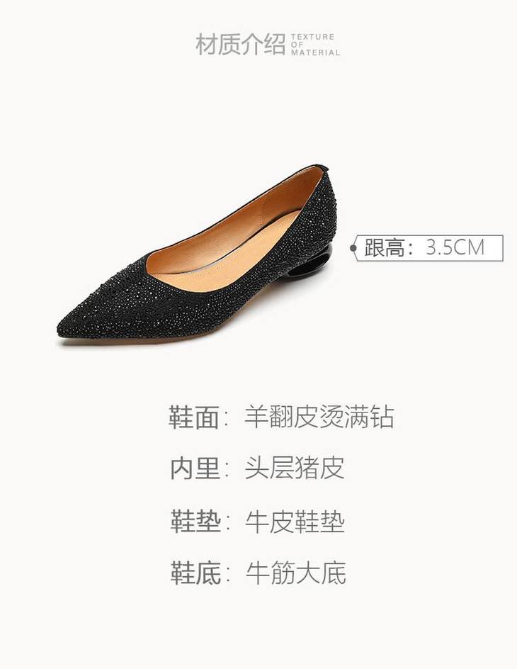 【预售5天】新款尖头真皮中跟磨砂单鞋浅口时装鞋欧美舒适粗跟水钻女鞋夏QJR&G167-9