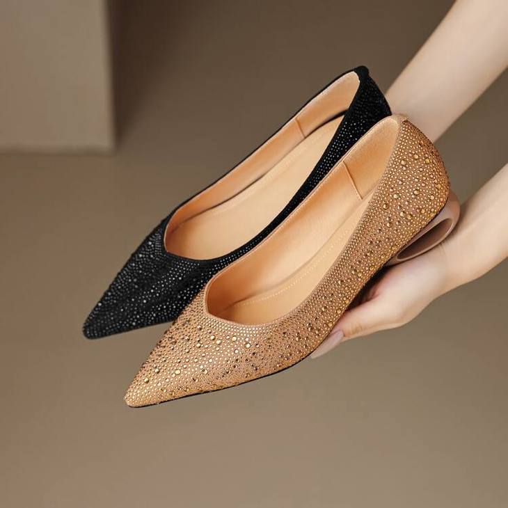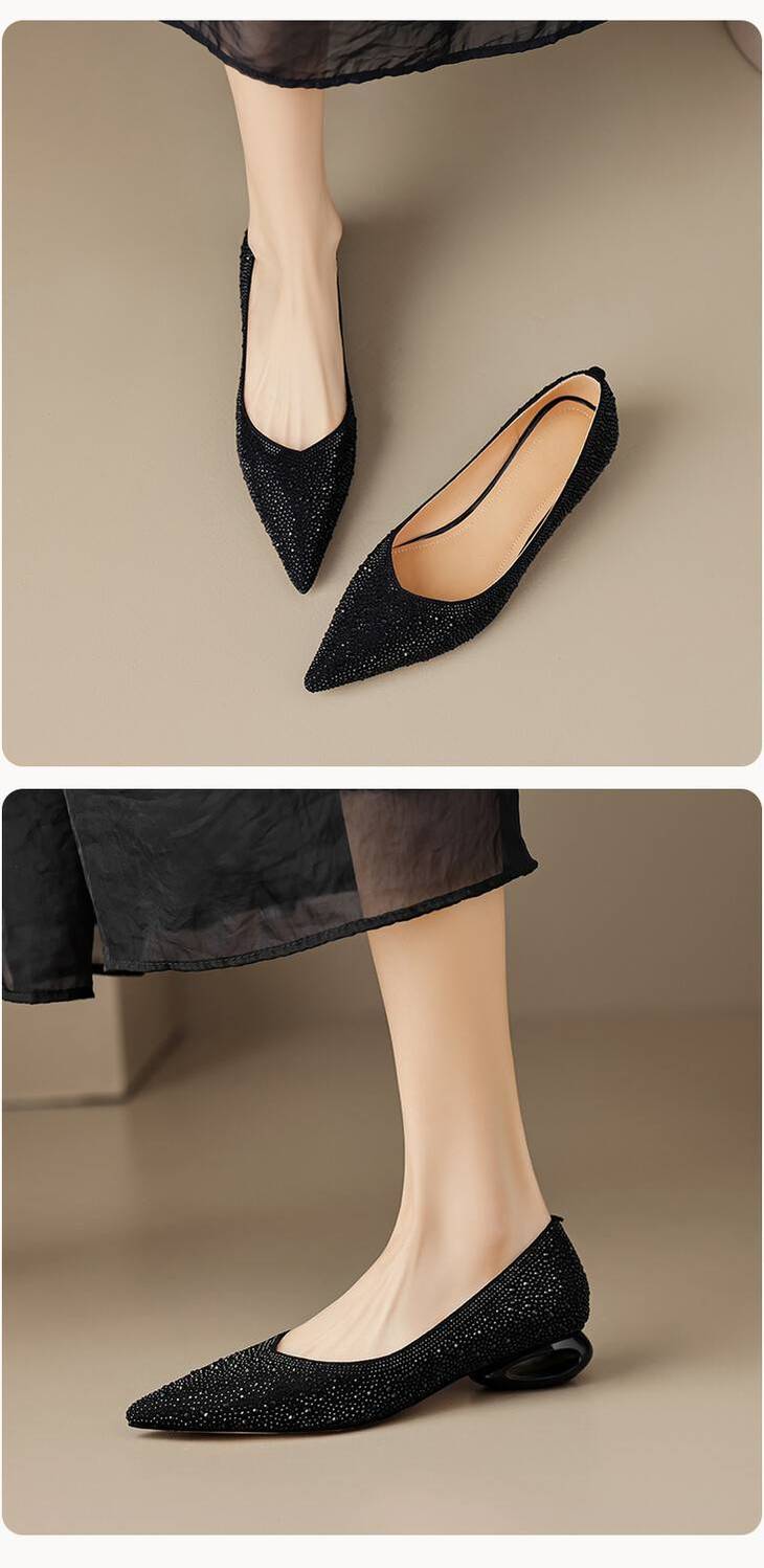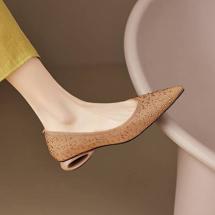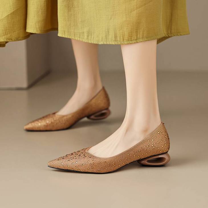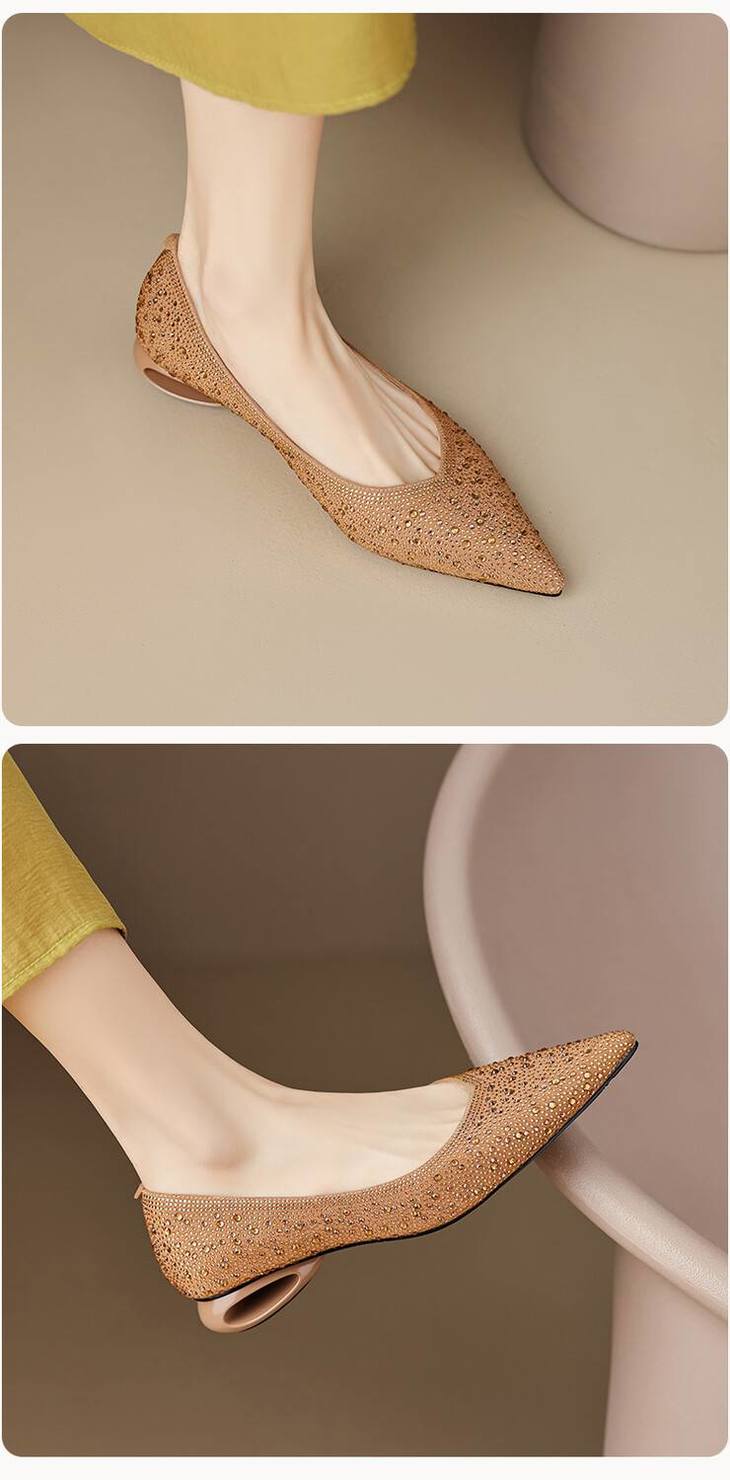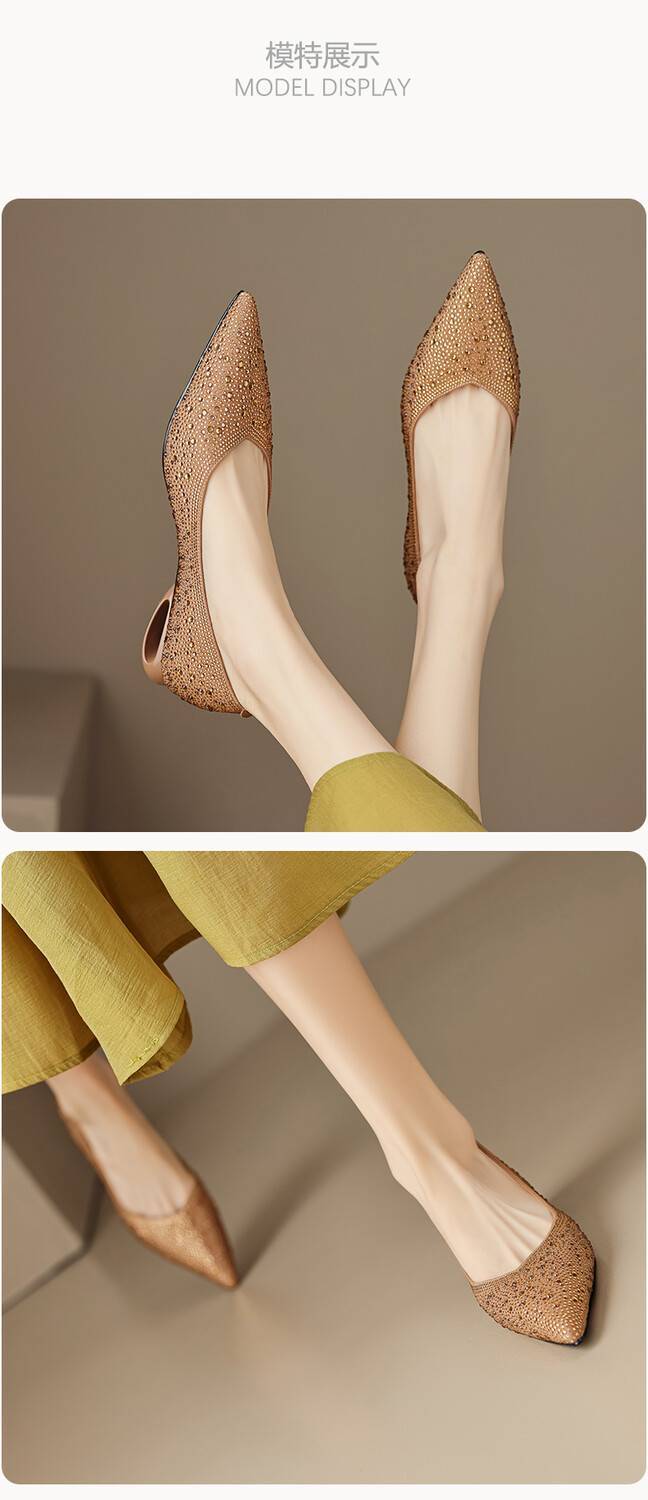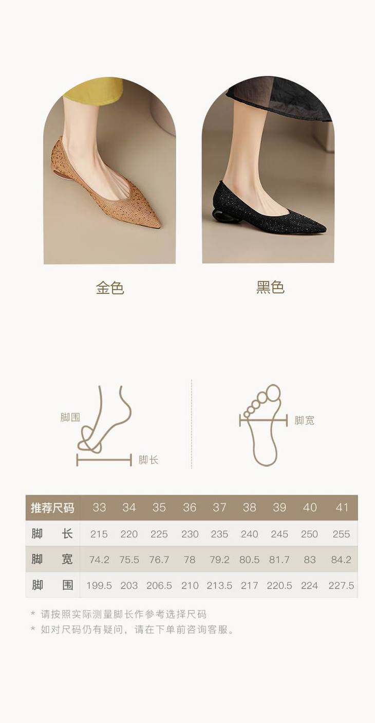 【预售5天】新款尖头真皮中跟磨砂单鞋浅口时装鞋欧美舒适粗跟水钻女鞋夏QJR&G167-9