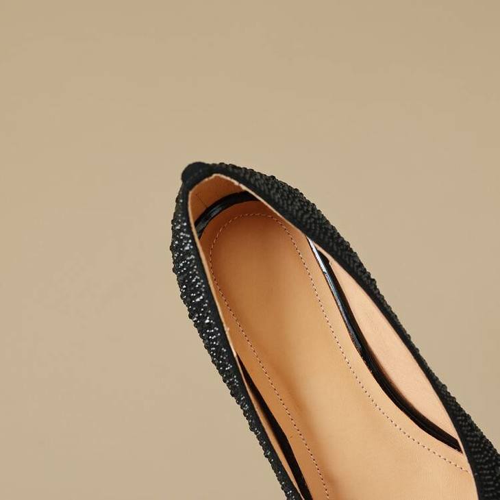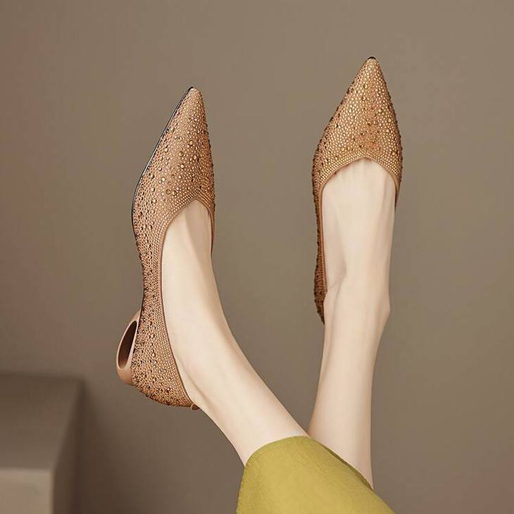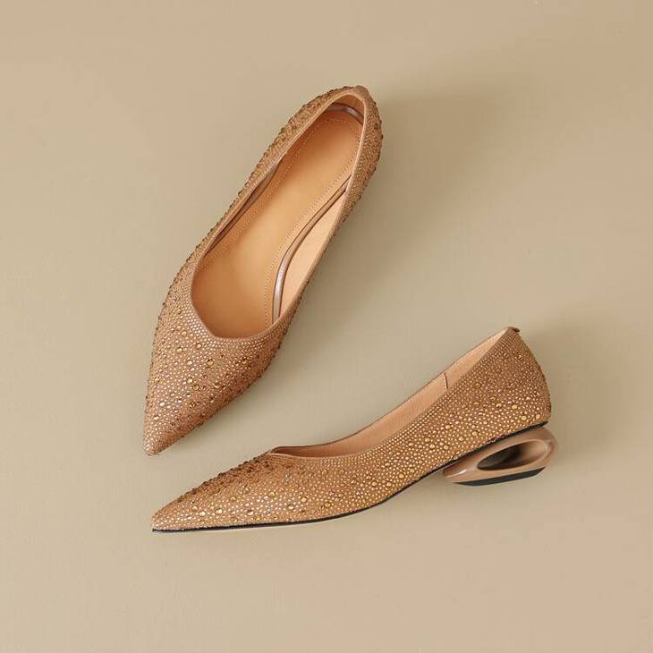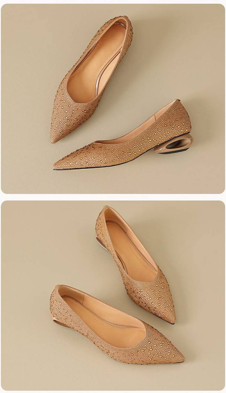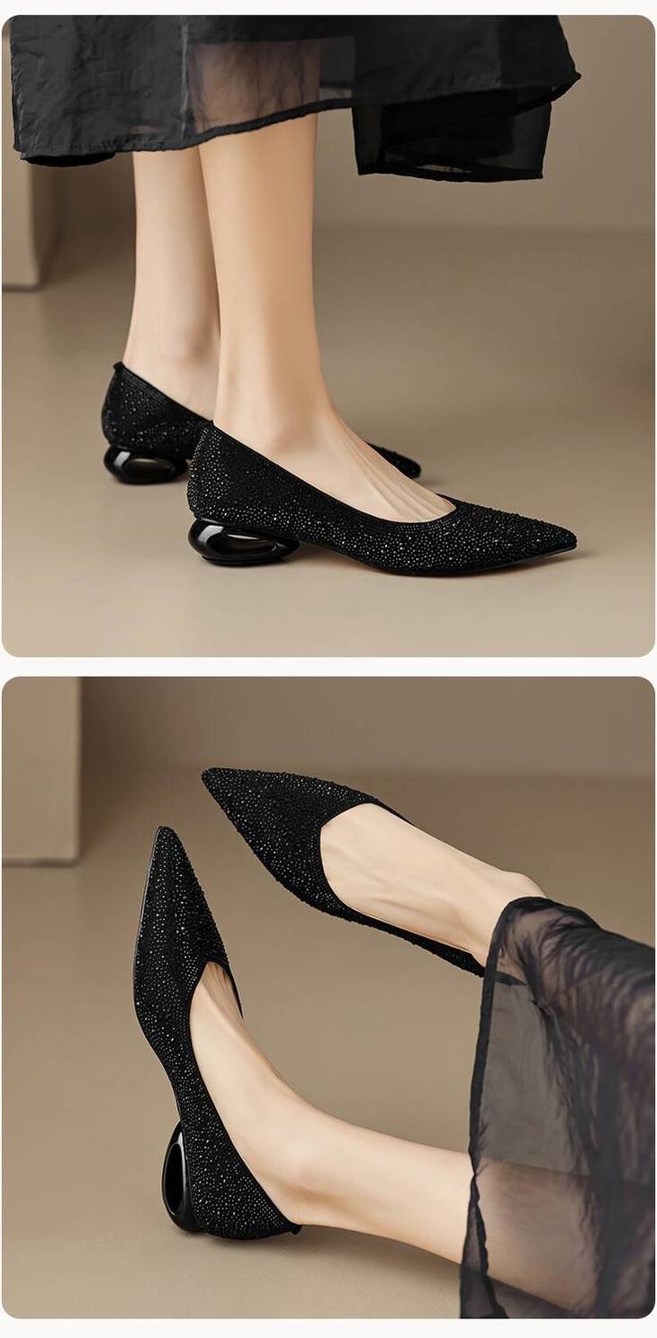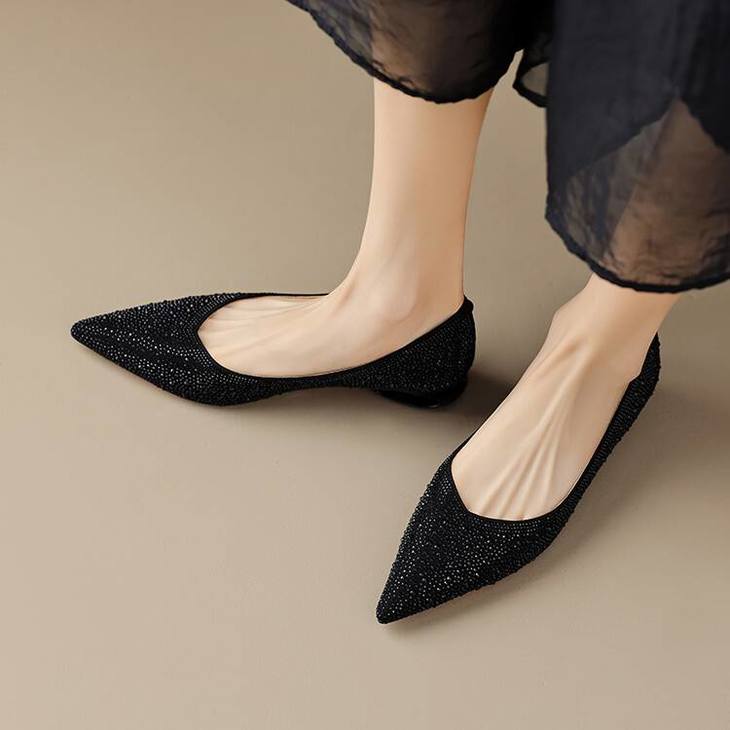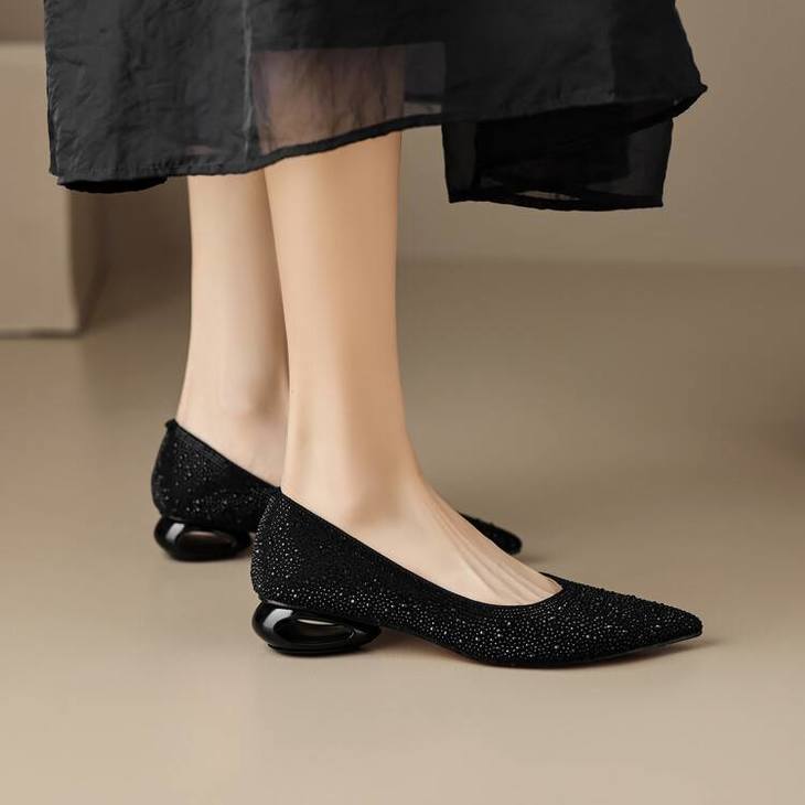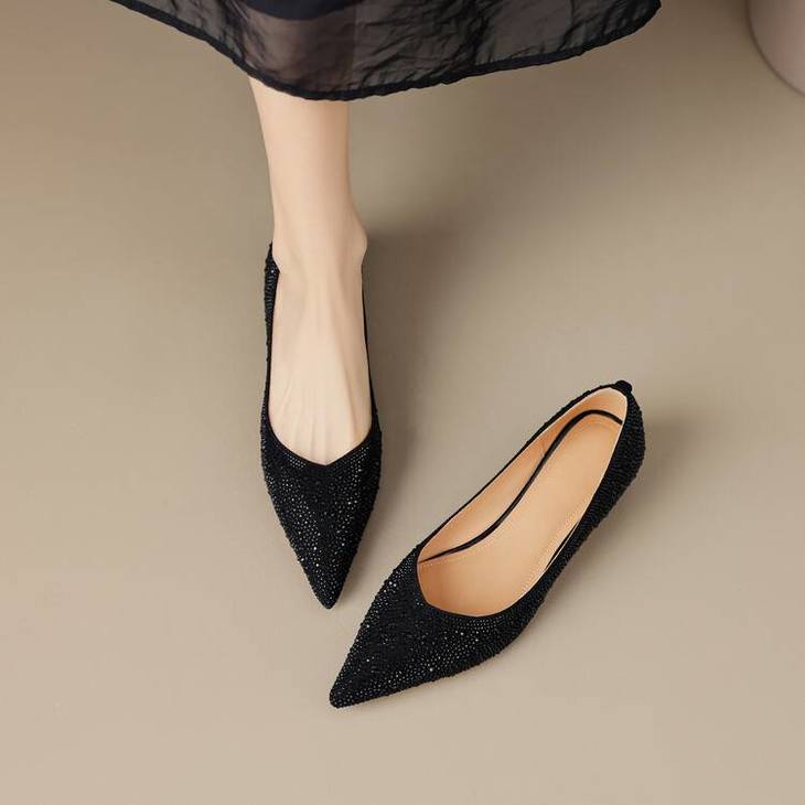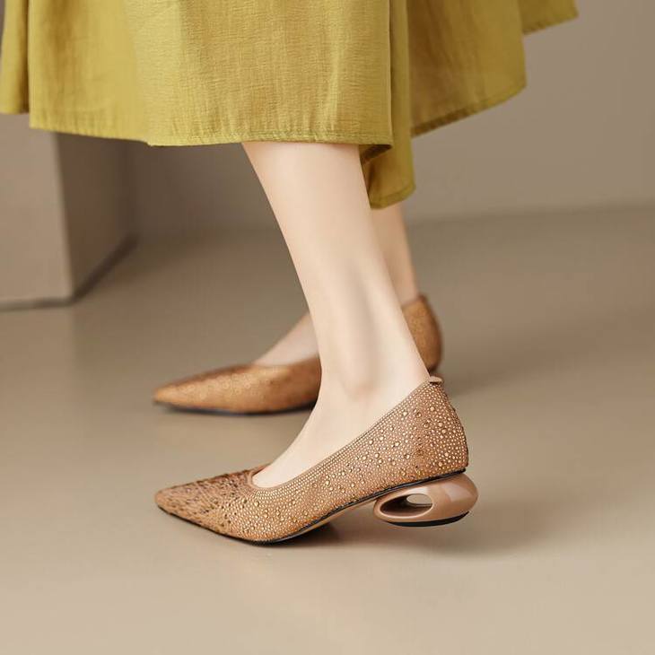 【预售5天】新款尖头真皮中跟磨砂单鞋浅口时装鞋欧美舒适粗跟水钻女鞋夏QJR&G167-9