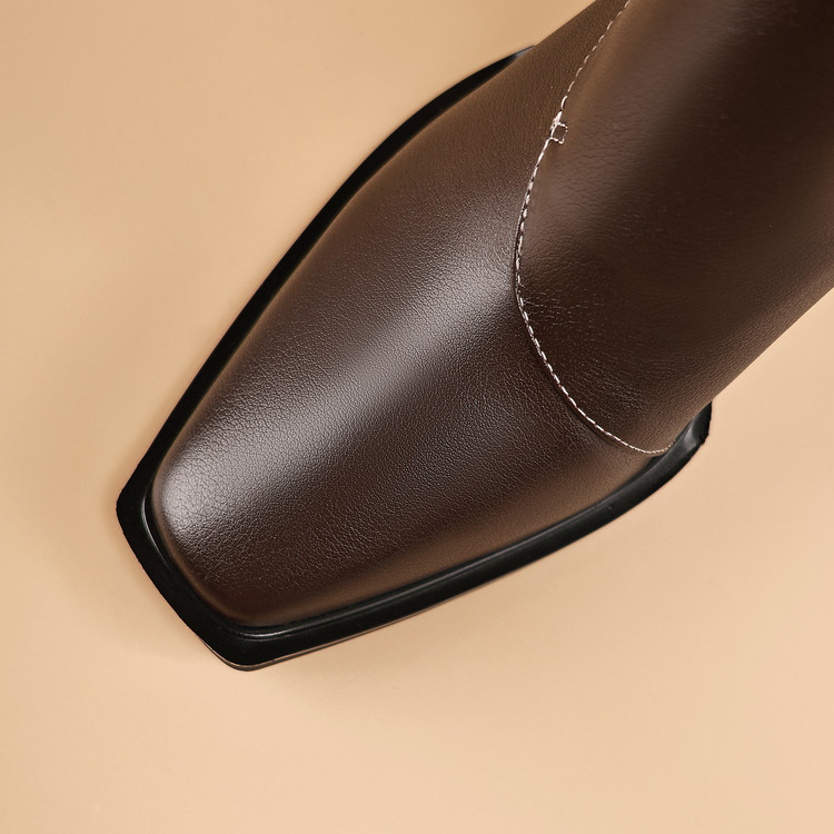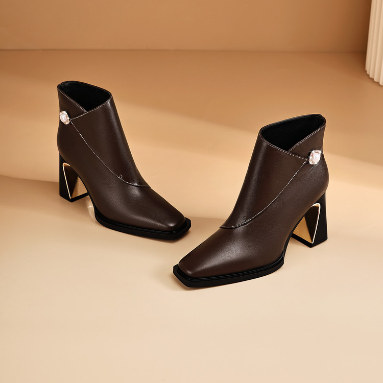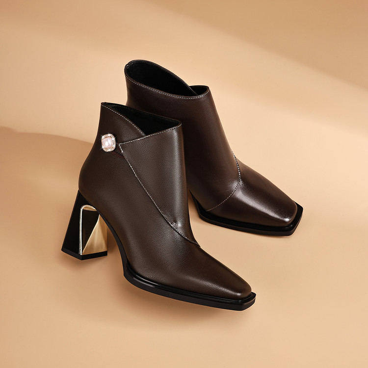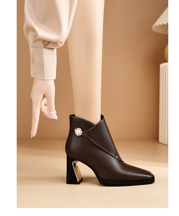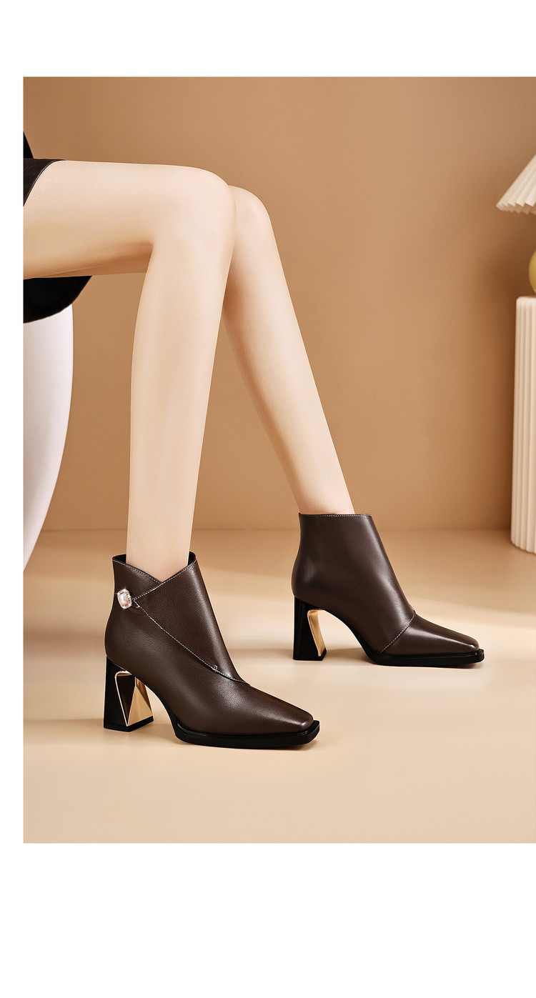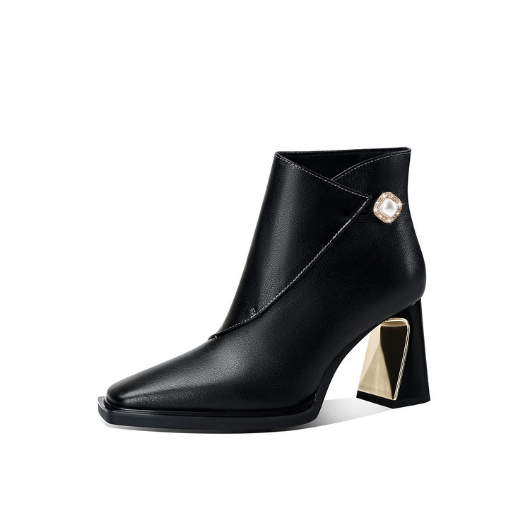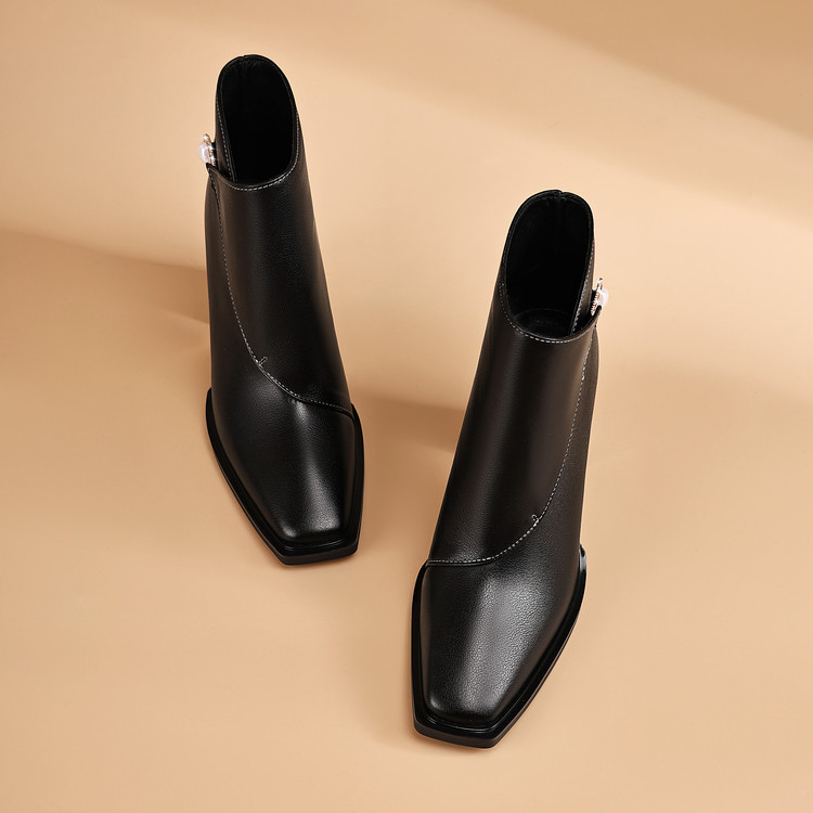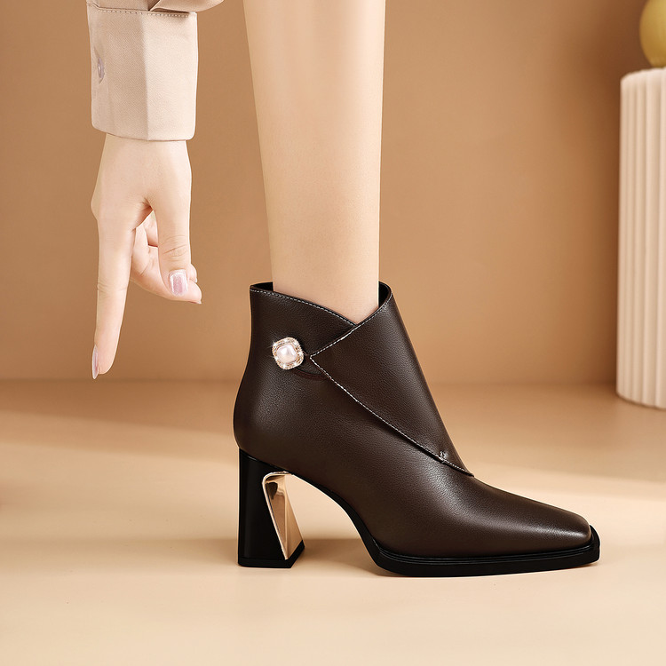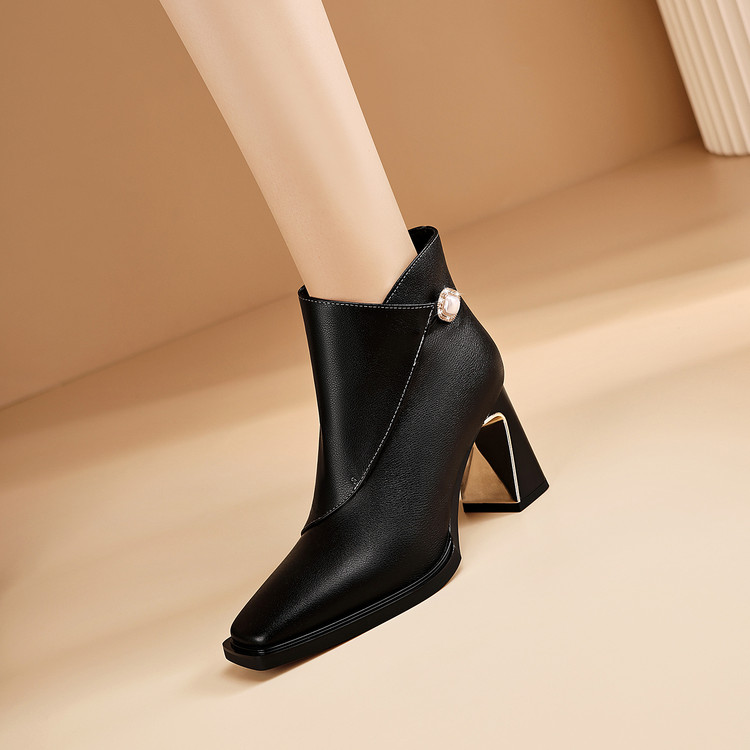 【预售5天】黑色真皮短靴女春秋单靴粗跟妈妈鞋高跟新款冬季加绒方头女靴JZX&D05-82