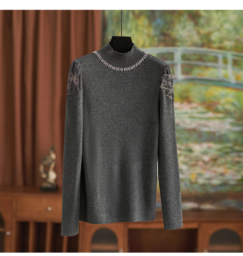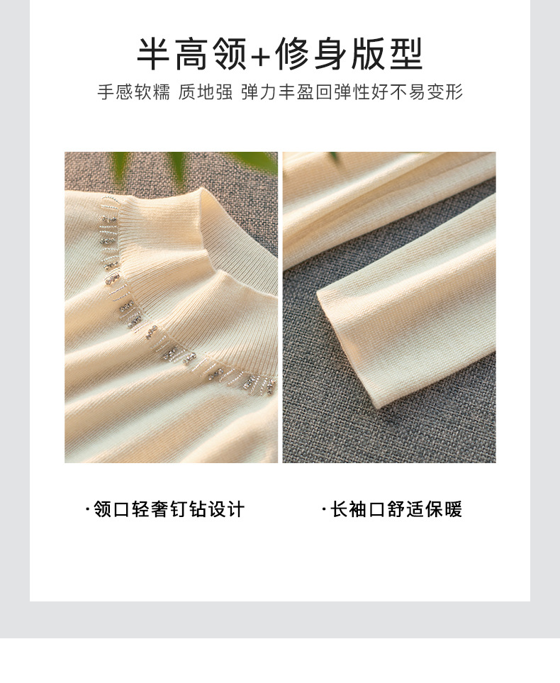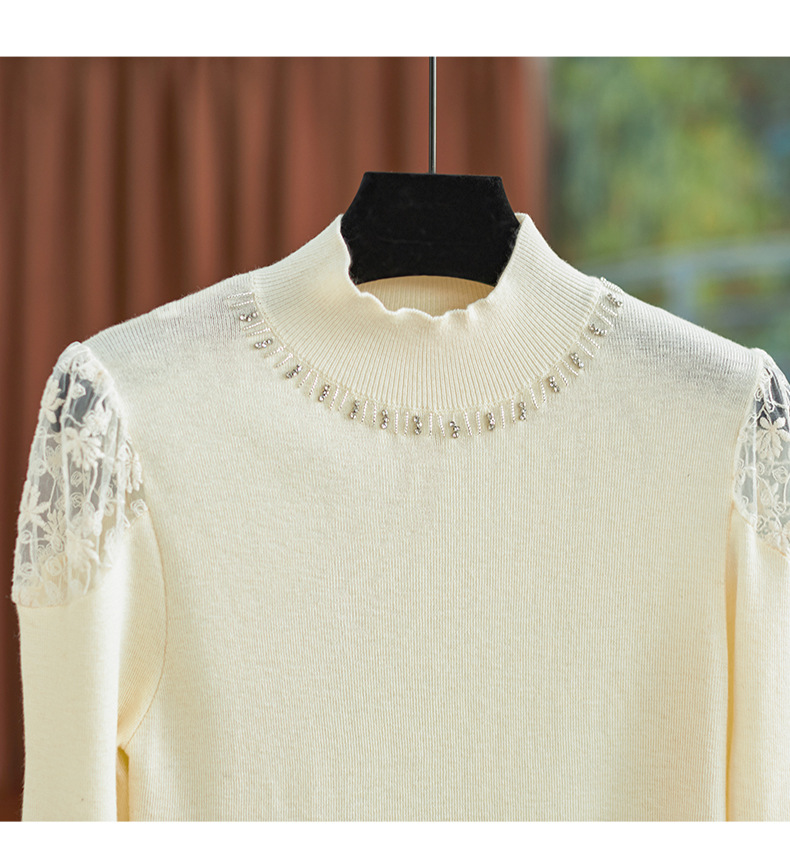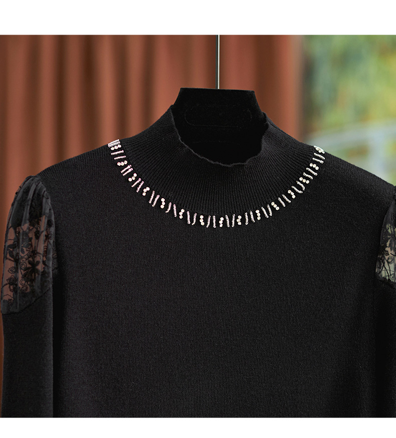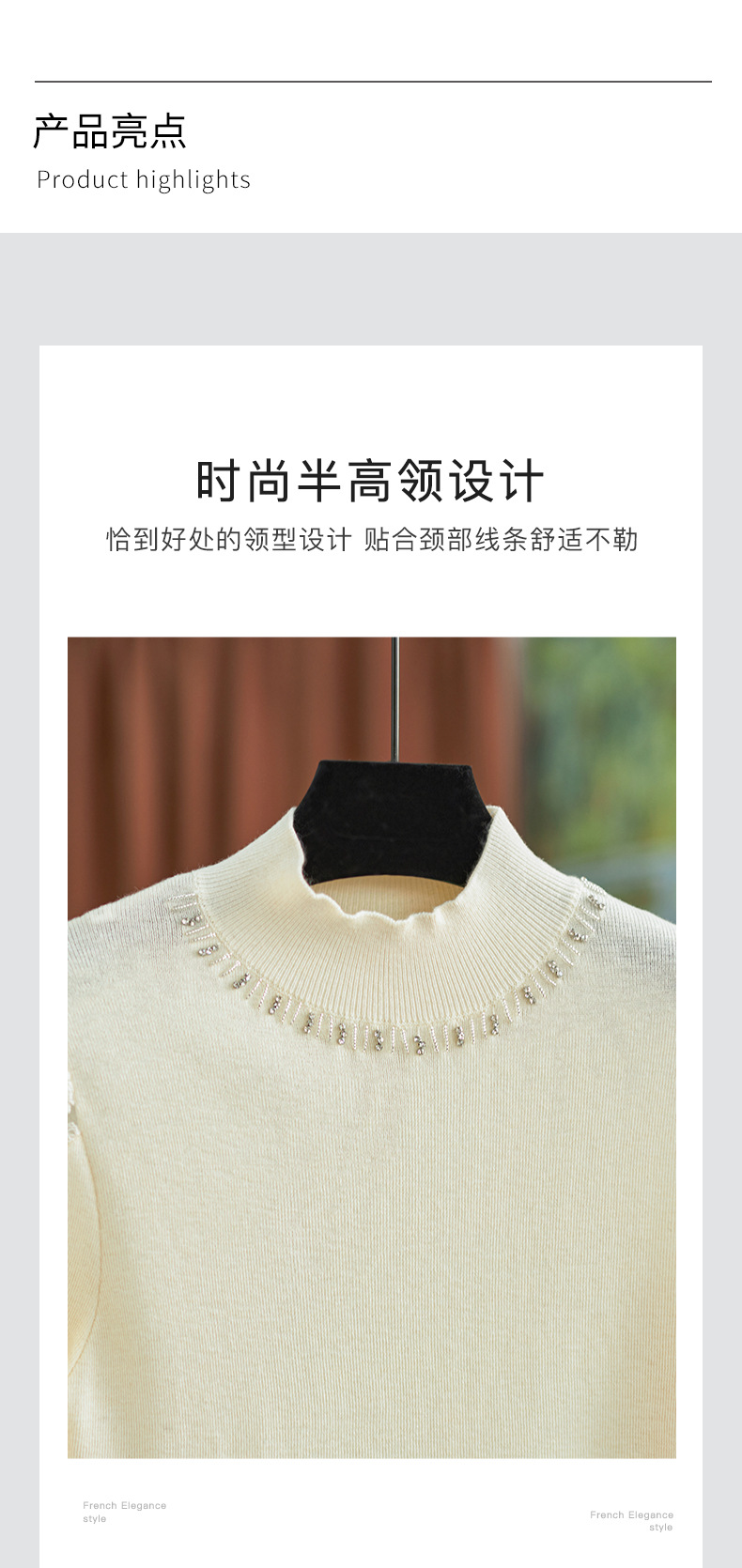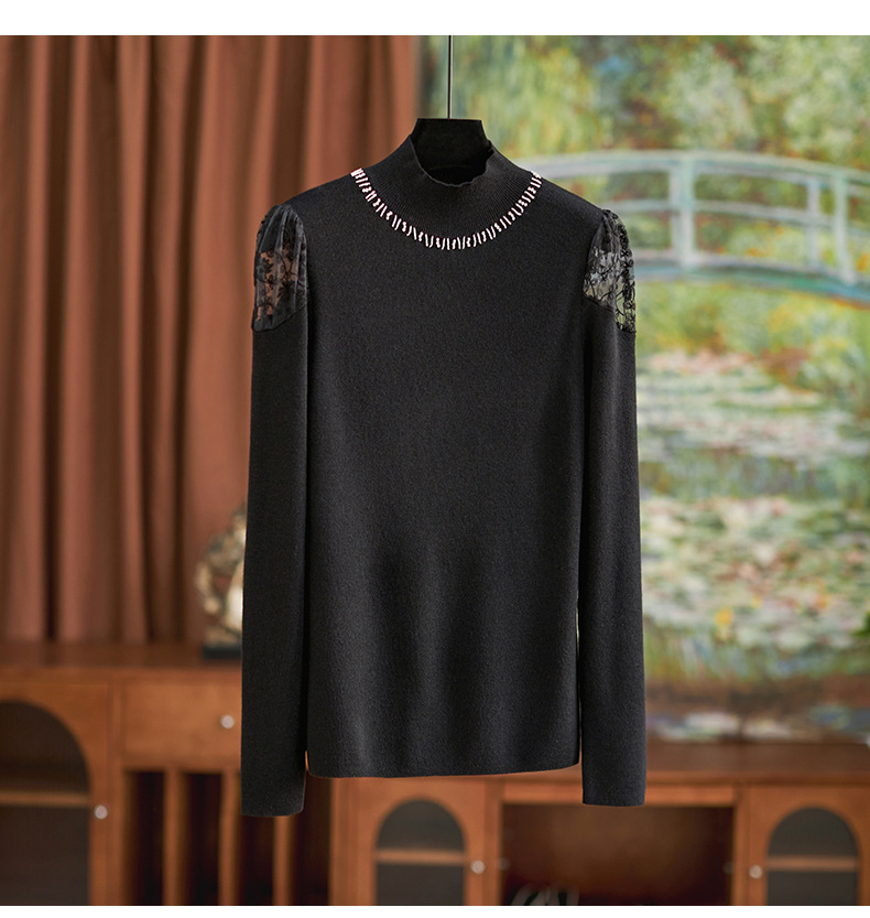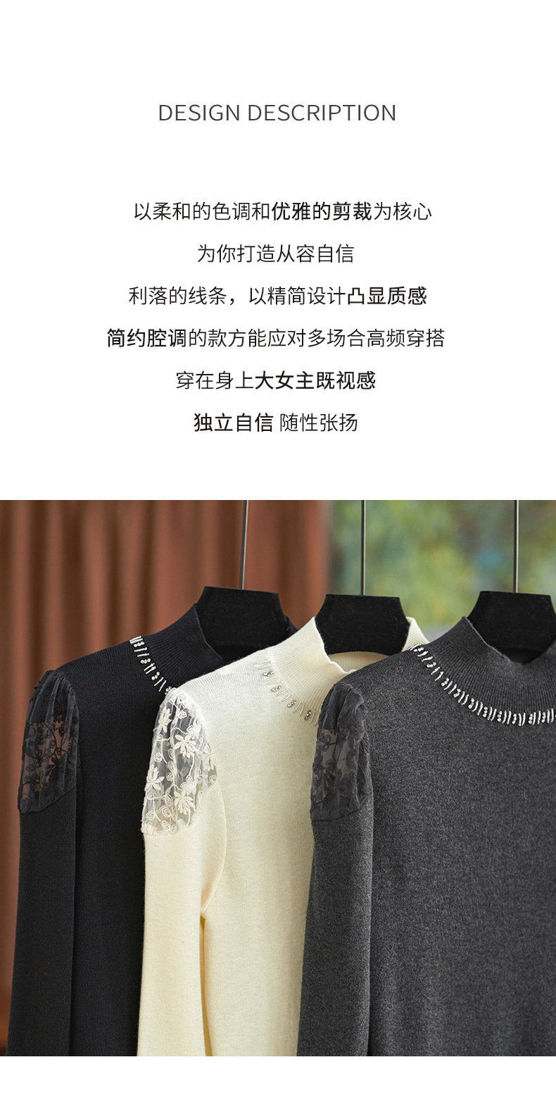 【高货wl】全新升级【铂金会员183/天猫249/差价66】(33510)洛诗琳通勤休闲时尚半高领钉珠镂空蕾丝刺绣针织打底衫