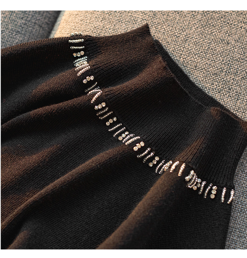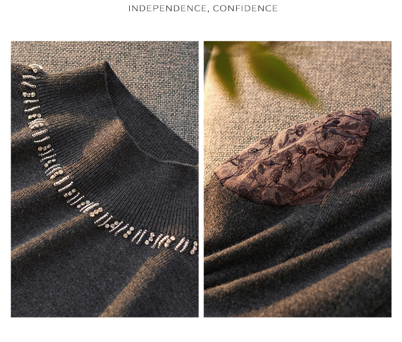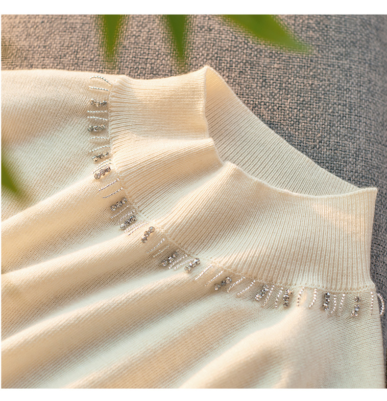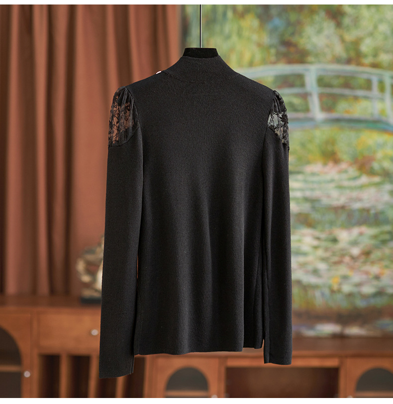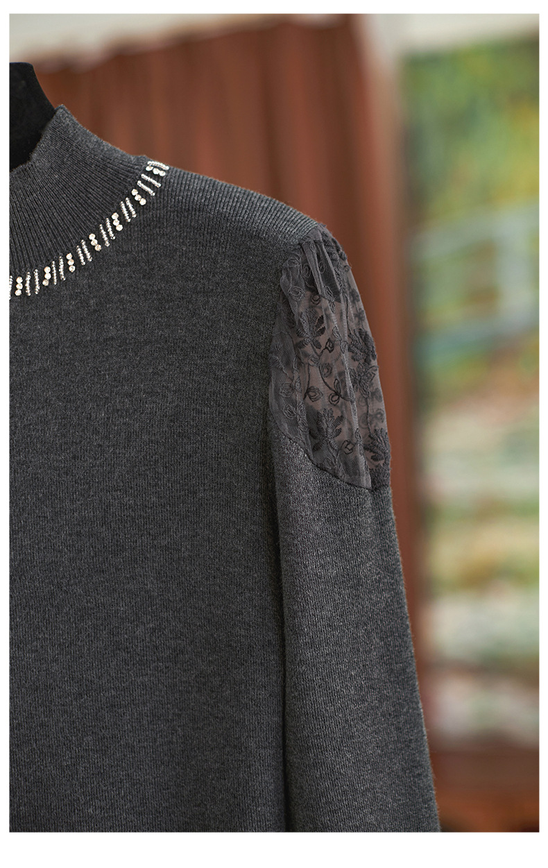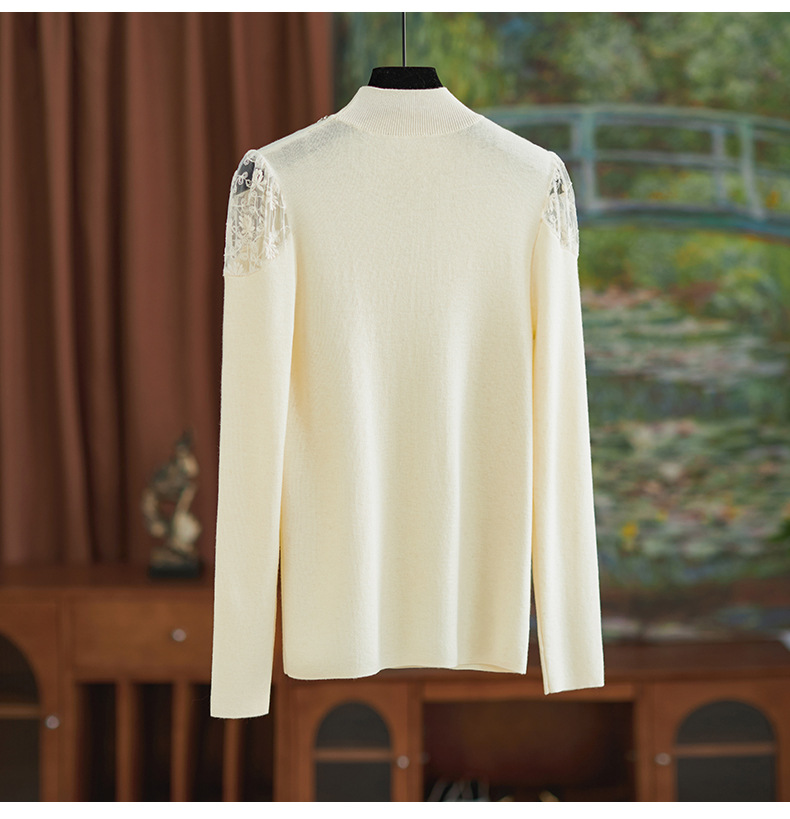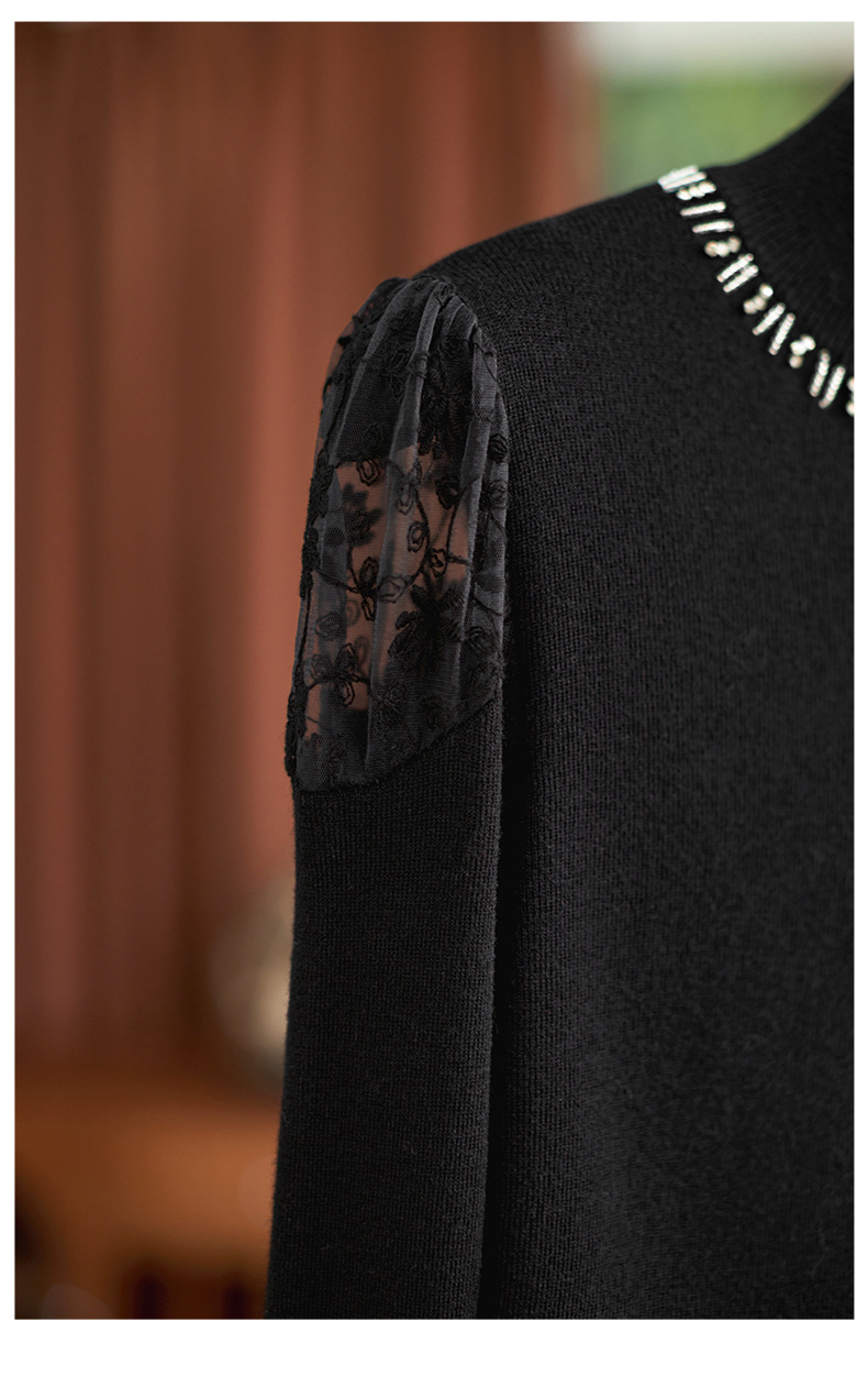 【高货wl】全新升级【铂金会员183/天猫249/差价66】(33510)洛诗琳通勤休闲时尚半高领钉珠镂空蕾丝刺绣针织打底衫