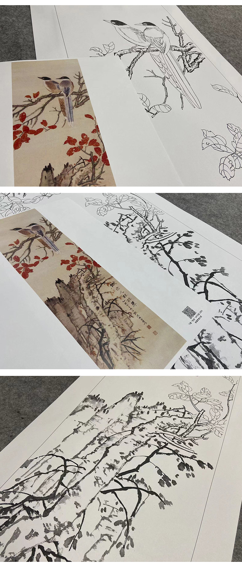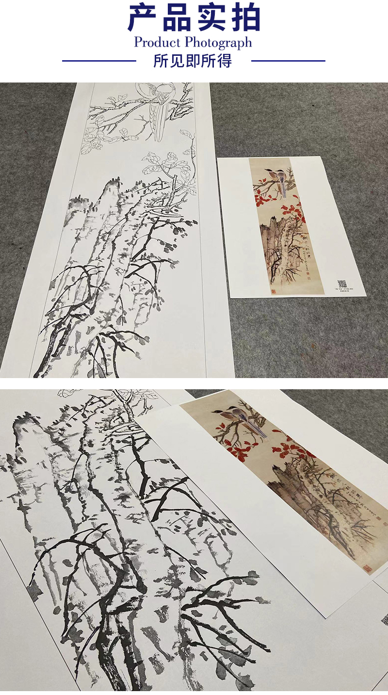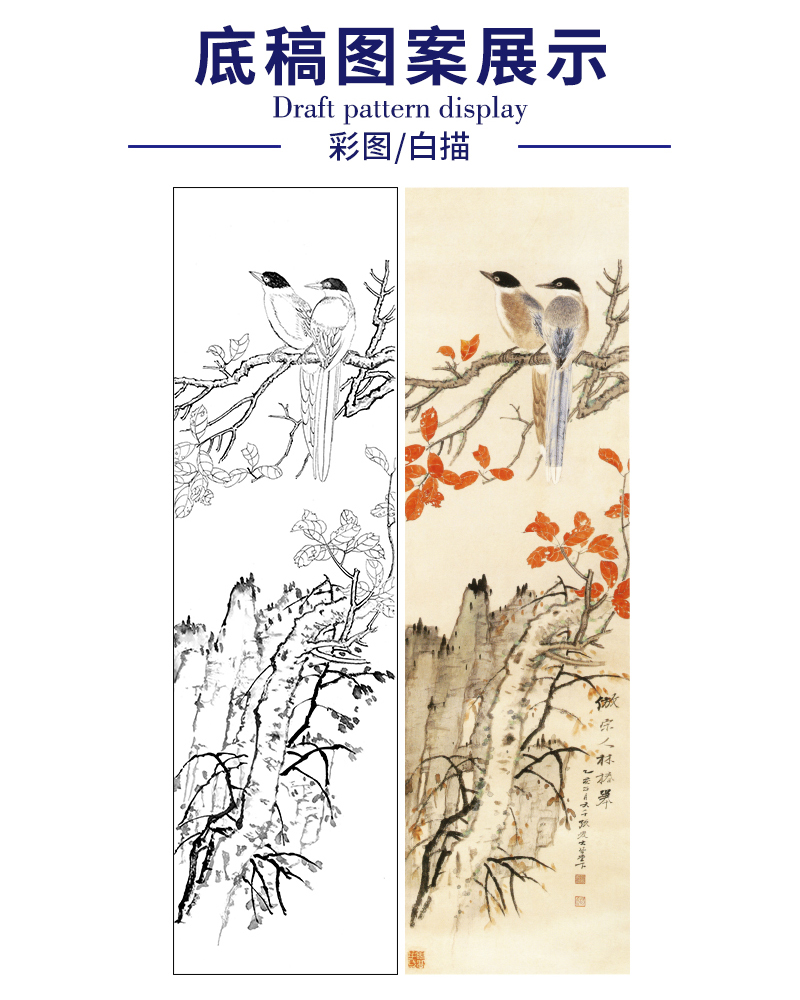 张大千竖幅工笔花鸟白描底稿-《红叶双栖》-多种白描尺寸可选-QD34