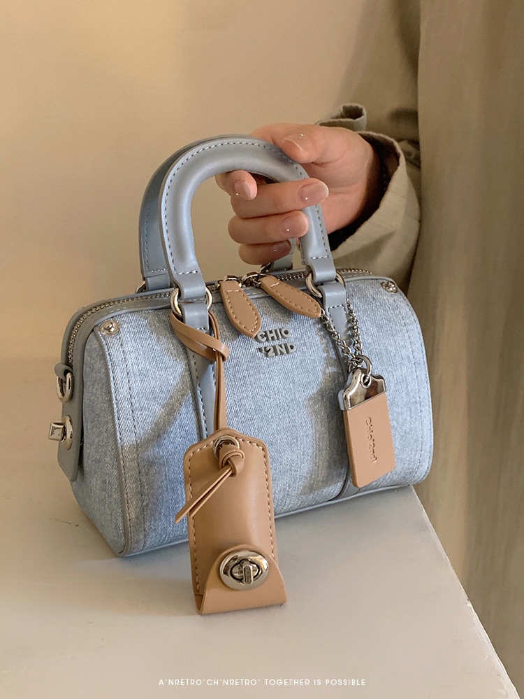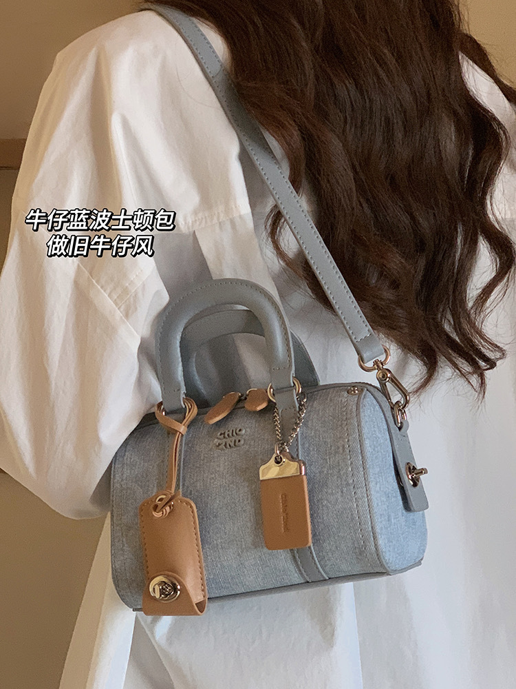 【做旧牛仔风,牛仔蓝波士顿包!】铂蓝海域枕头包包 女士新款百搭手提包 单肩斜挎包-QQ