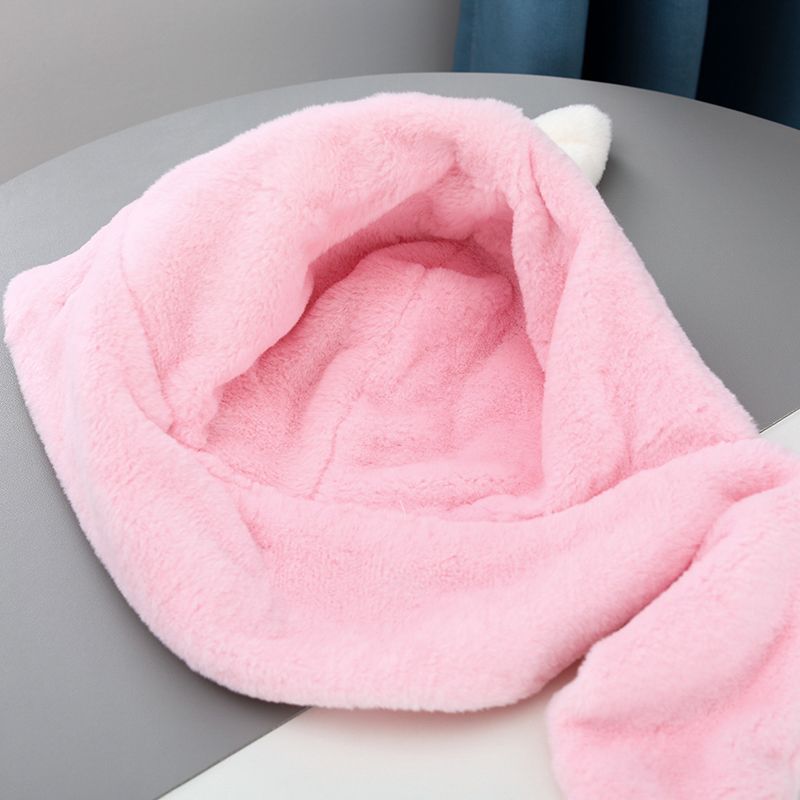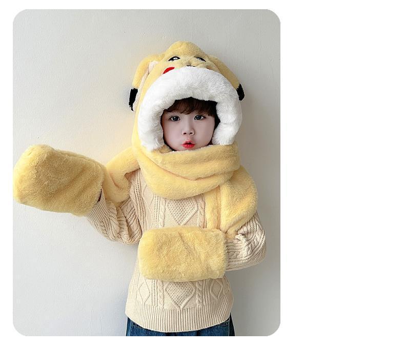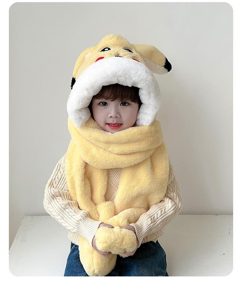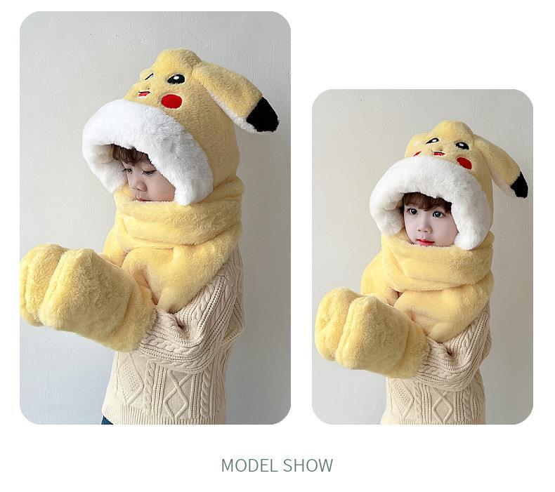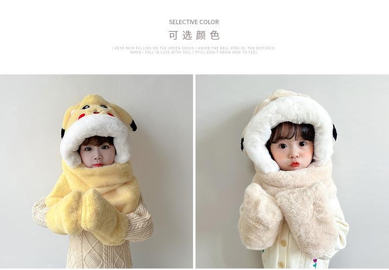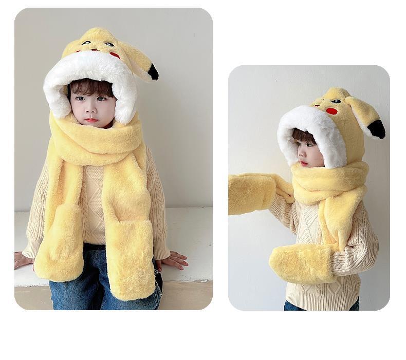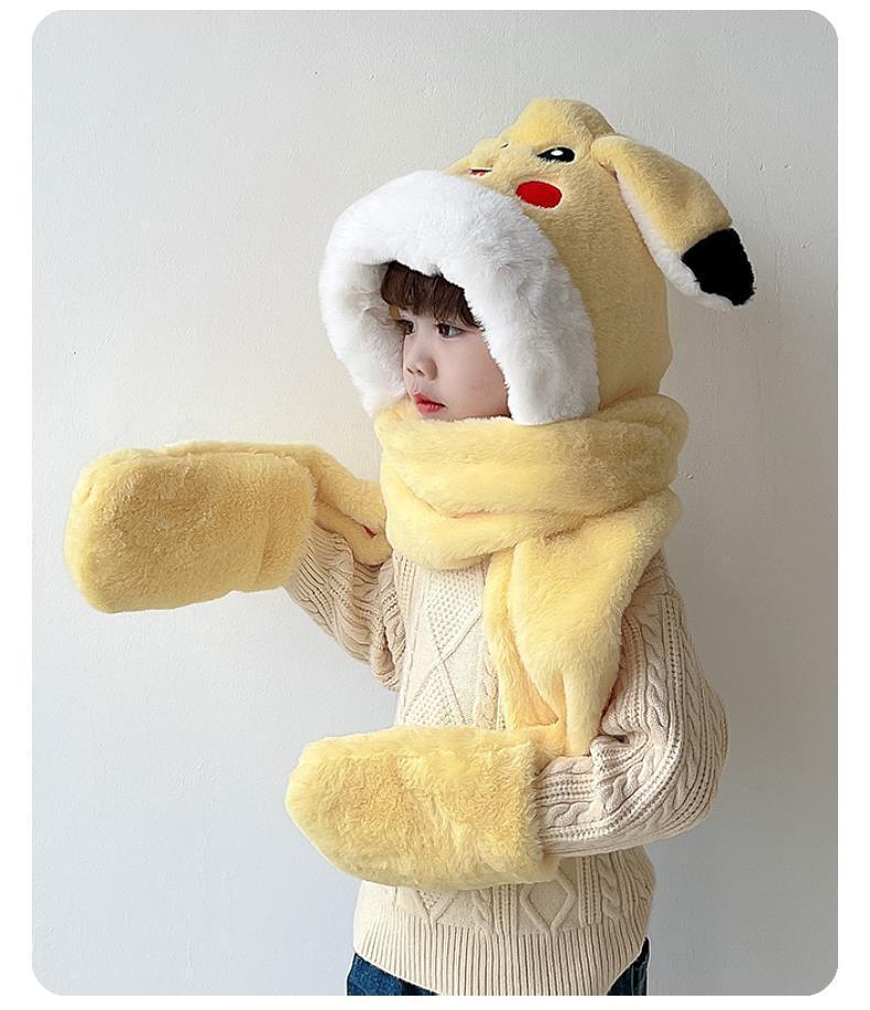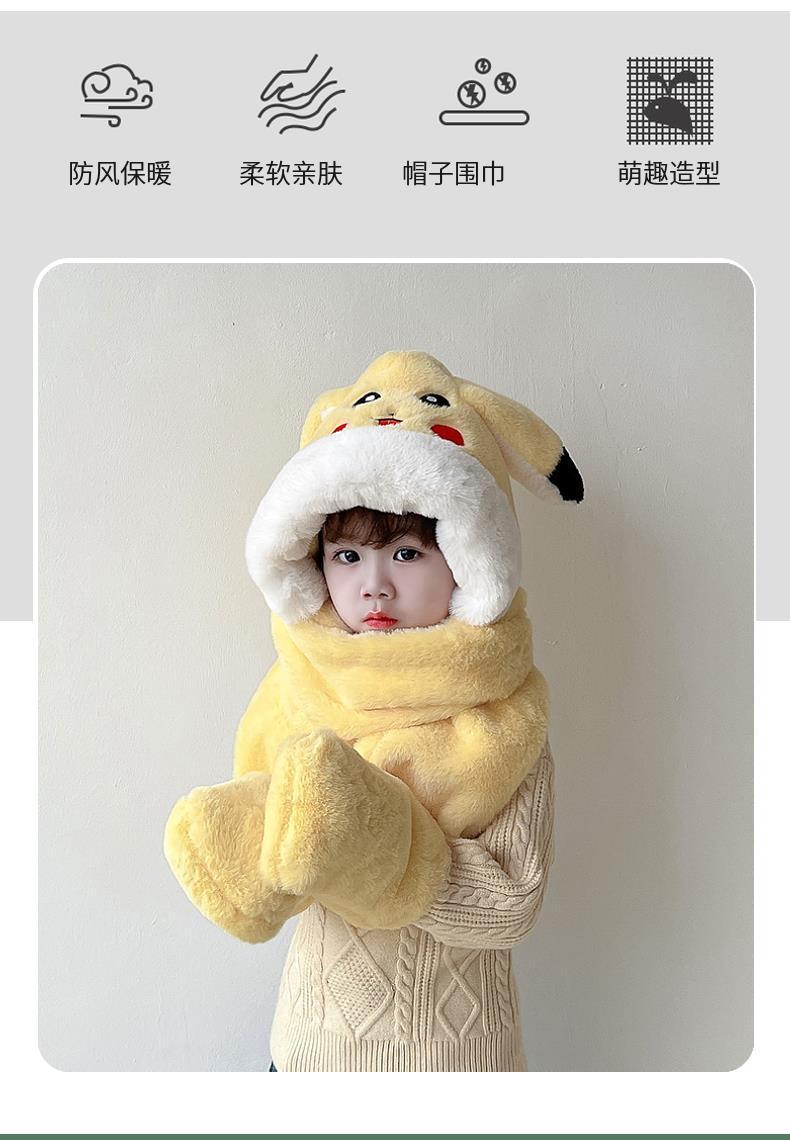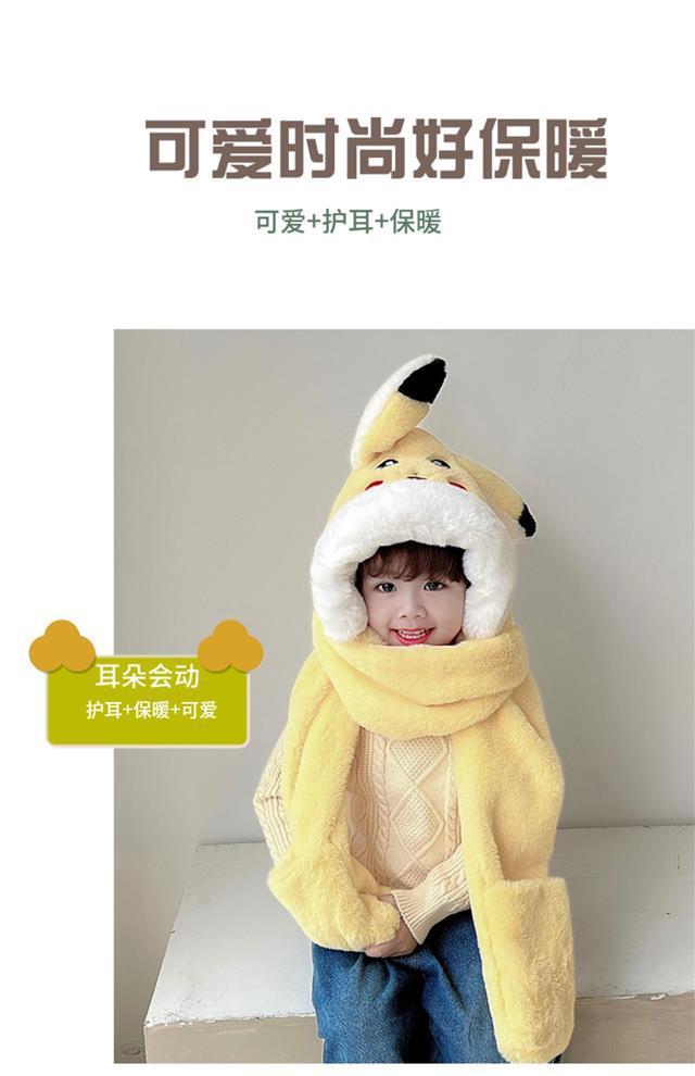【耳朵会动,保暖冬季帽子】皮卡丘可爱帽子围巾一体 秋冬女耳朵会动连帽围脖 保暖三件套亲子款-QQ