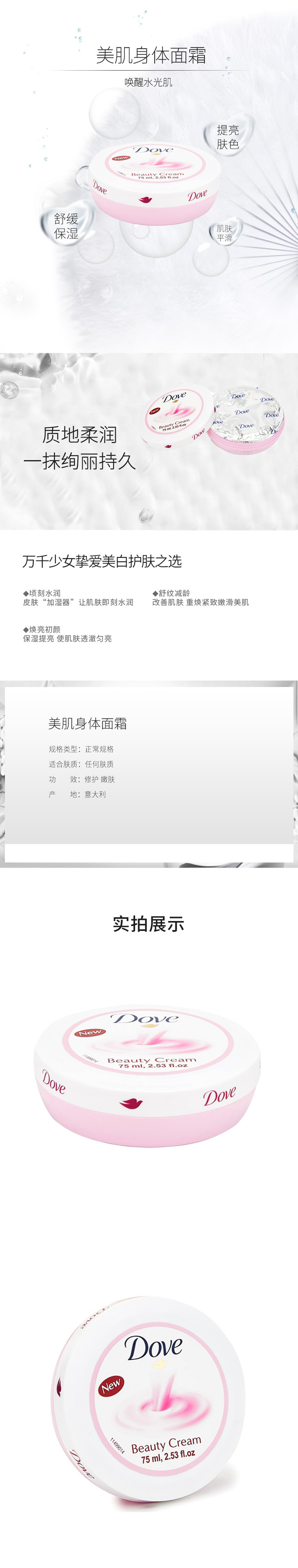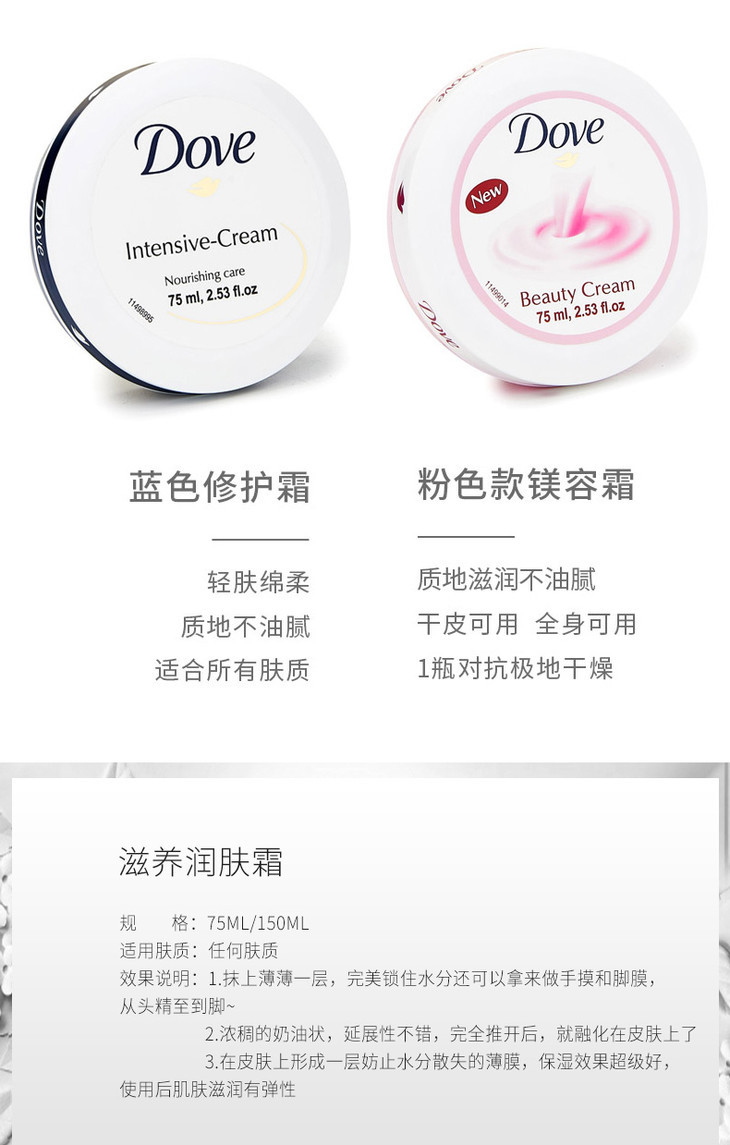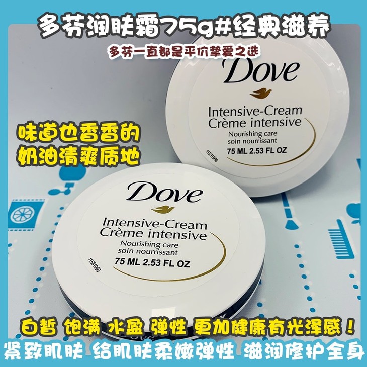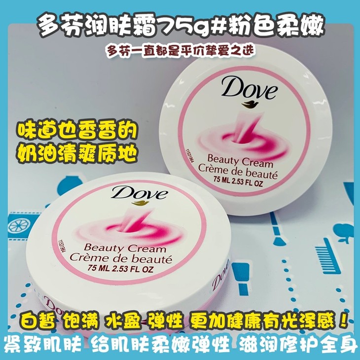 多芬润肤霜75g#粉色柔嫩/#经典滋养👍多芬一直都是平价挚爱之选😍,润肤霜主打丝滑保湿💦,味道也香香的🌬,奶油清爽质地☁,吸收也不错哦~可以帮助舒缓干燥肌肤🍂,紧致肌肤,给肌肤柔嫩弹性⬆。滋润修护全身,令肌肤变得肌肤白皙✨,饱满,水盈,弹性,更加健康有光泽感!不仅秋冬🍁,一年四季也可以使用的哦😜~#粉色柔嫩款,侧重滋润保湿哦/#经典滋养款,在美白靓肤效果上upupup!