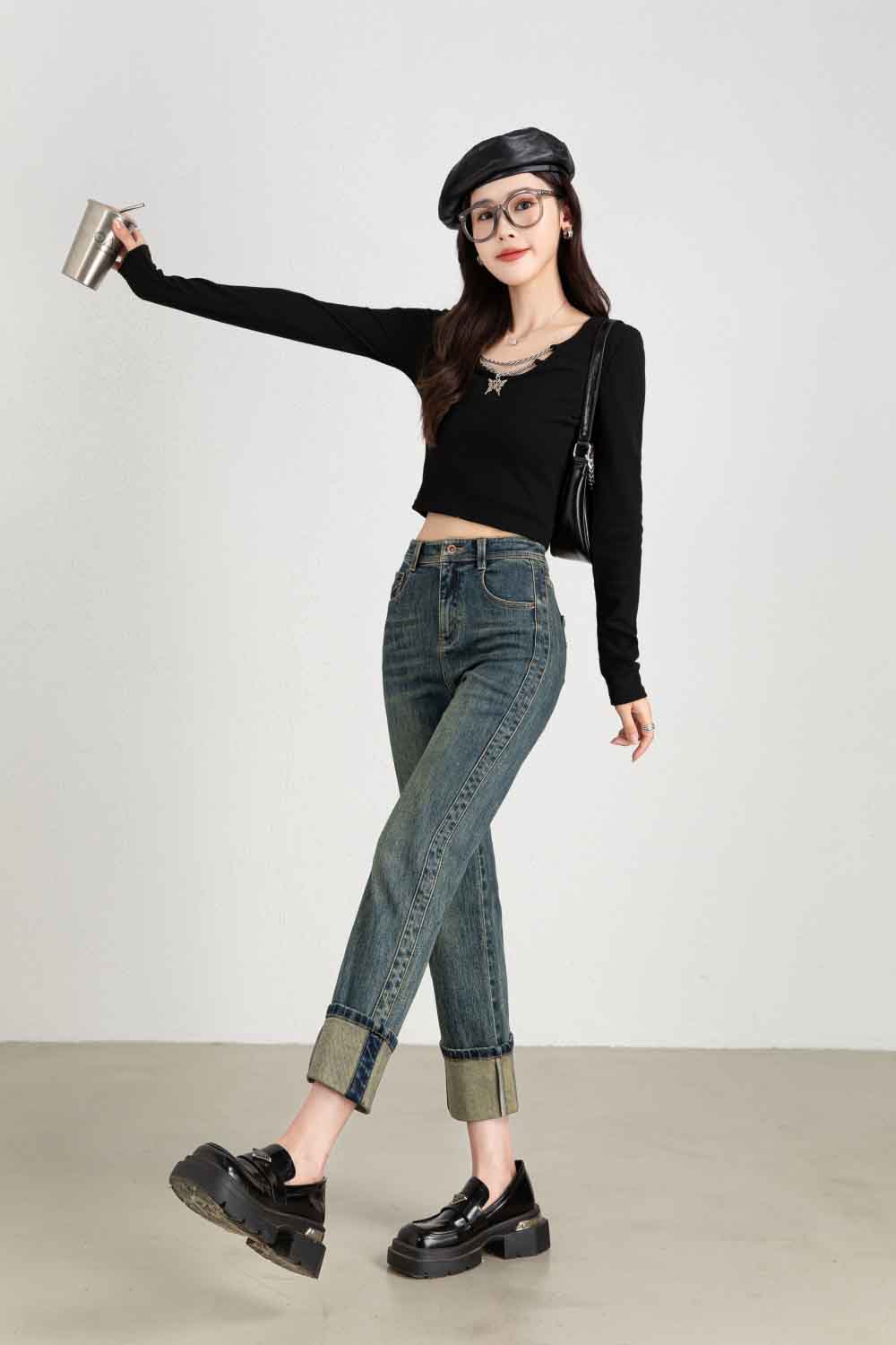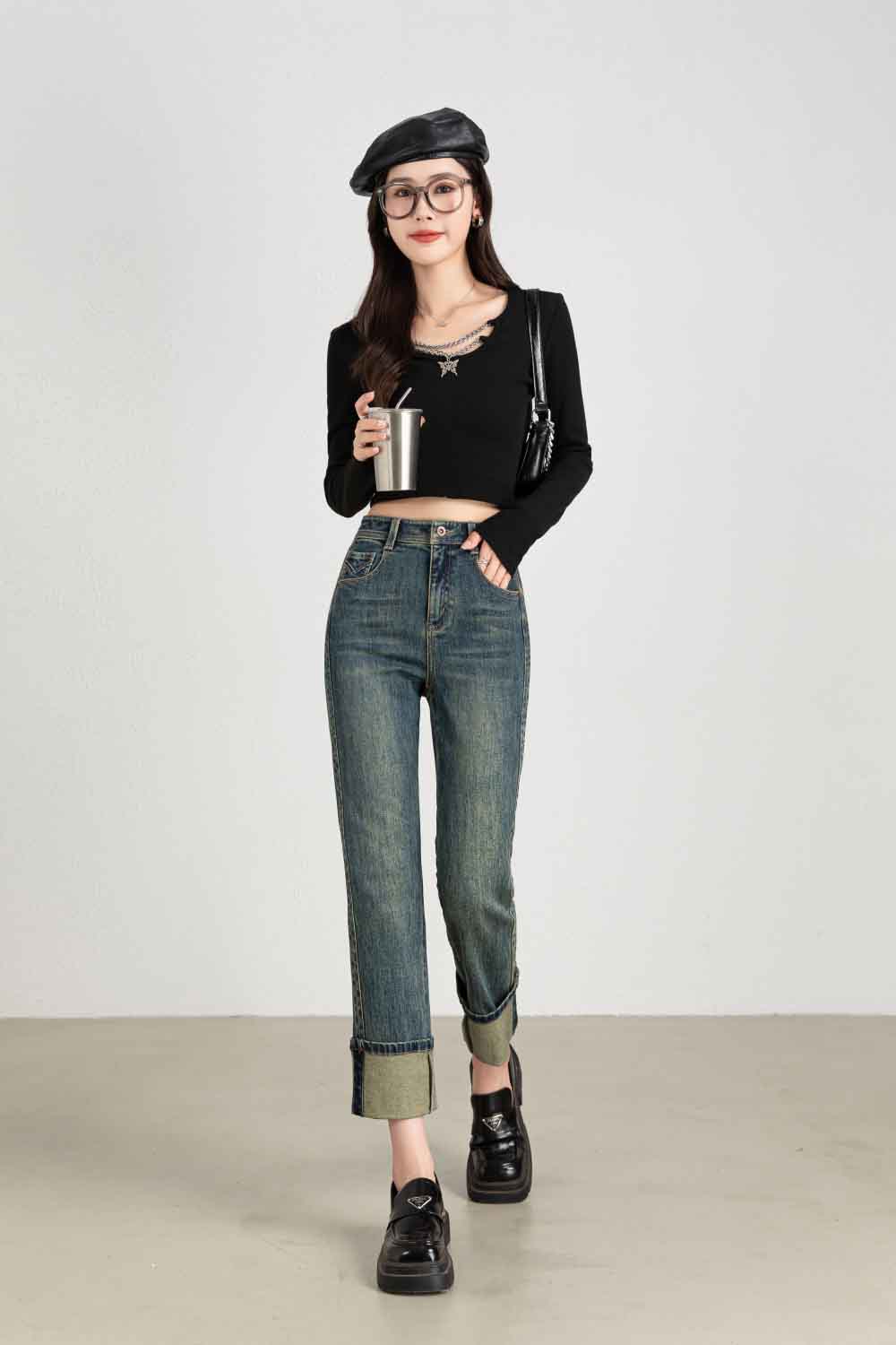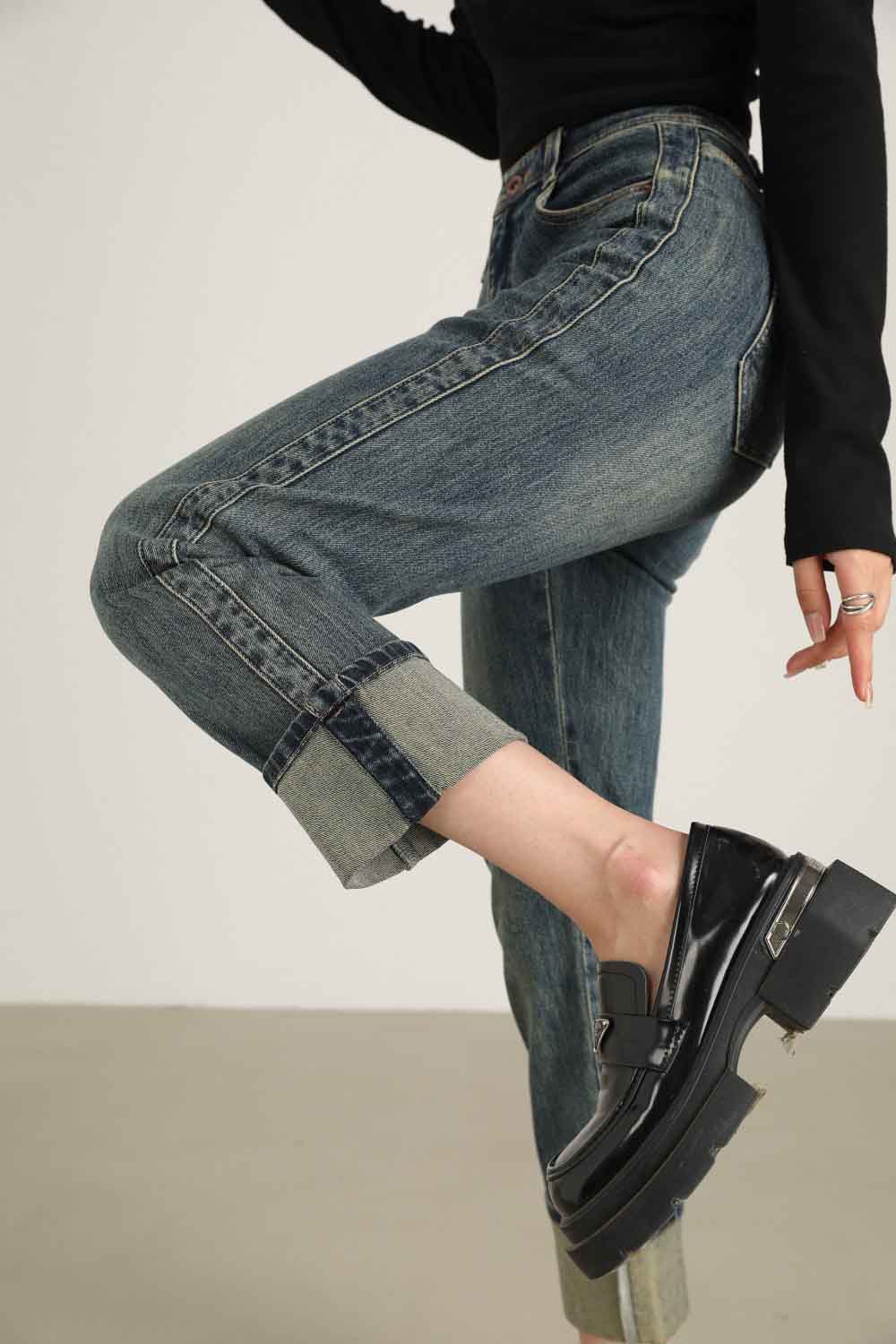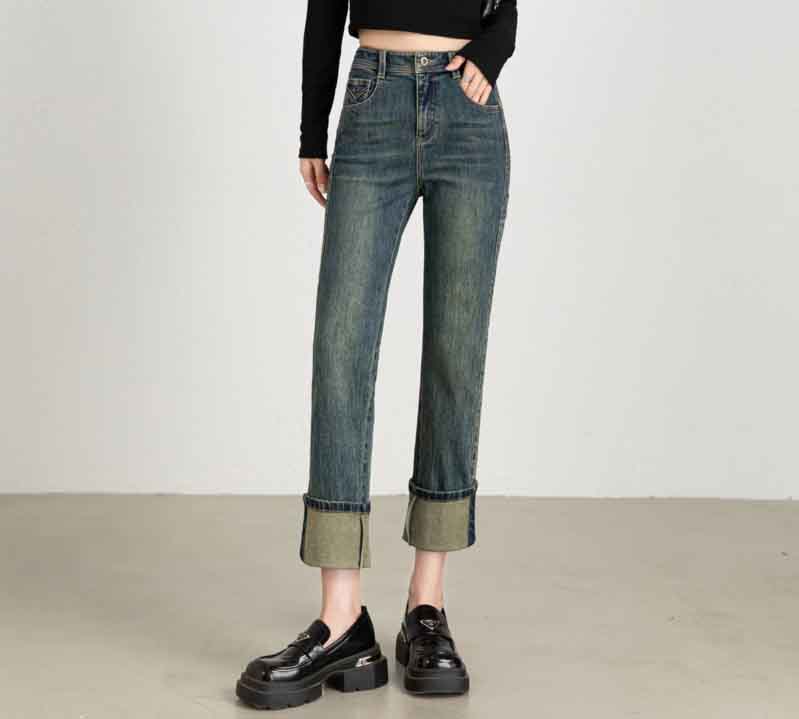 【顺丰包邮】13132 洛诗琳秋冬复古感卷边高腰直筒牛仔裤女1022A
