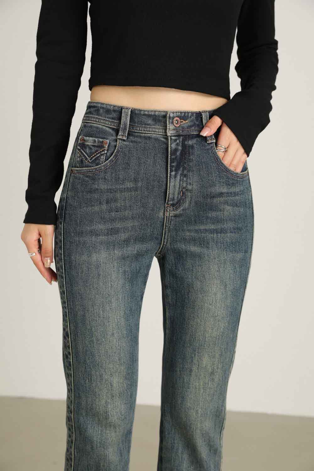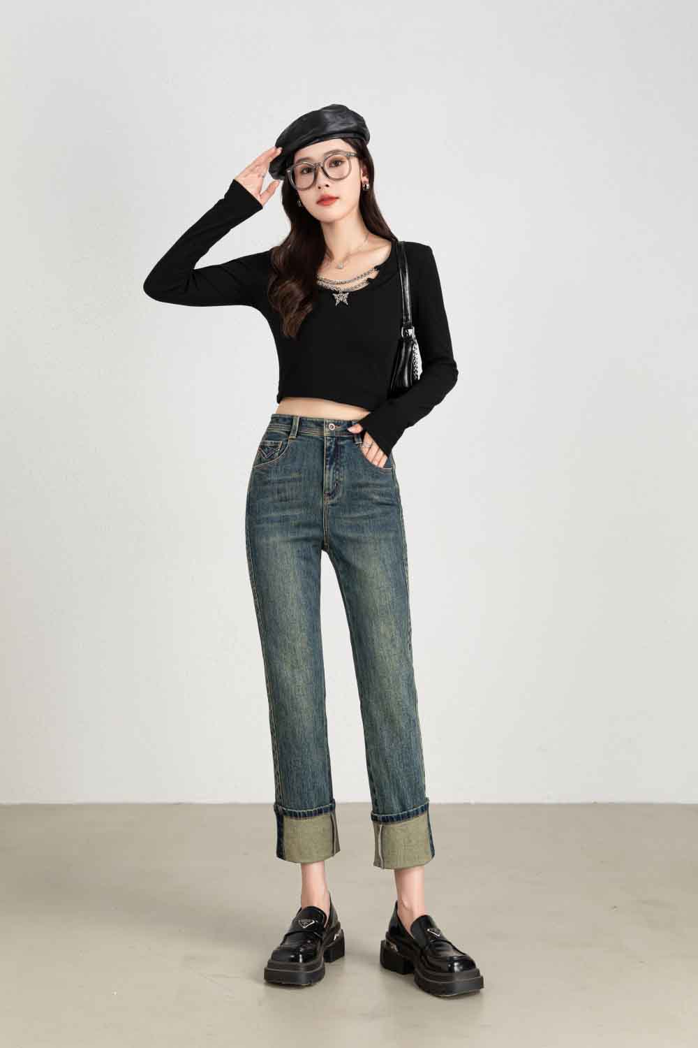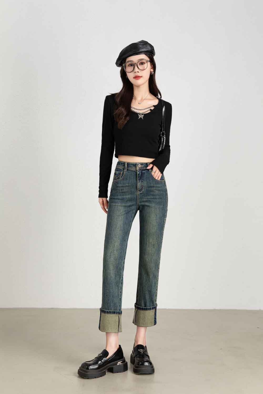 【顺丰包邮】13132 洛诗琳秋冬复古感卷边高腰直筒牛仔裤女1022A