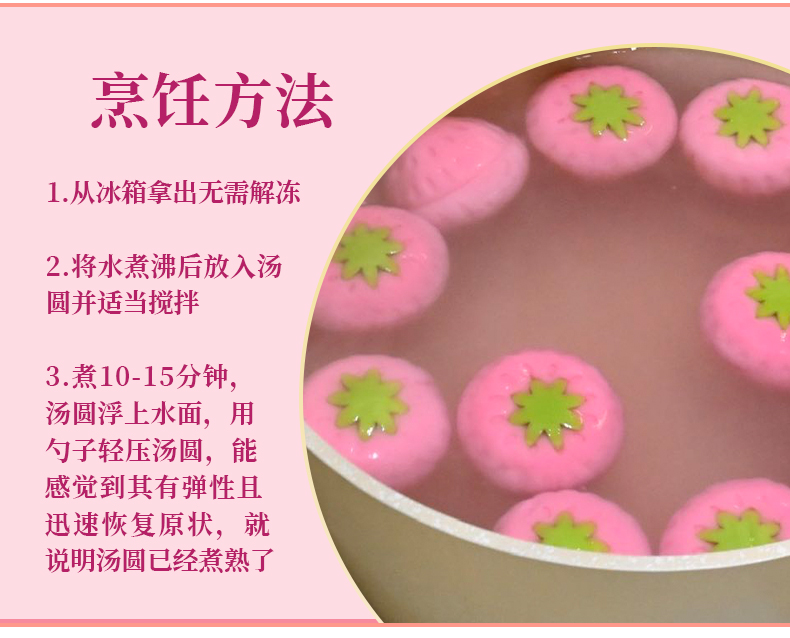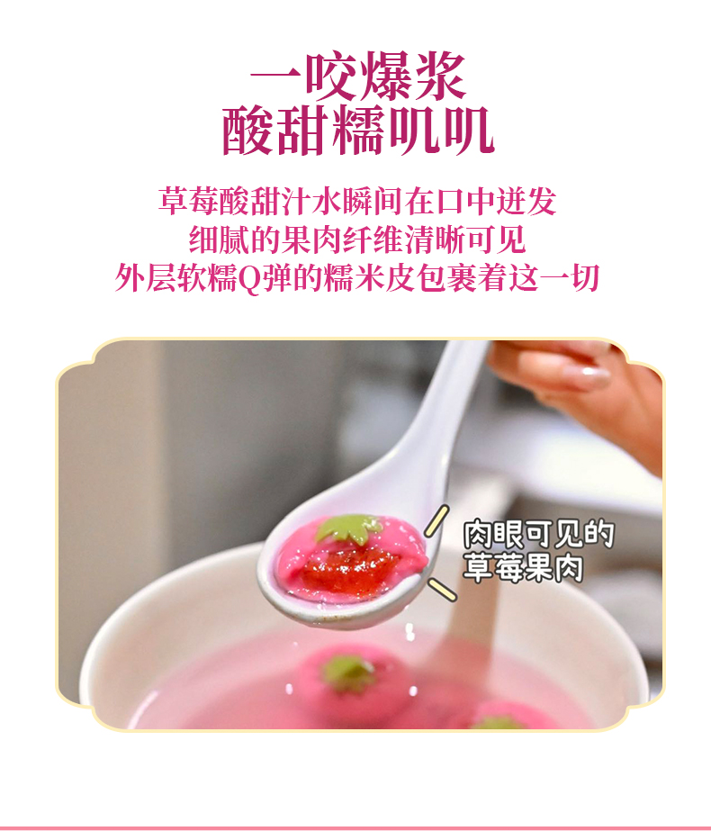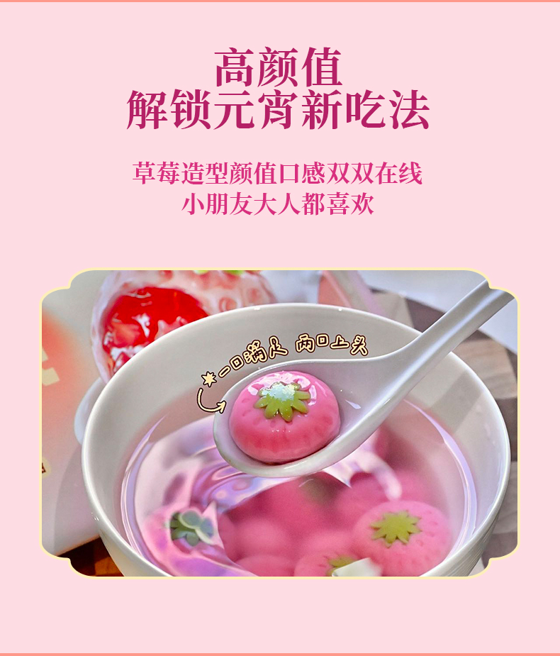 【斌哥优选】草莓汤圆。颜值口感双在线。天然果蔬汁调色,草莓果肉≥50%,清爽不。元宵节上桌,最吸睛的一碗。