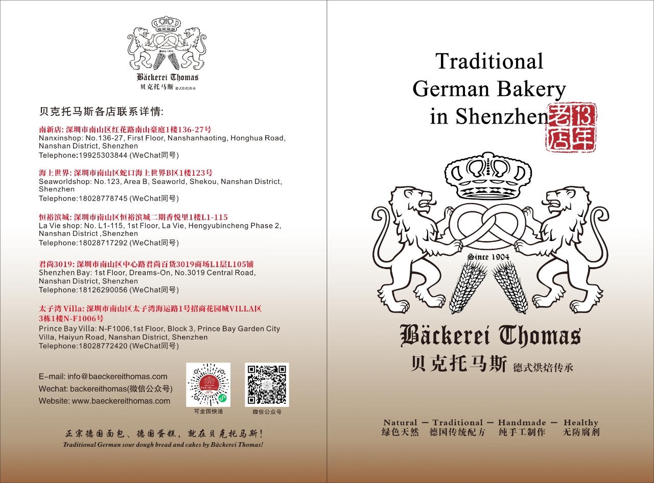 - 贝克托马斯于1904年成立于法兰克福;2012年传到深圳,现有5家实体门店;德国大师坚持以德国传统配方和工艺手工新鲜制作,健康,天然,无添加,用真心烘焙!贝克托马斯一有历史有故事真材实料值得信赖!