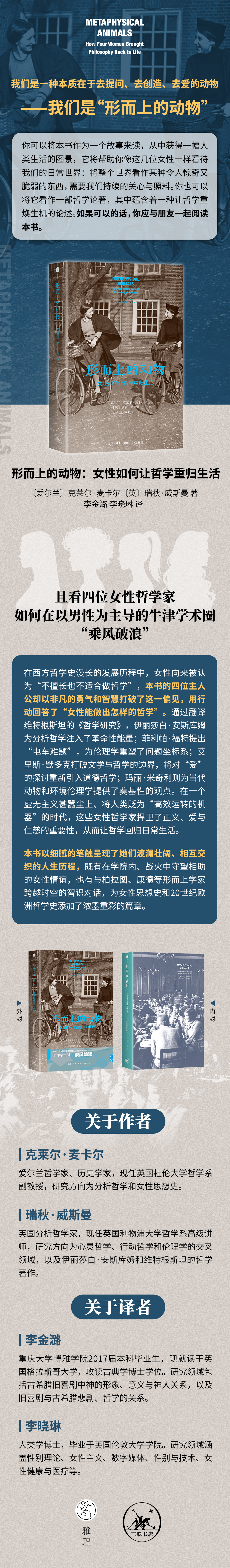 本书以四位在当代道德哲学领域做出突出贡献的女性哲学家为书写对象,以“人是形而上的动物”这一重建战后道德秩序的论点为主旨,以第二次世界大战期间牛津形而上学家与信奉逻辑实证主义的反形而上学家的论争为背景,按照时间顺序系统且近乎全面地呈现了四位女性哲学家的求学经历、战时的社会活动以及战后在道德哲学领域复兴形而上学的尝试。既有对“女性如何做哲学”等议题的探讨与回答,也以细腻且宏阔的笔触勾勒了一幅精妙绝伦的20世纪哲学家群像,堪称20世纪欧洲哲学的“人类的群星闪耀时”。